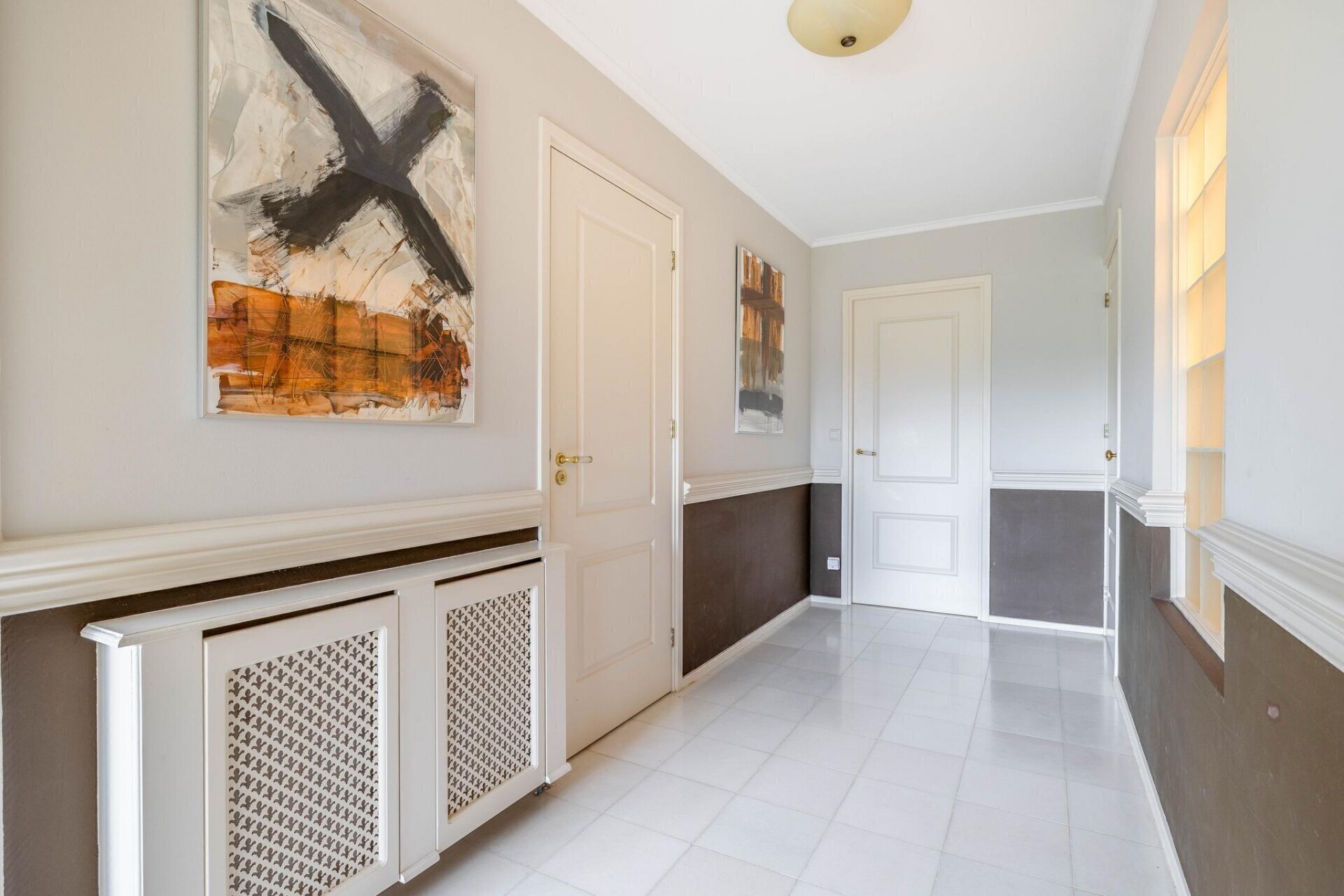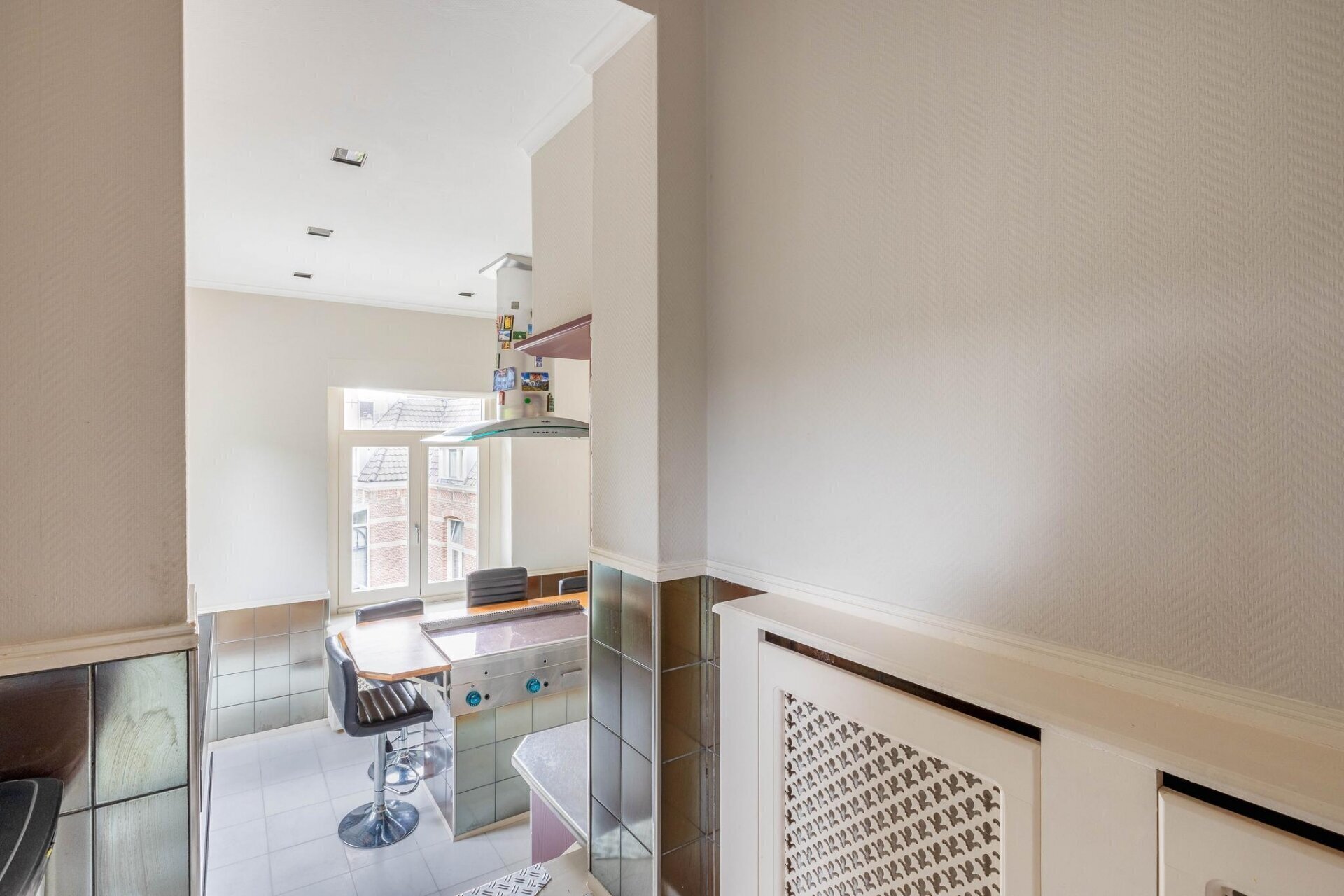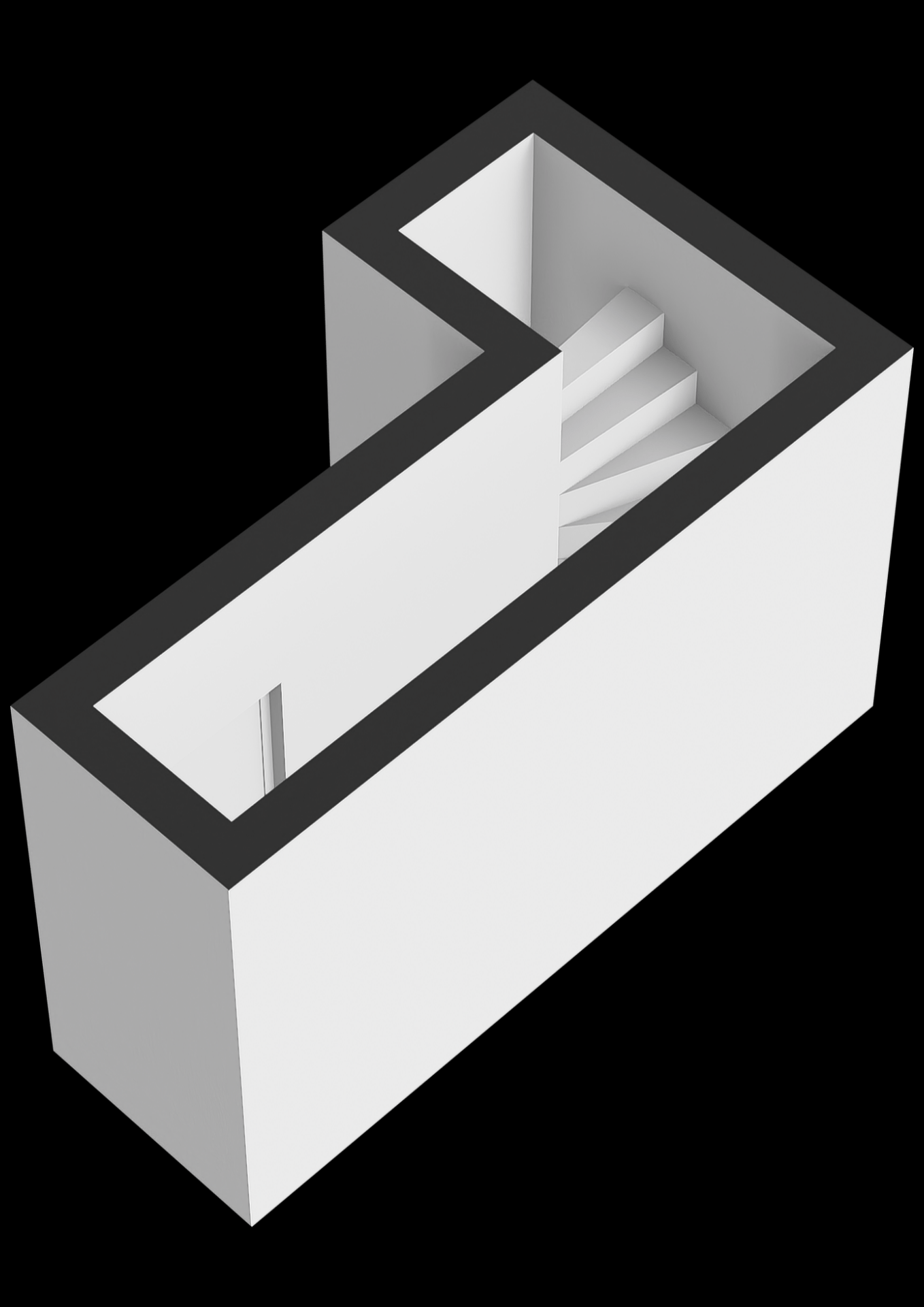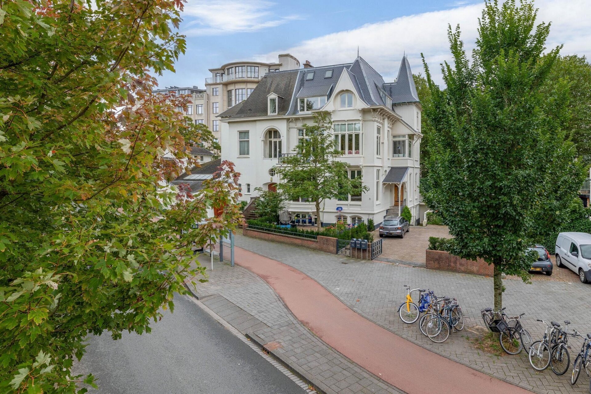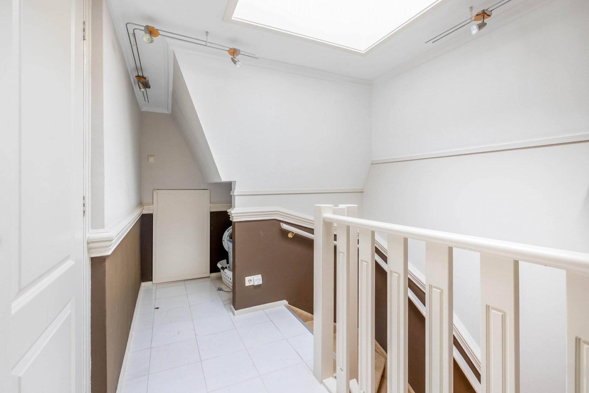 Oprit met privé-parkeerplaats. Trap naar de centrale hal. Trap naar de derde verdieping.
