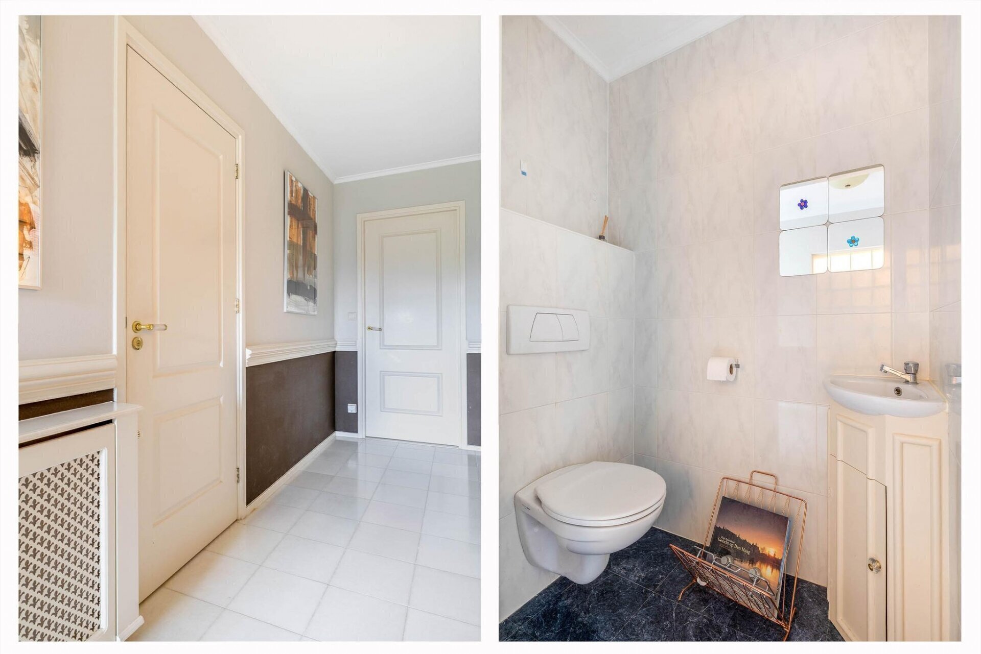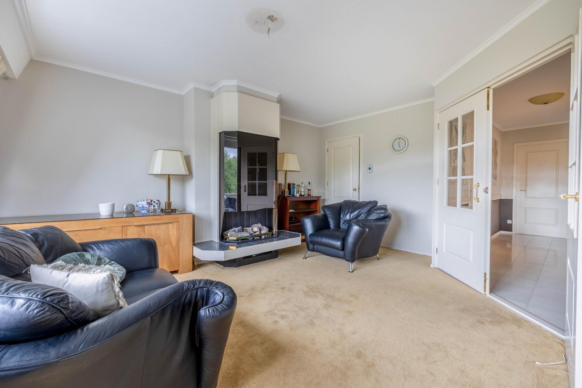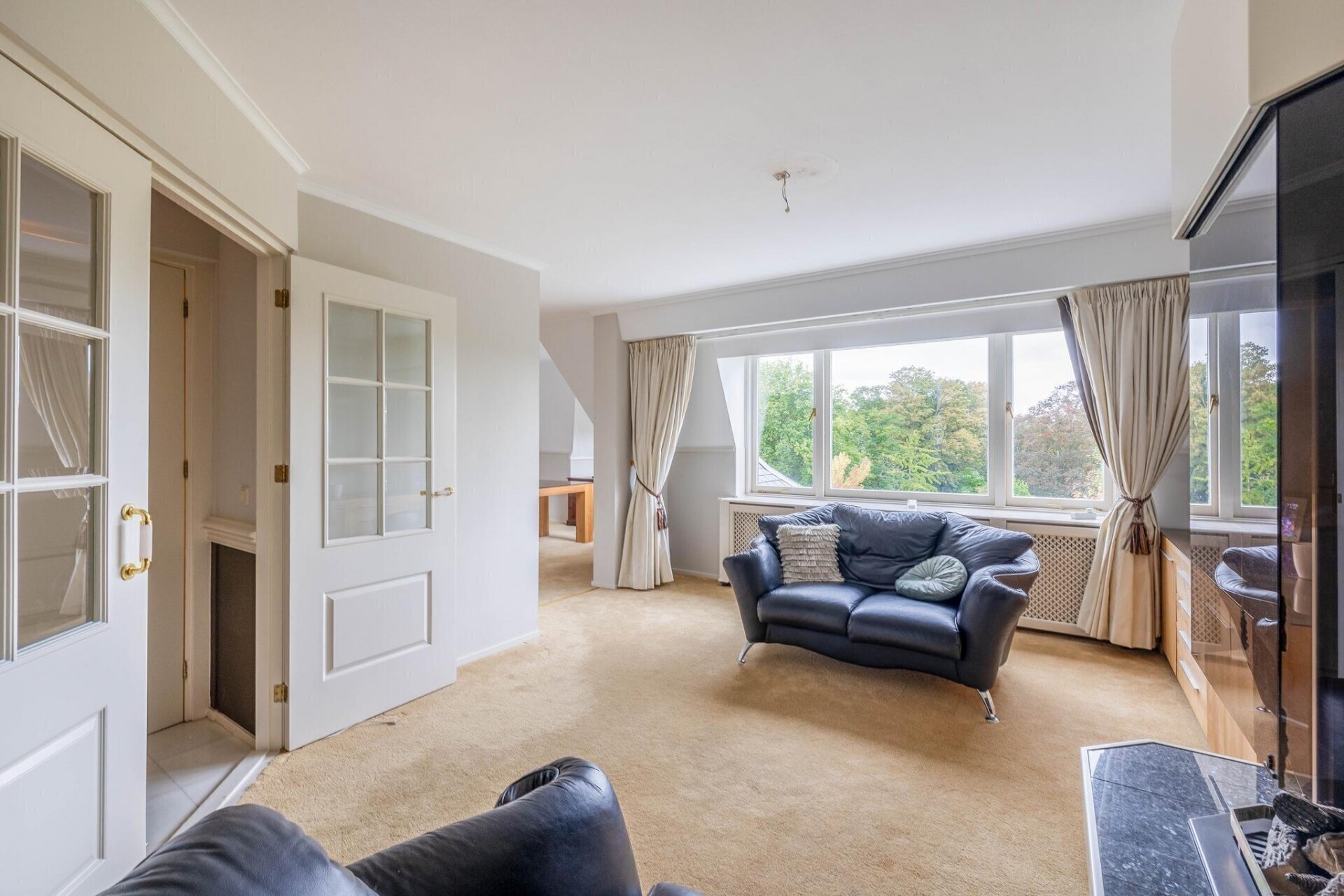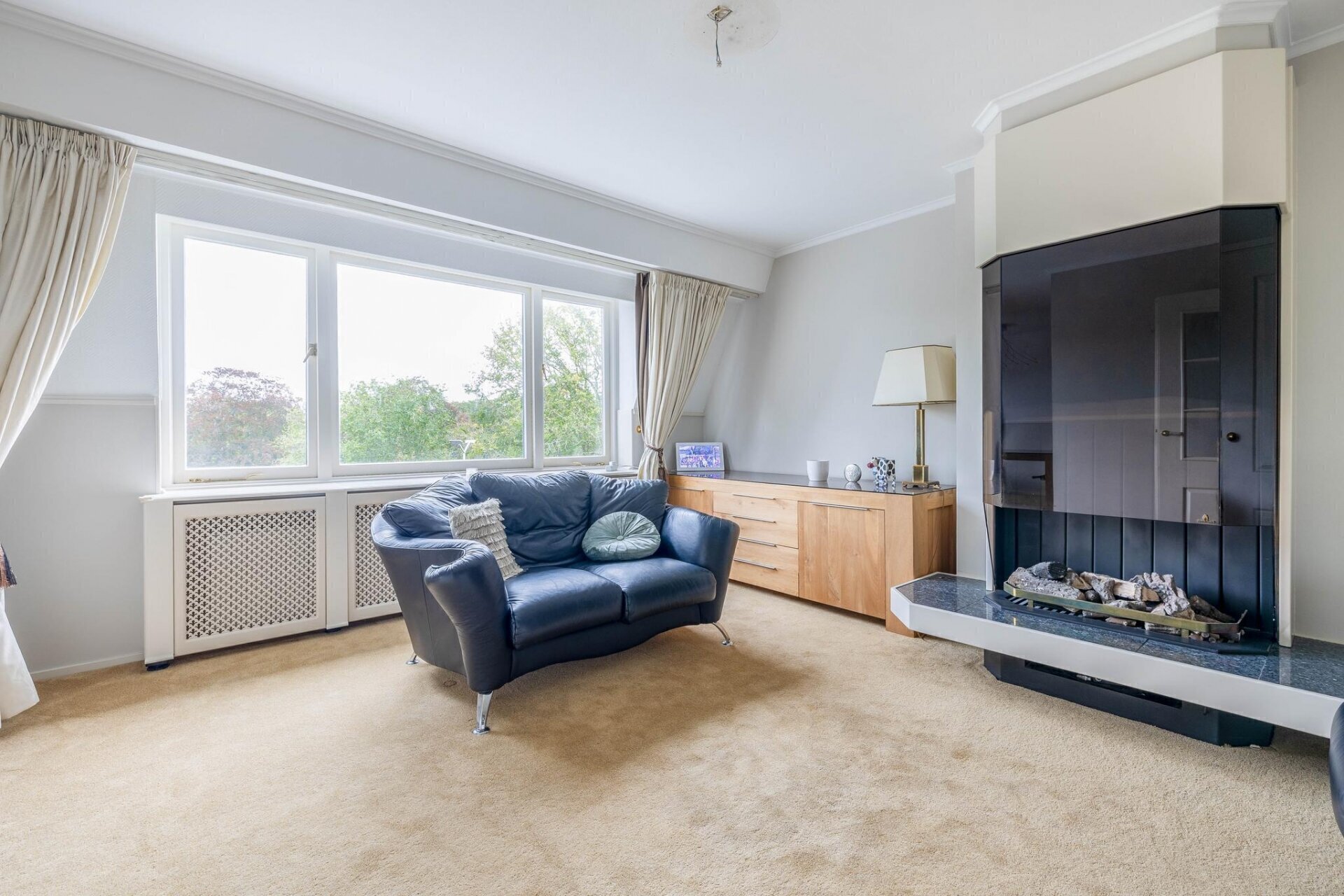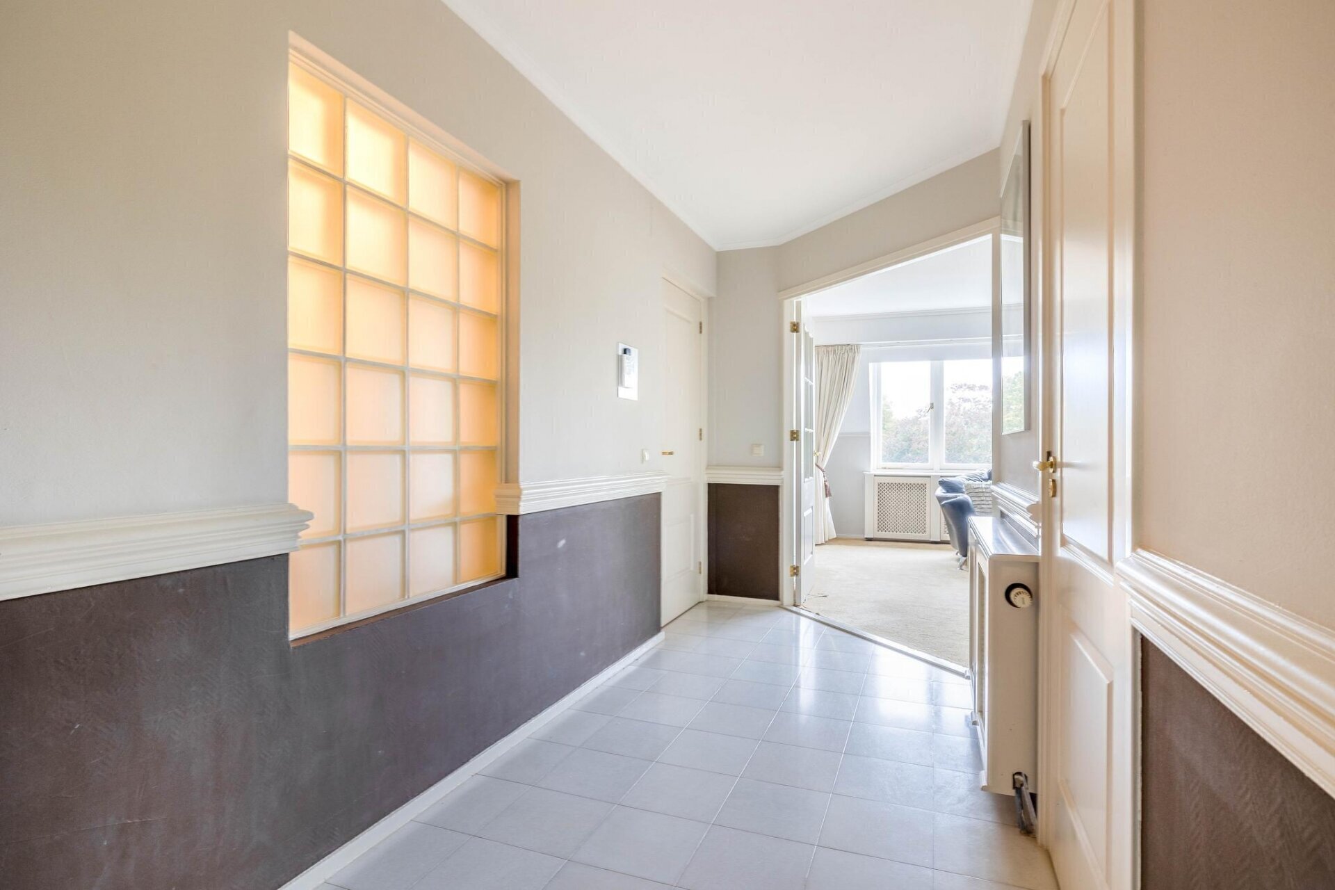 Entree van het appartement via een riante hal met garderobekast en gang met gastentoilet. Sfeervolle woonkamer heeft met een gashaard. Aangrenzend aan de woonkamer bevindt zich de eetkamer met prachtig uitzicht over de vijver en het park.