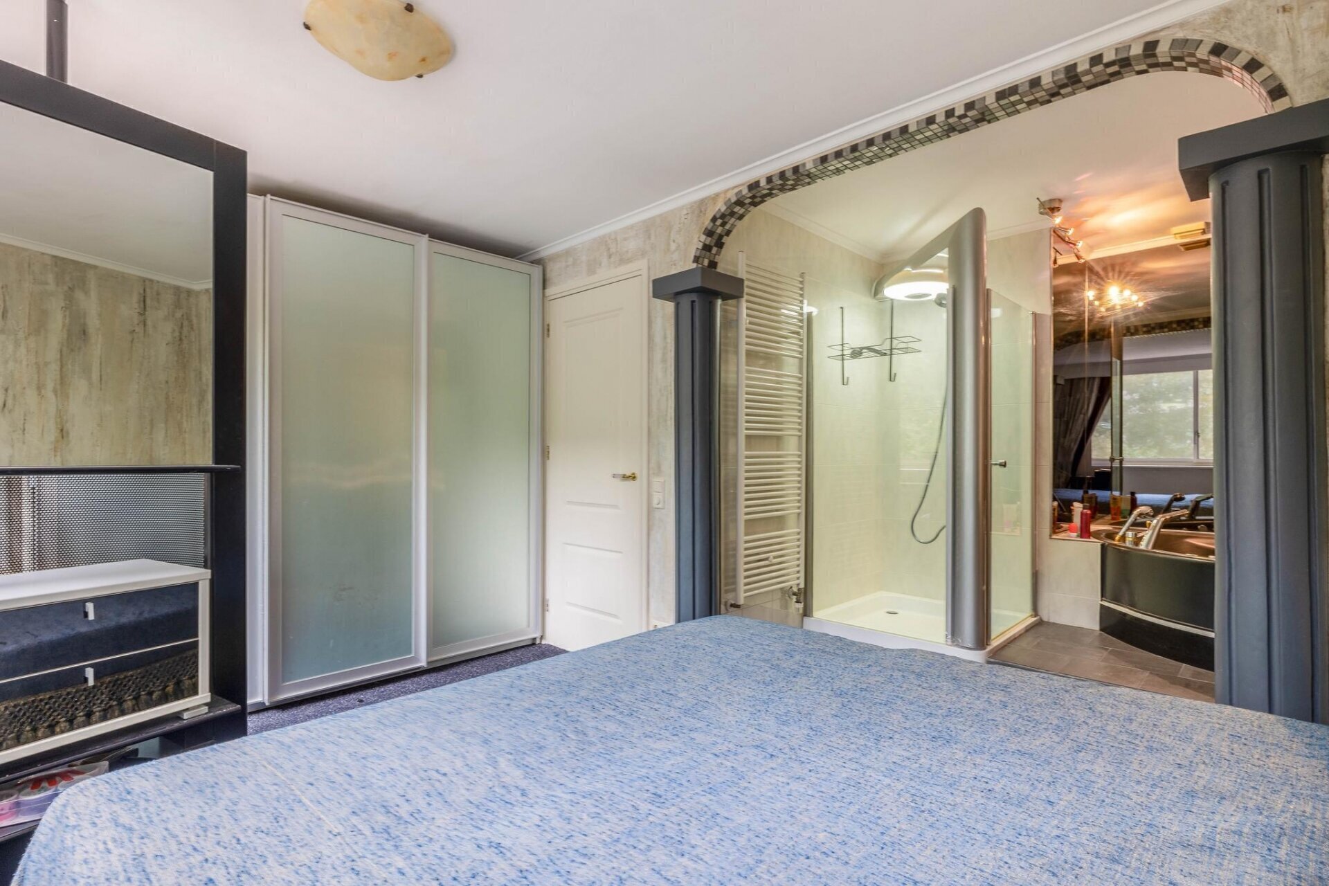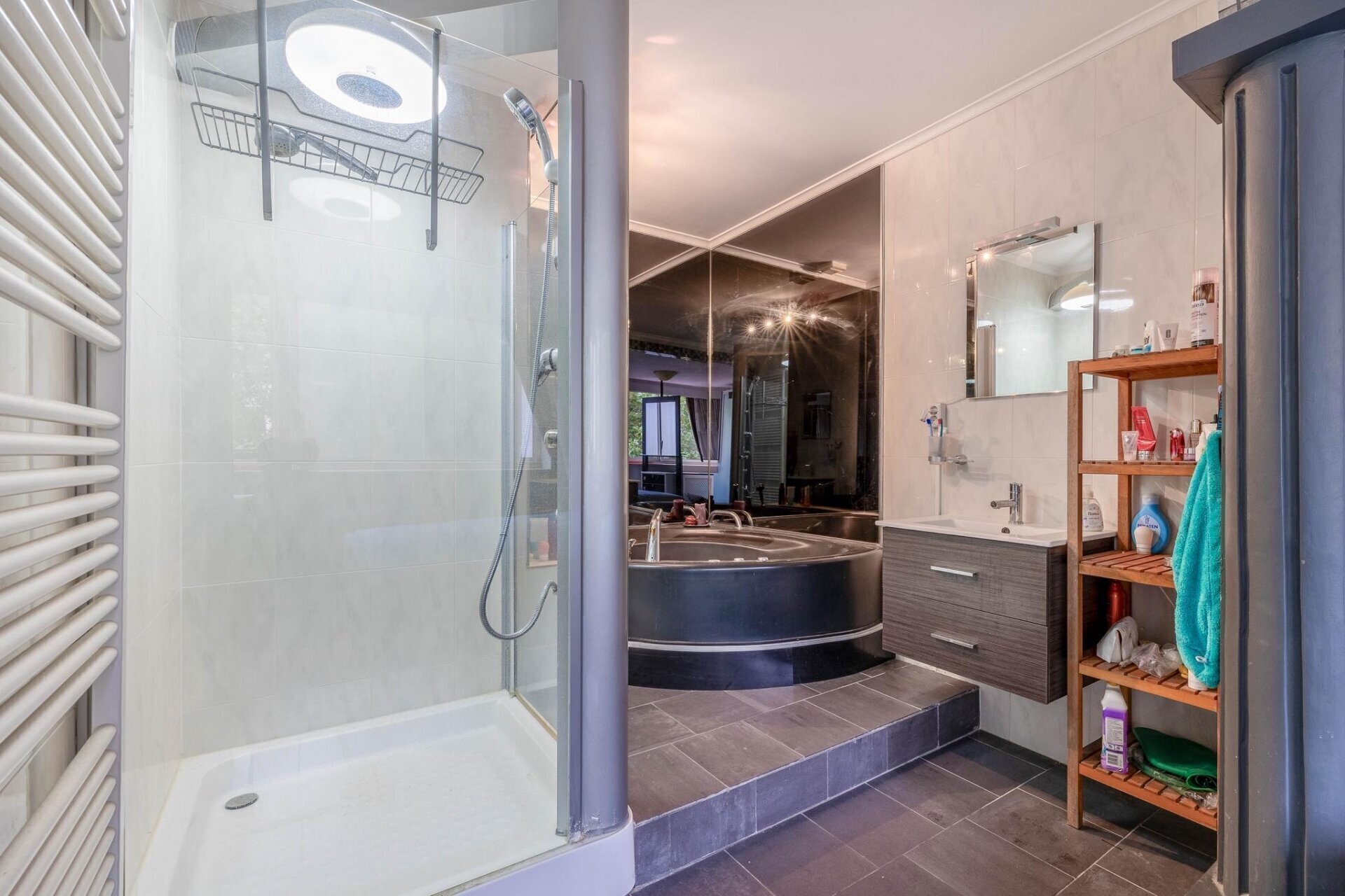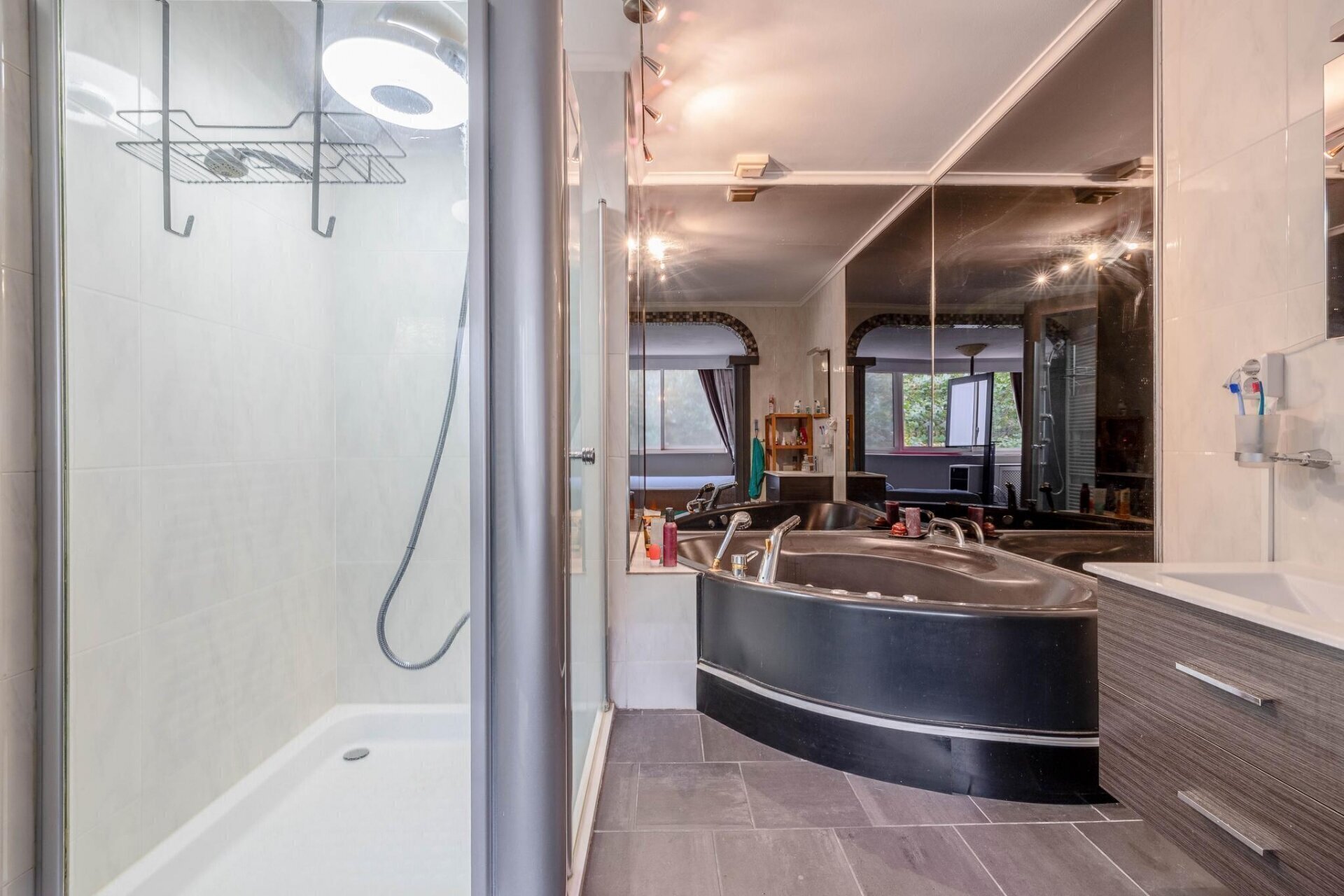 Aan de achterzijde van deze verdieping bevindt zich de master-bedroom met open badkamer met hoekbad met Whirlpool, douche en wastafelmeubel.