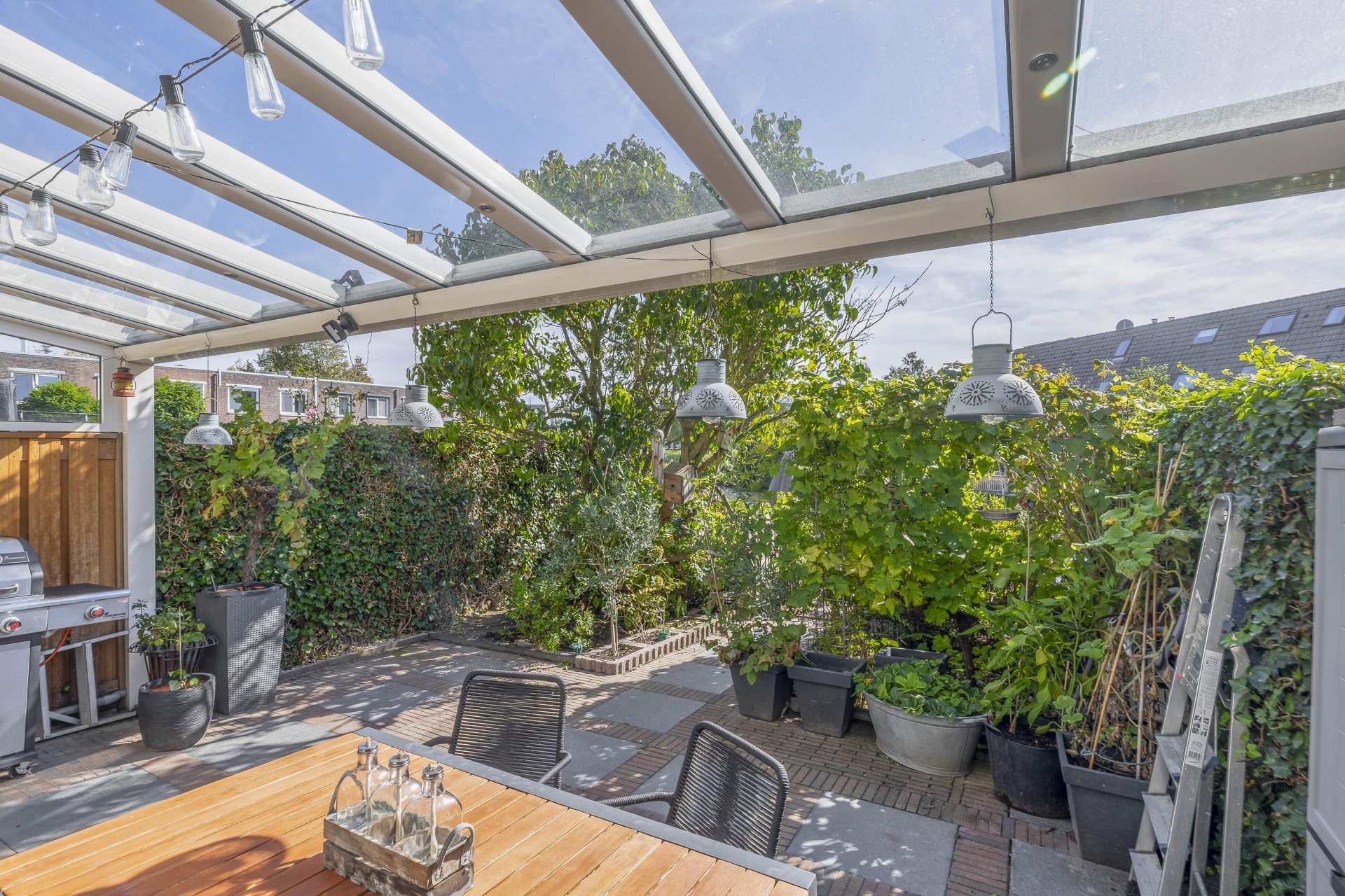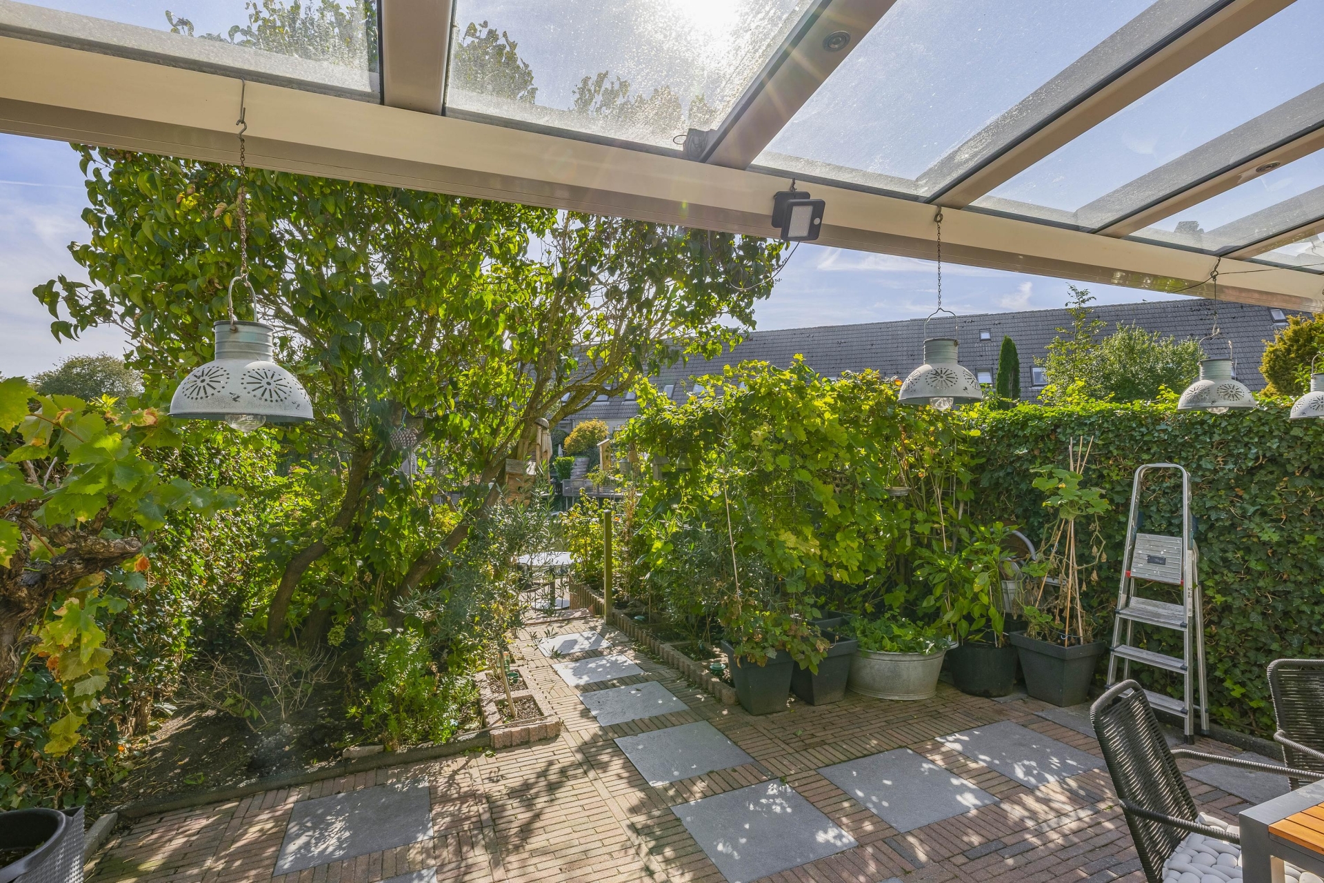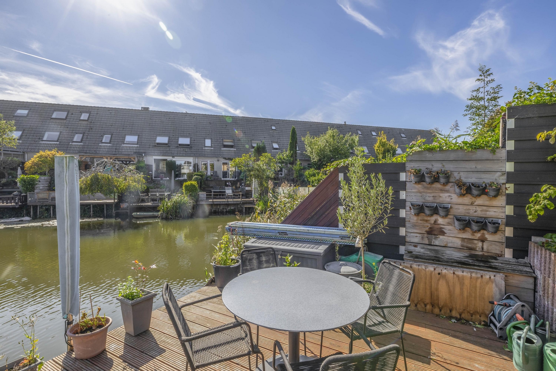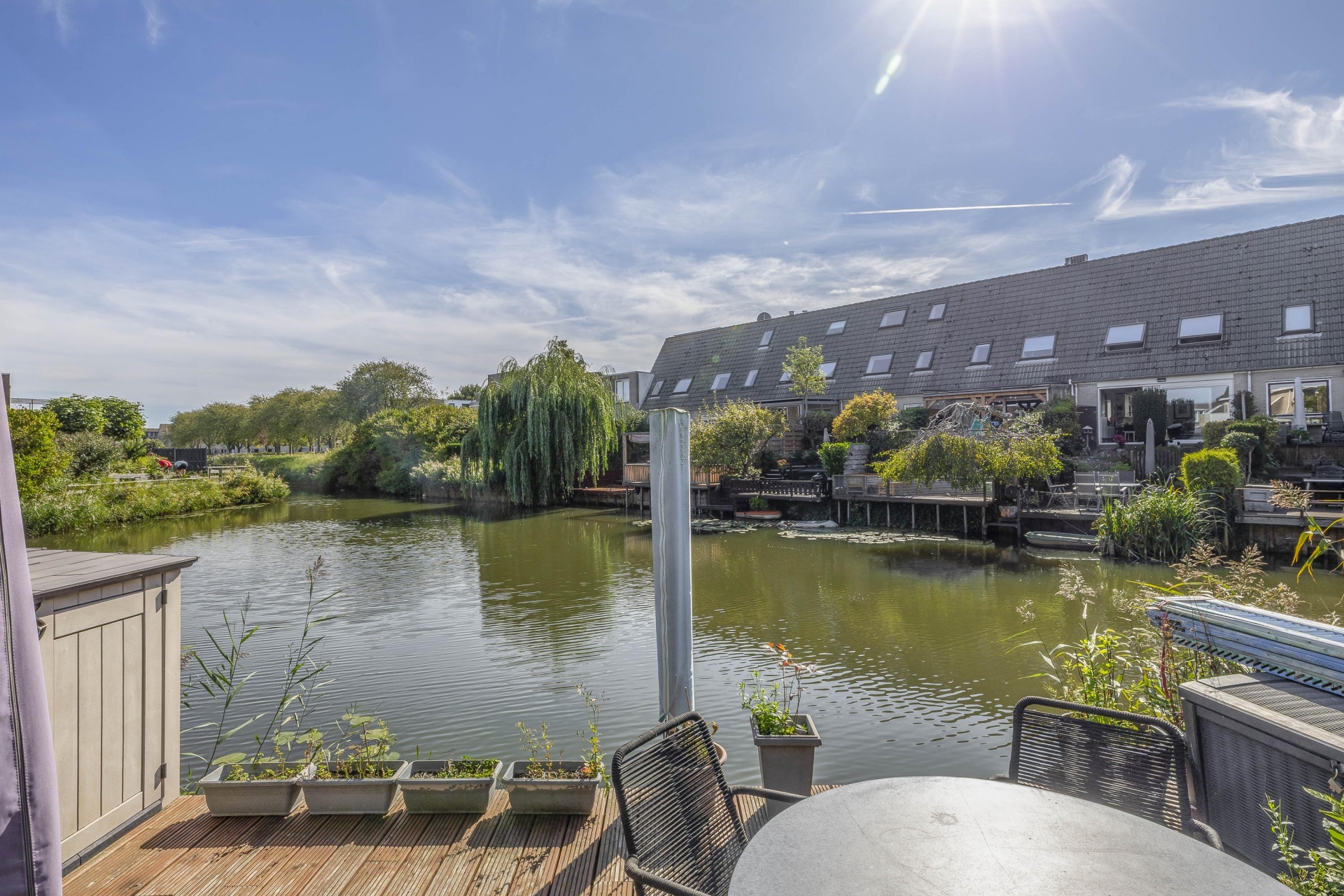 Een groot pluspunt van dit huis is zonder twijfel de achtertuin. Niet alleen is deze gelegen op het zonnige zuiden, maar hij grenst ook nog eens direct aan het water. Dat betekent: volop privacy, middag- en avondzon, én een uniek uitzicht. De tuin is fraai aangelegd en voorzien van een ruime overkapping waar je tot laat in het seizoen kunt buiten zitten.