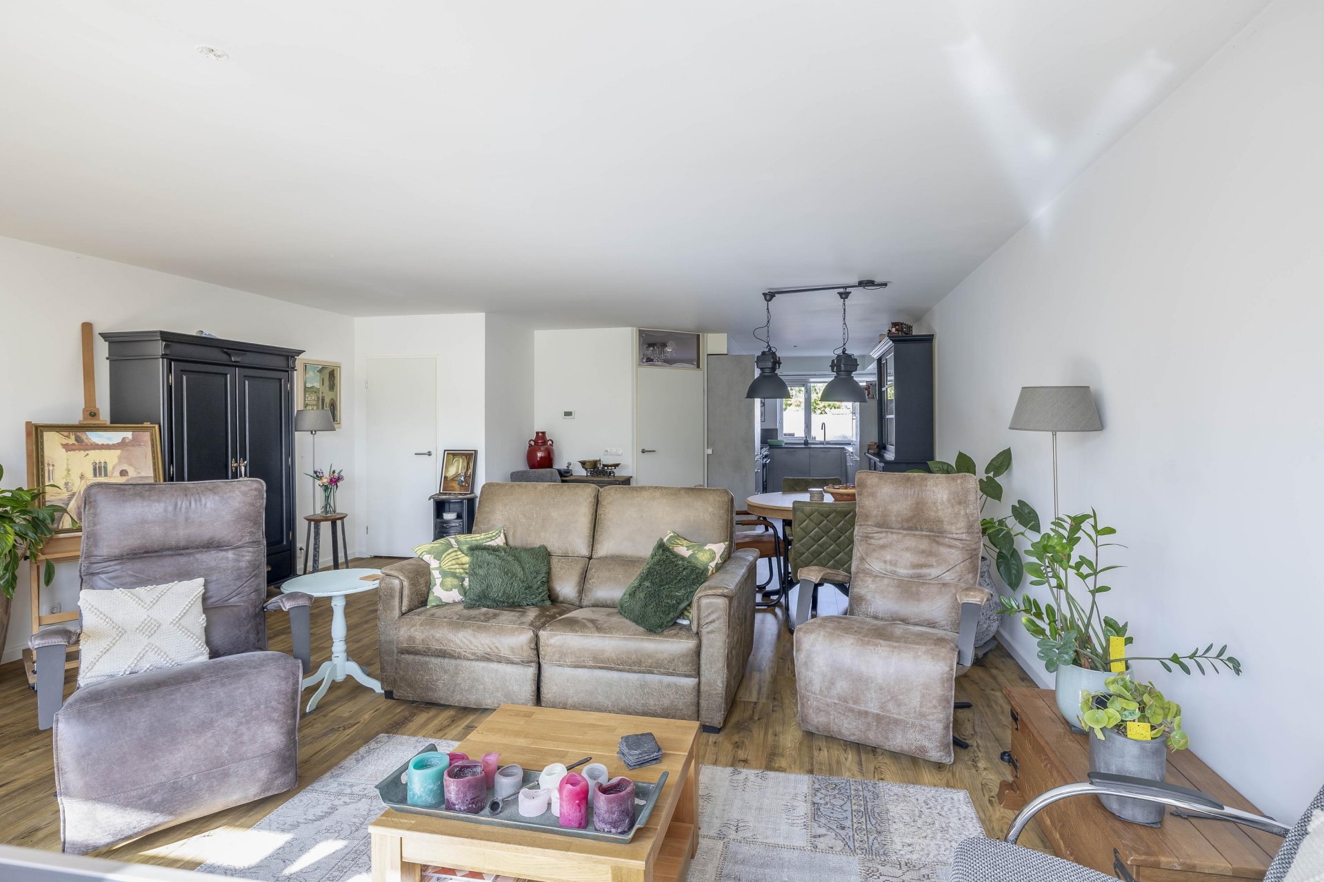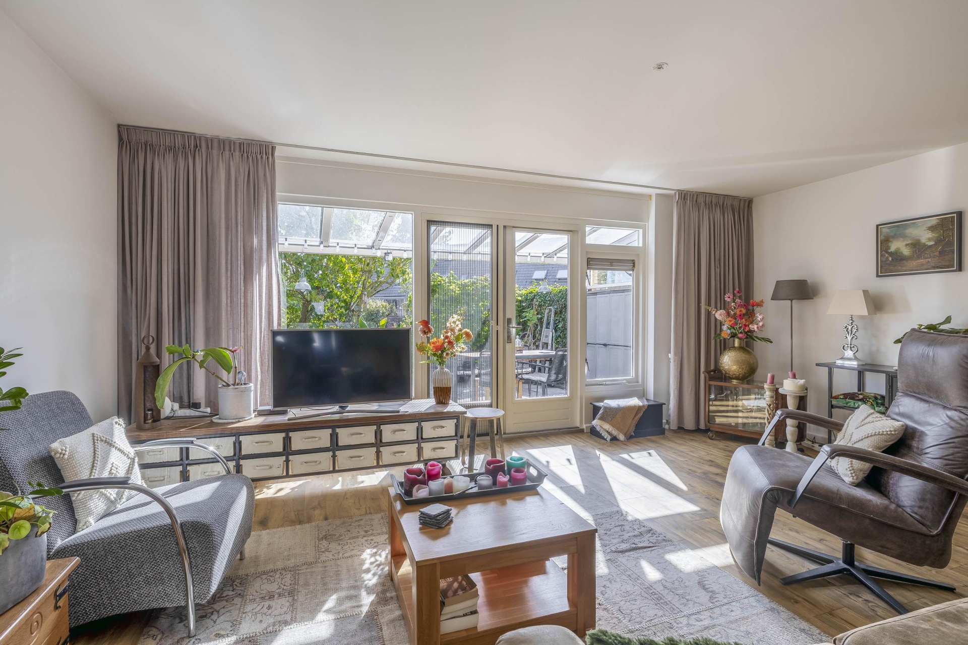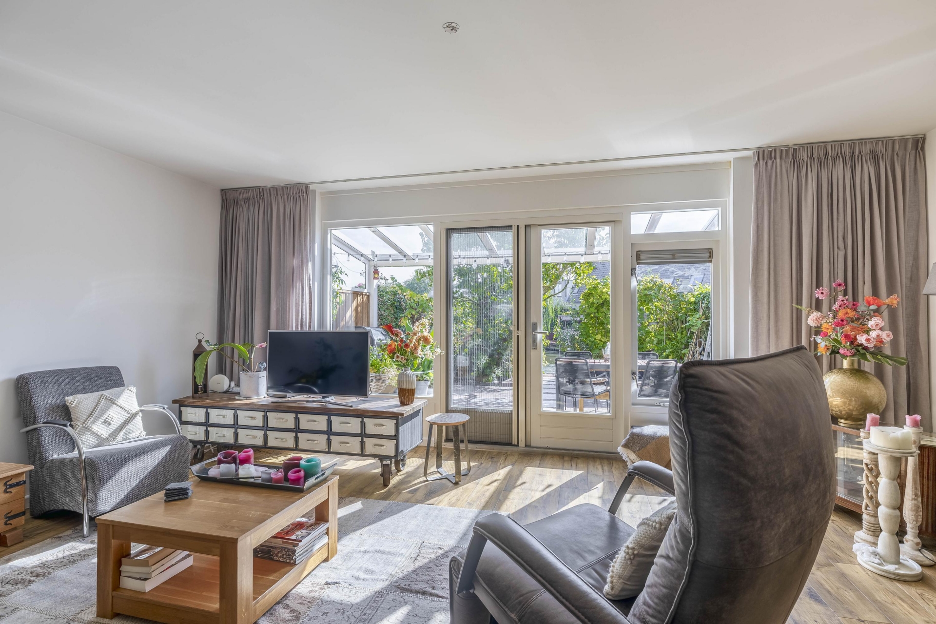 De begane grond biedt een royale woonkamer die dankzij de grote raampartijen en openslaande deuren naar de tuin, heerlijk licht aanvoelt.