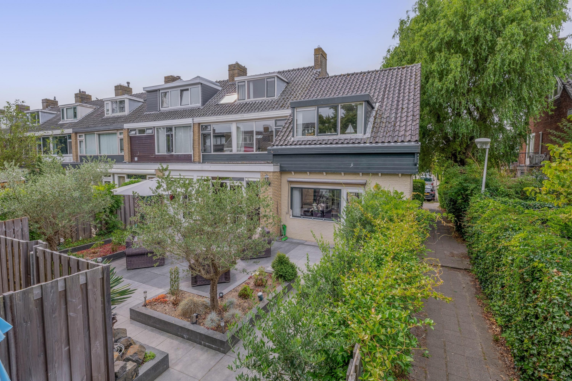 De tuin is een groot pluspunt. Zowel de voor- als achtertuin zijn royaal en verzorgd aangelegd. De achtertuin is gericht op het oosten, waardoor je hier in de ochtend en vroege middag geniet van de zon. Er zijn meerdere zithoeken gecreëerd, ideaal voor een ontbijtje buiten of een gezellige barbecue. De tuin biedt bovendien veel privacy door de volwassen begroeiing rondom. De voortuin is eveneens ruim, met een sfeervolle entree en een oprit waar je met gemak je auto kwijt kunt.