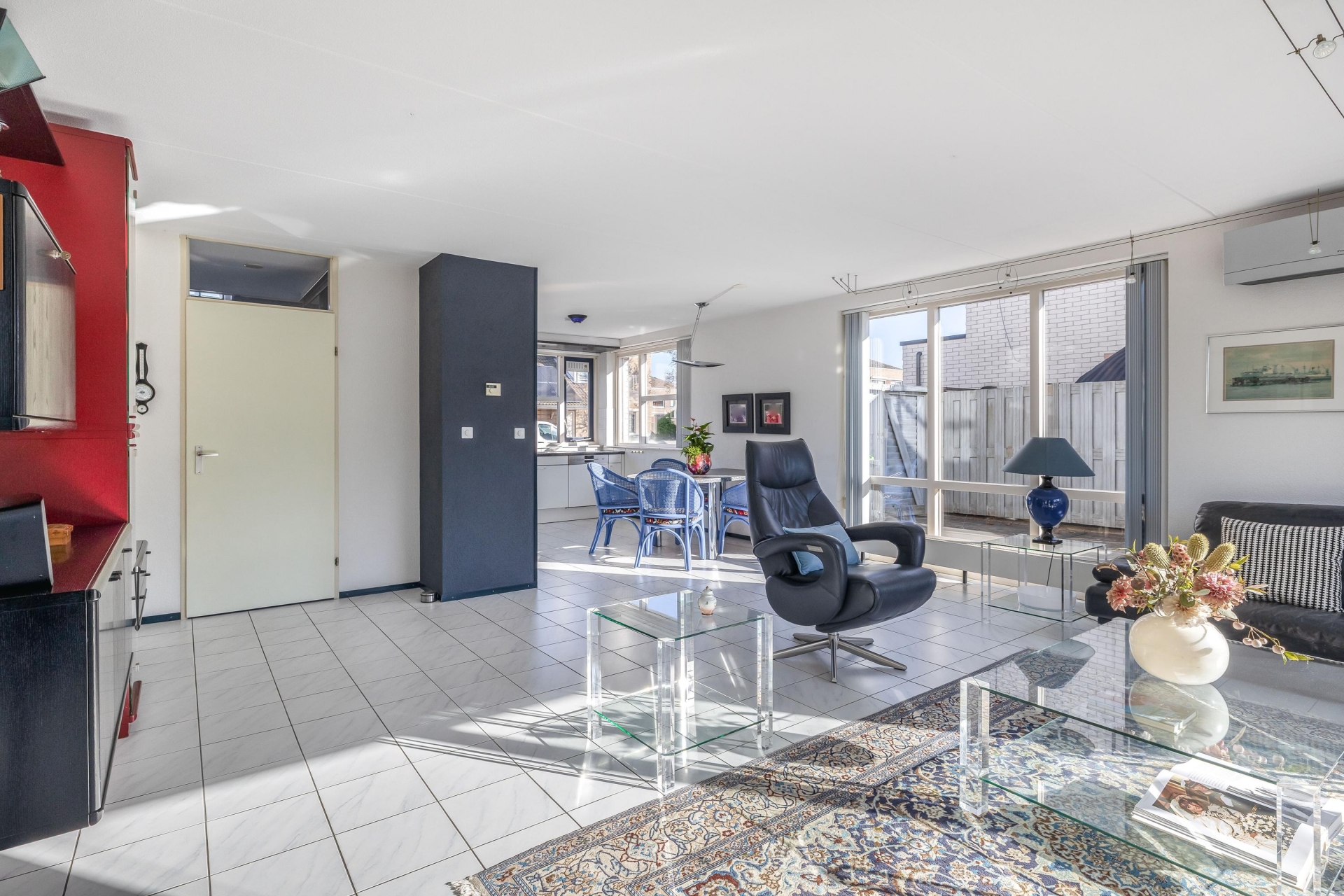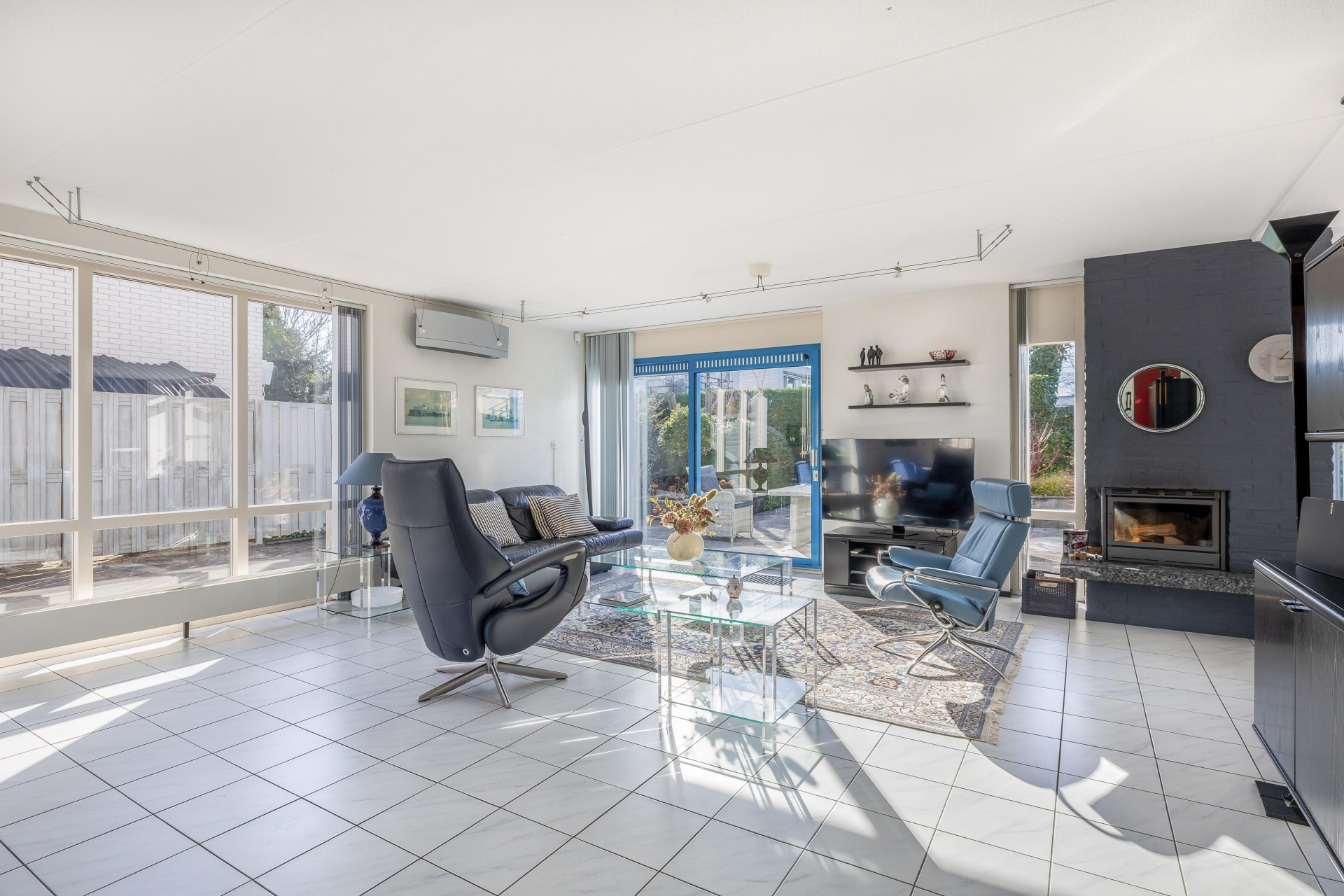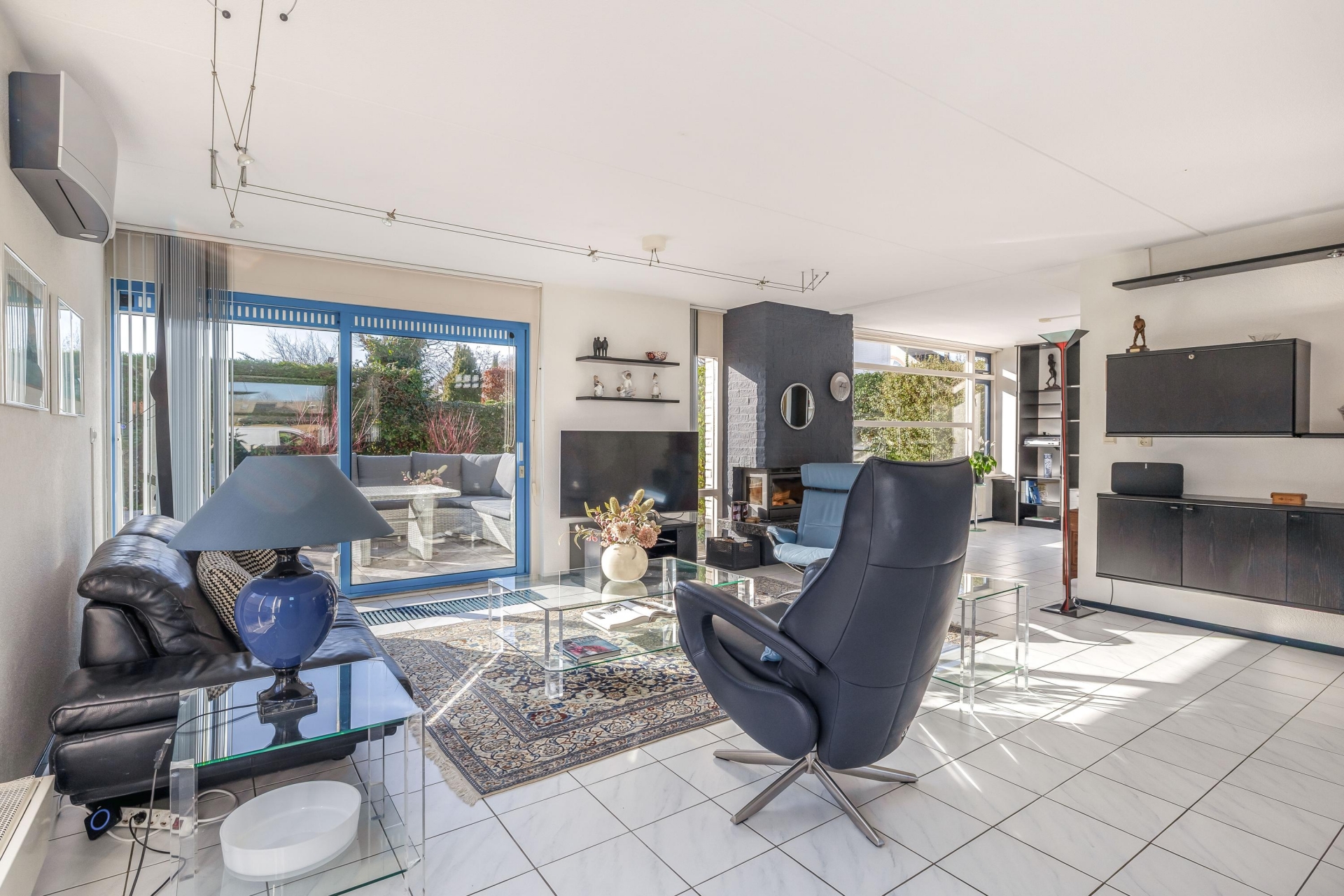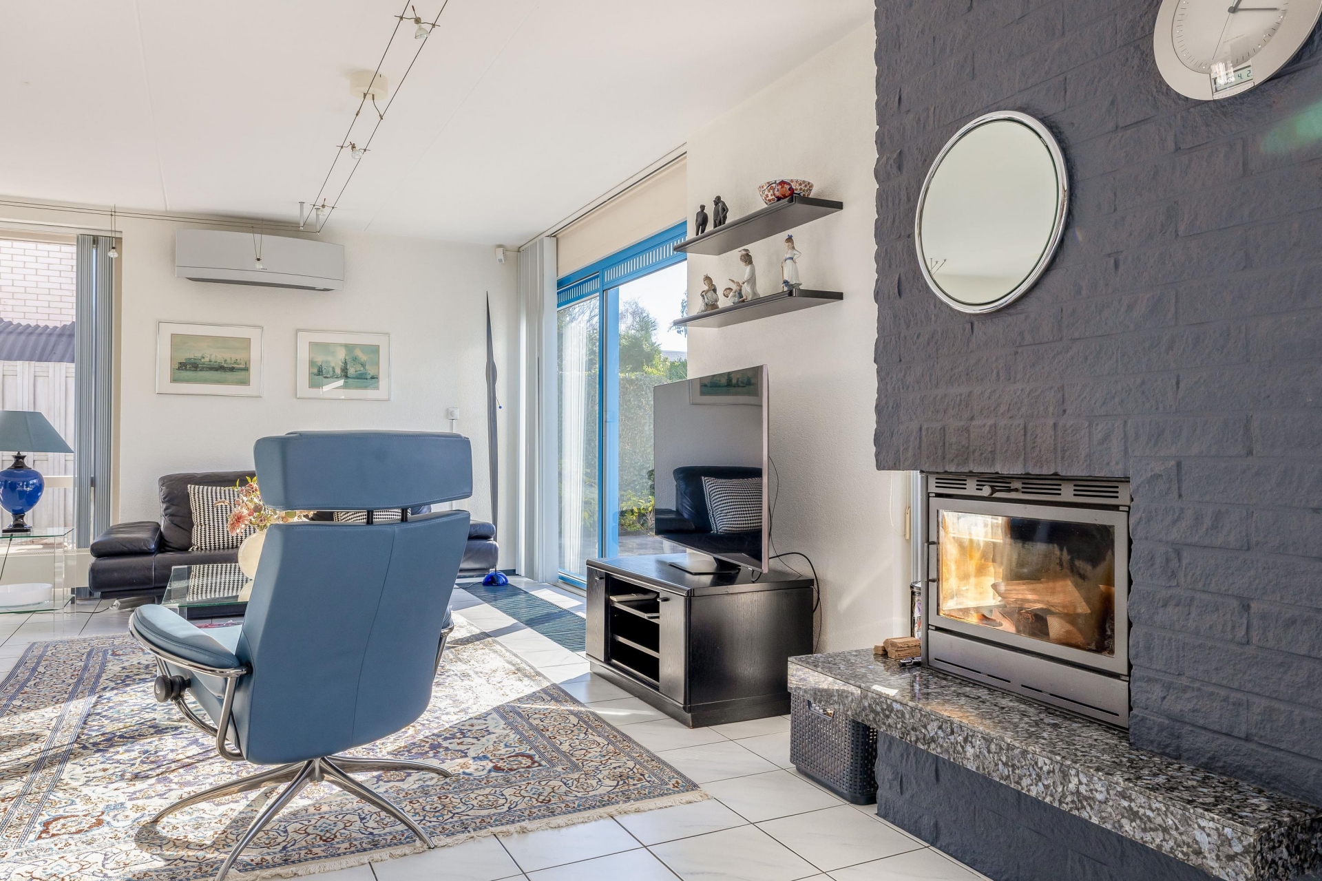 De woonkamer van circa 48 m² is een heerlijke plek om te leven. Dankzij de grote raampartijen en de schuifpui naar de tuin komt er veel daglicht naar binnen, wat zorgt voor een open en frisse sfeer. De vloer is afgewerkt met lichte tegels en de indeling is ruim, waardoor je eenvoudig een gezellige zithoek én een grote eettafel kwijt kunt. De open haard geeft extra sfeer op winterse avonden en de airco-unit is ideaal op te verwarmen, maar houdt het ook ’s zomers aangenaam koel.