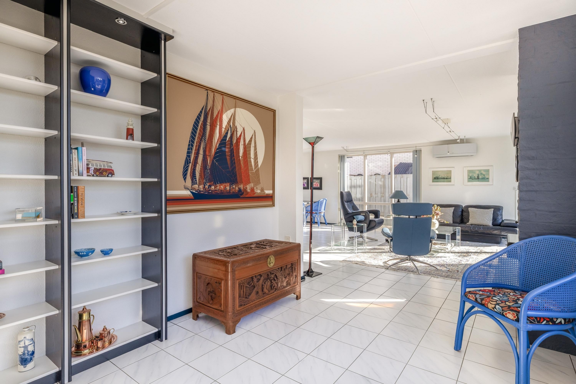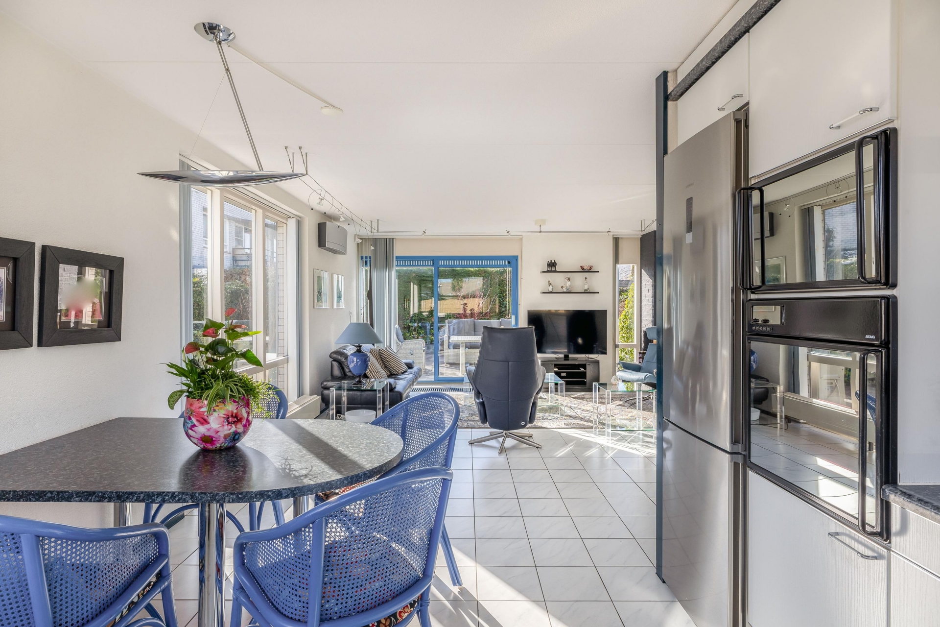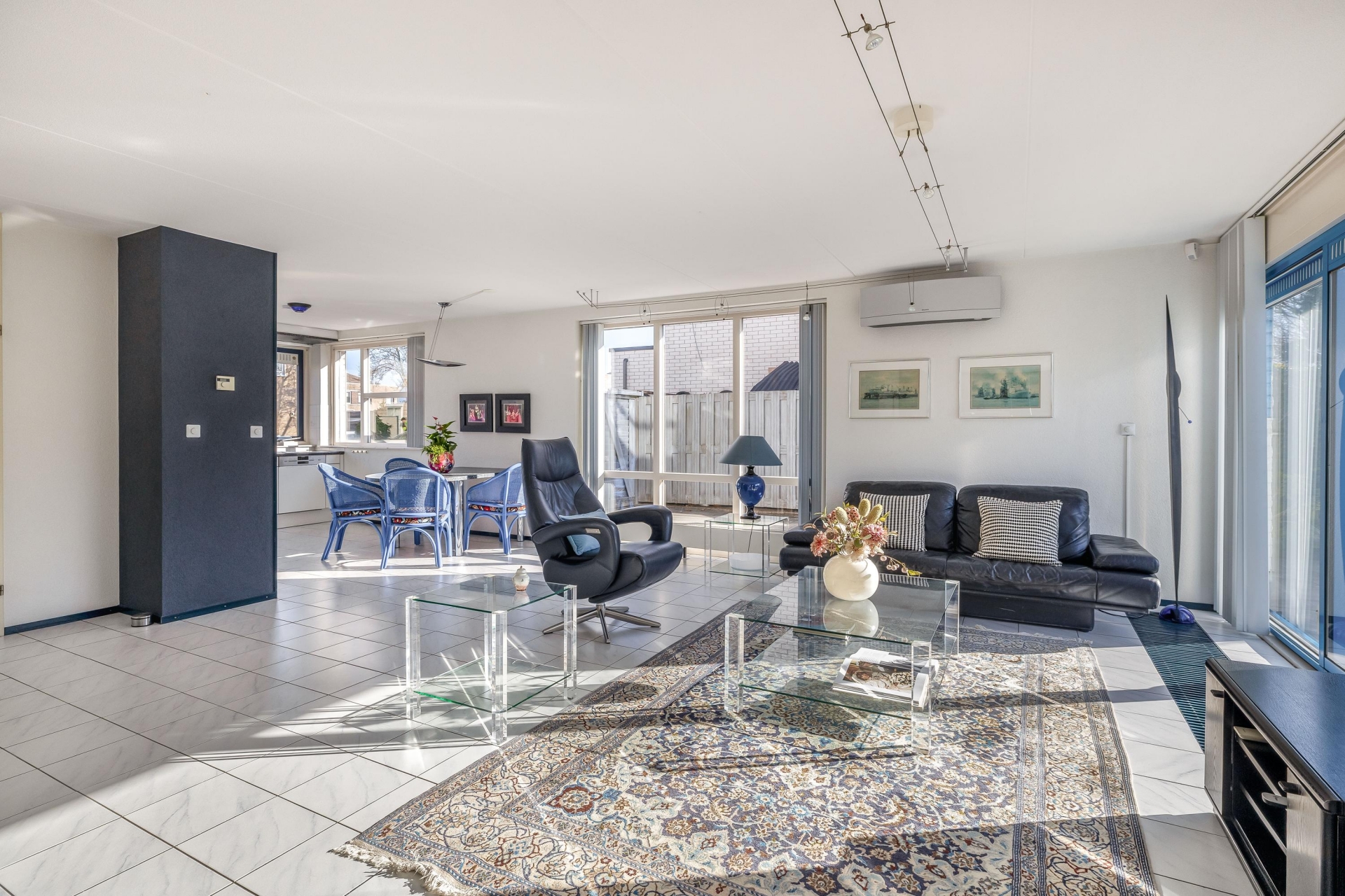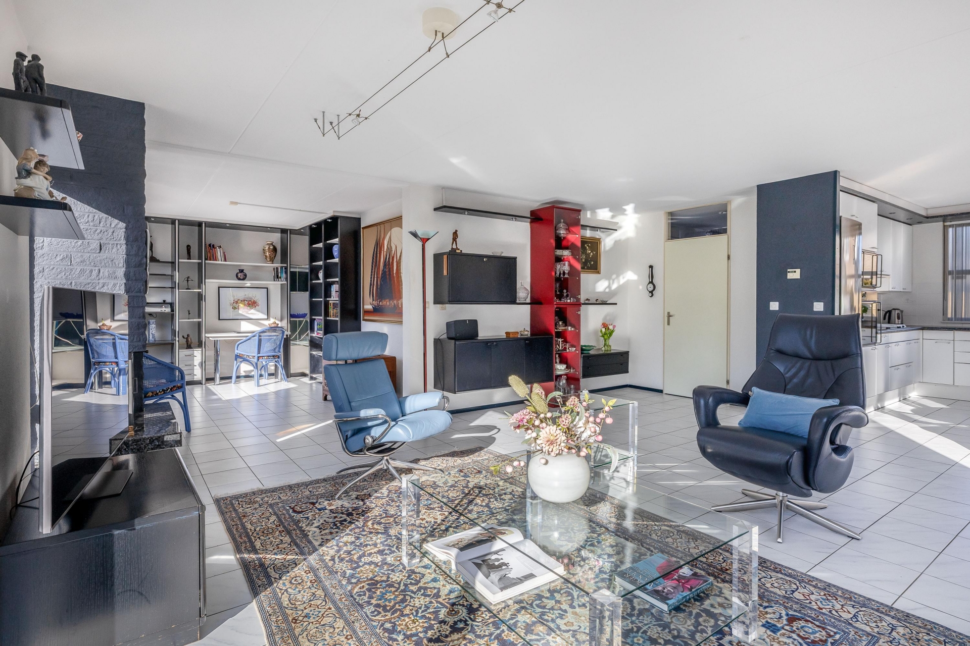De woonkamer van circa 48 m² is een heerlijke plek om te leven. Dankzij de grote raampartijen en de schuifpui naar de tuin komt er veel daglicht naar binnen, wat zorgt voor een open en frisse sfeer. De vloer is afgewerkt met lichte tegels en de indeling is ruim, waardoor je eenvoudig een gezellige zithoek én een grote eettafel kwijt kunt. De open haard geeft extra sfeer op winterse avonden en de airco-unit is ideaal op te verwarmen, maar houdt het ook ’s zomers aangenaam koel.