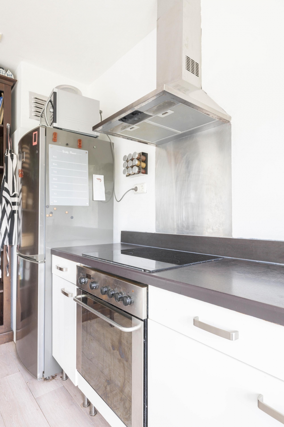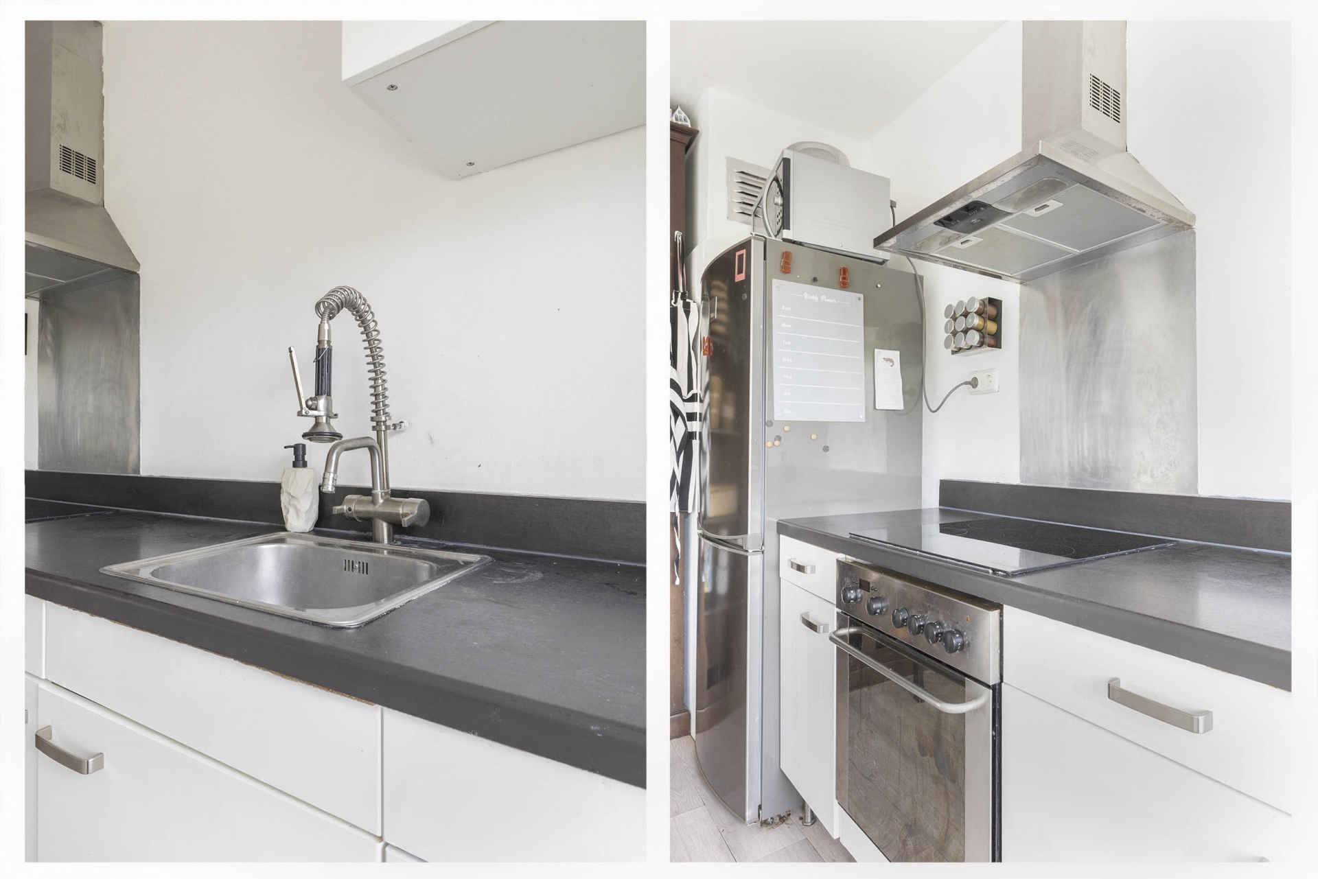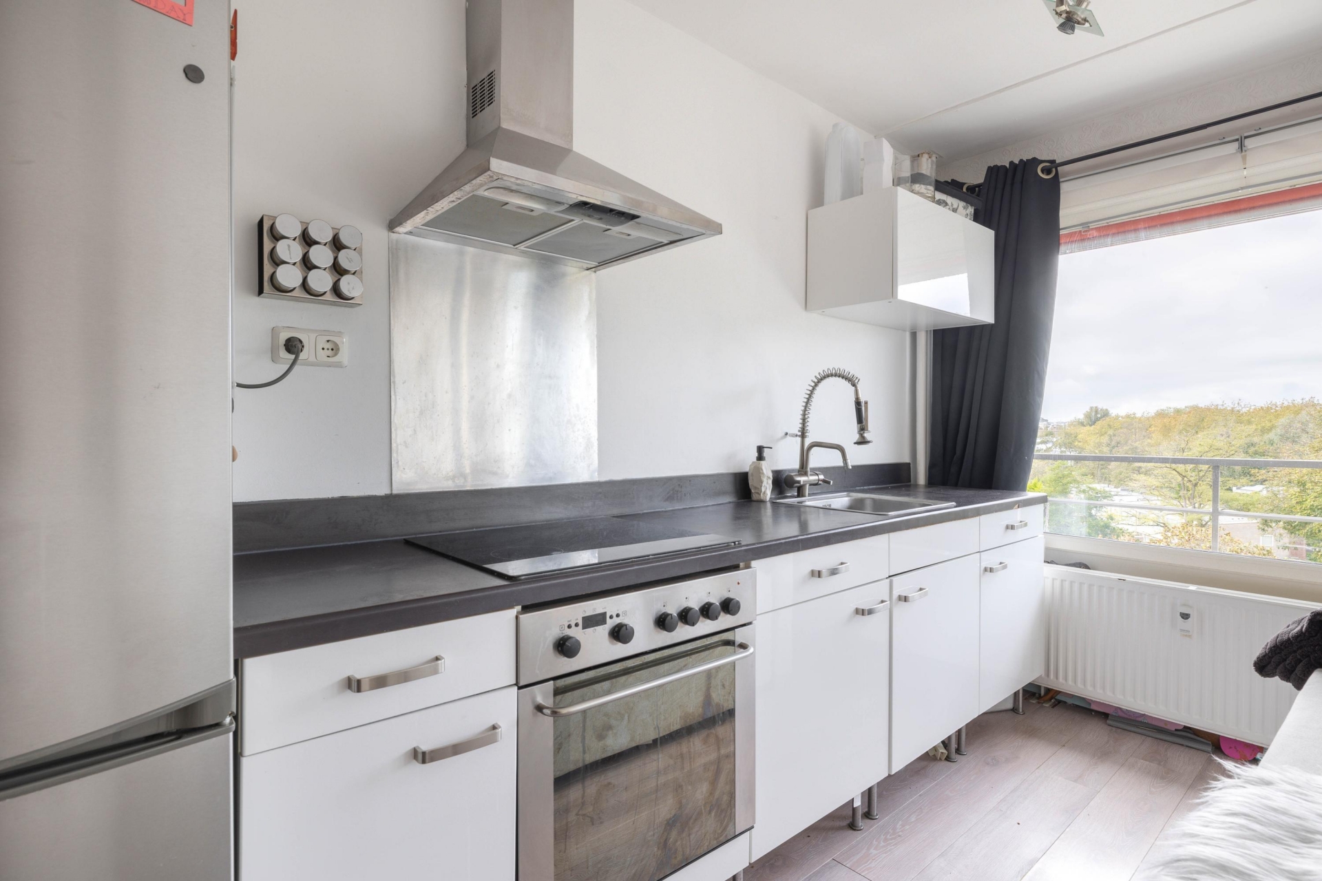 De open keuken heeft een neutrale inrichting en is voorzien van een inductiekookplaat, afzuigkap en koelkast met vriesvak (blijft achter).