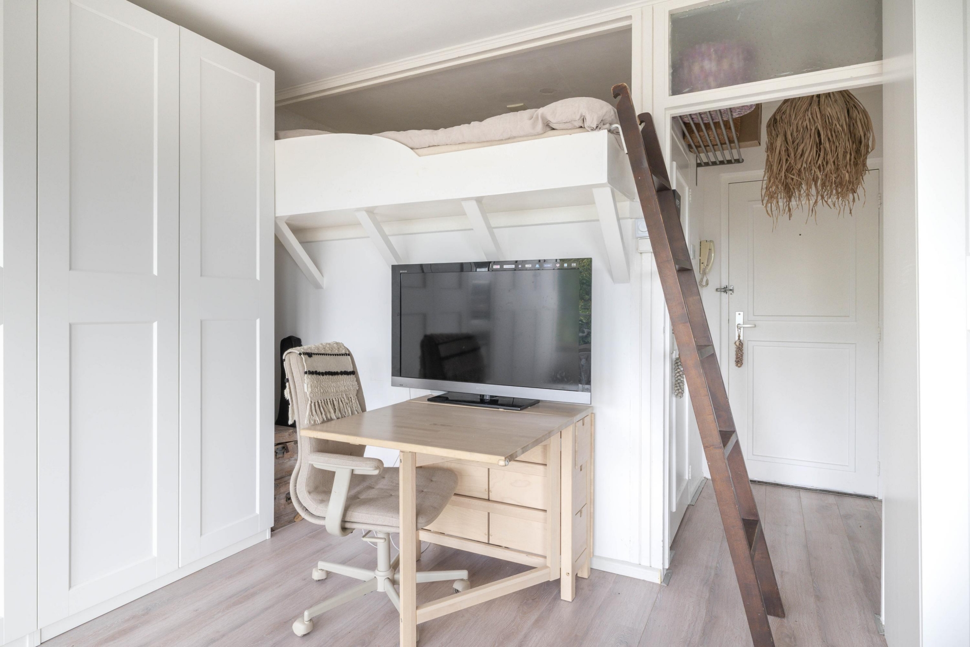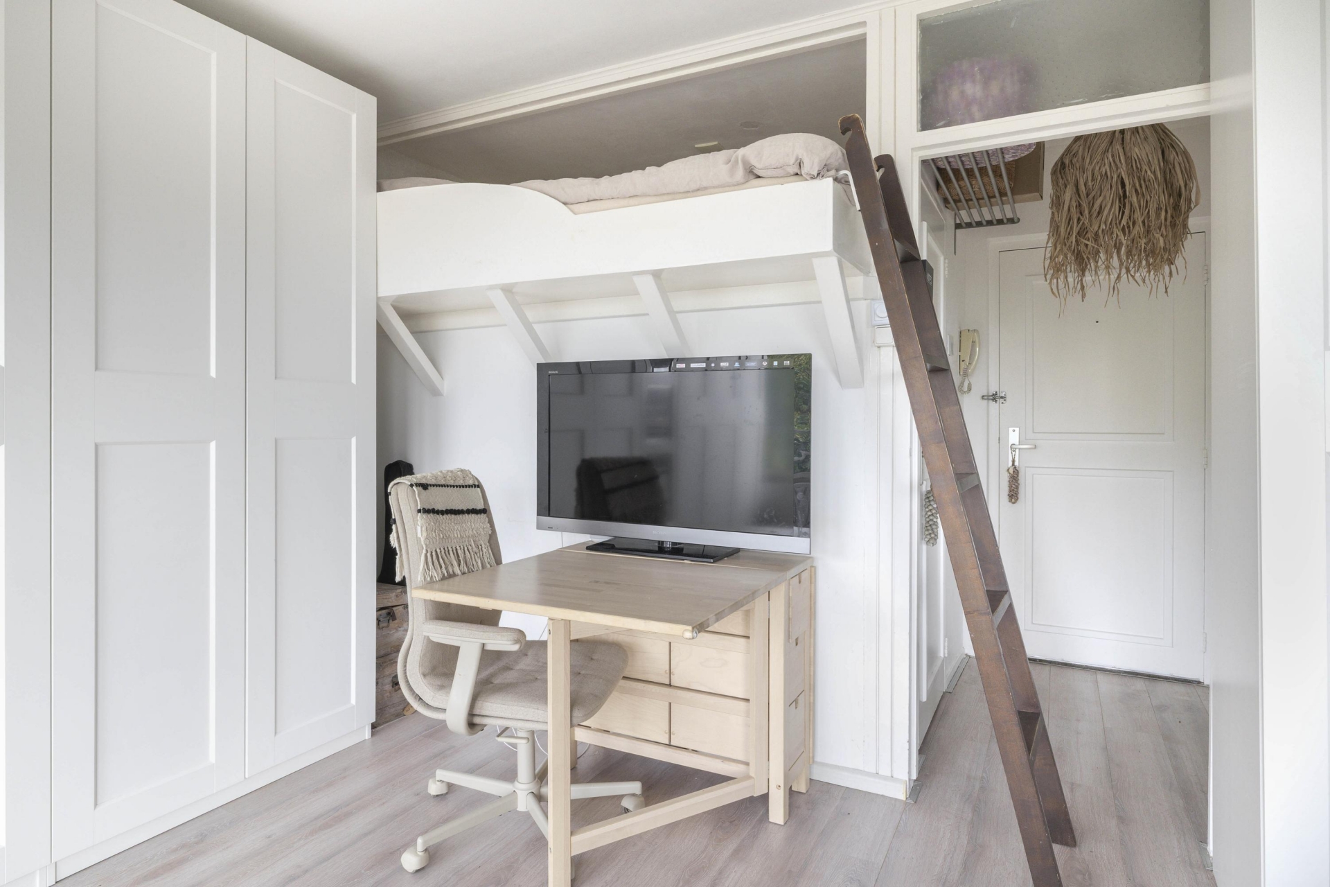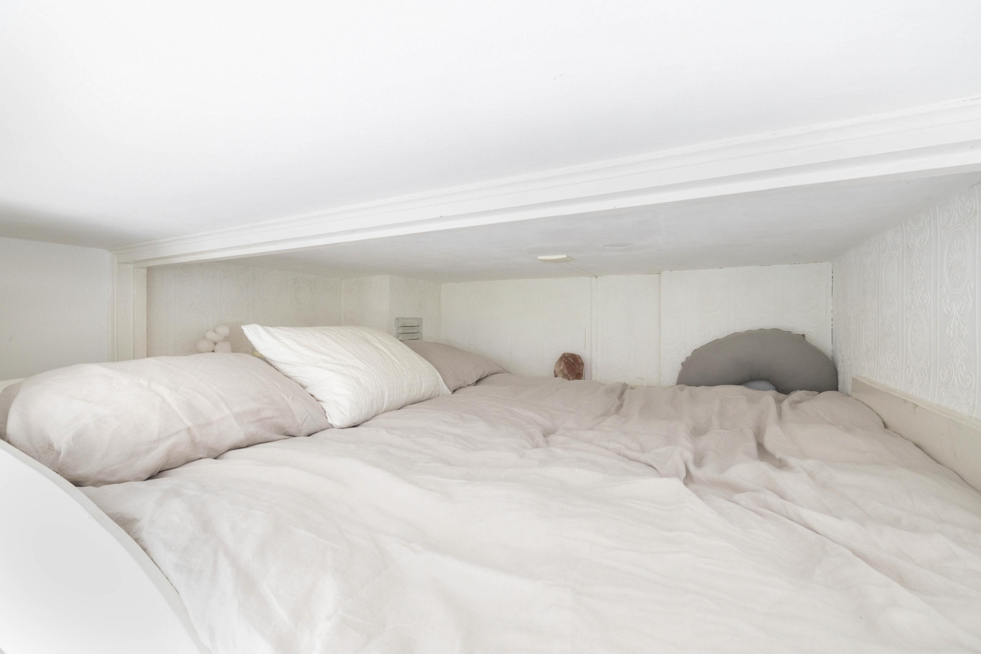 De woonkamer staat in open verbinding met de unieke slaapvide, met ruimte voor een tweepersoonsbed.