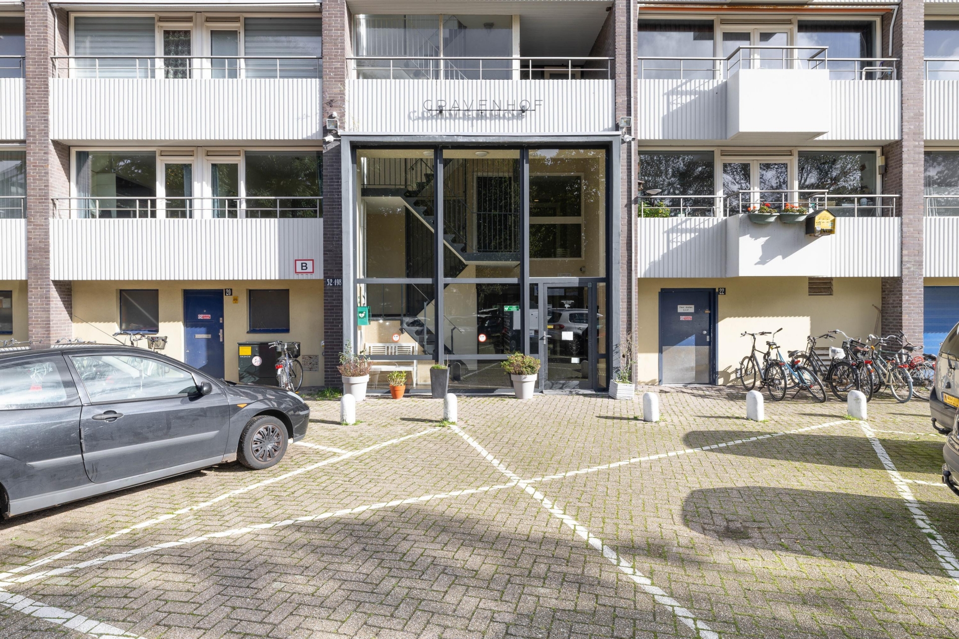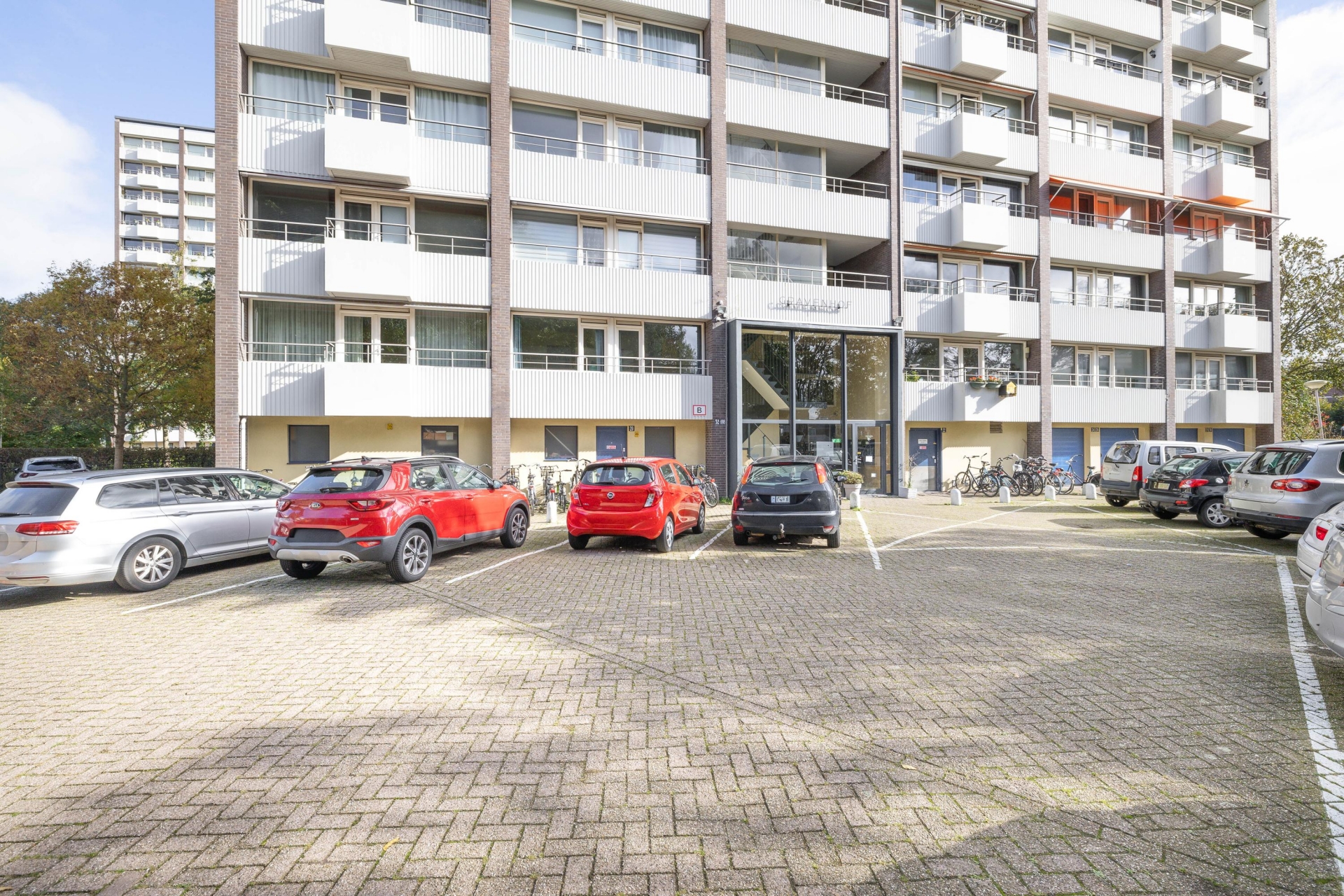 Toegang tot het gebouw via het gemeenschappelijke en afgesloten parkeerterrein (te openen via telefoonnummer).