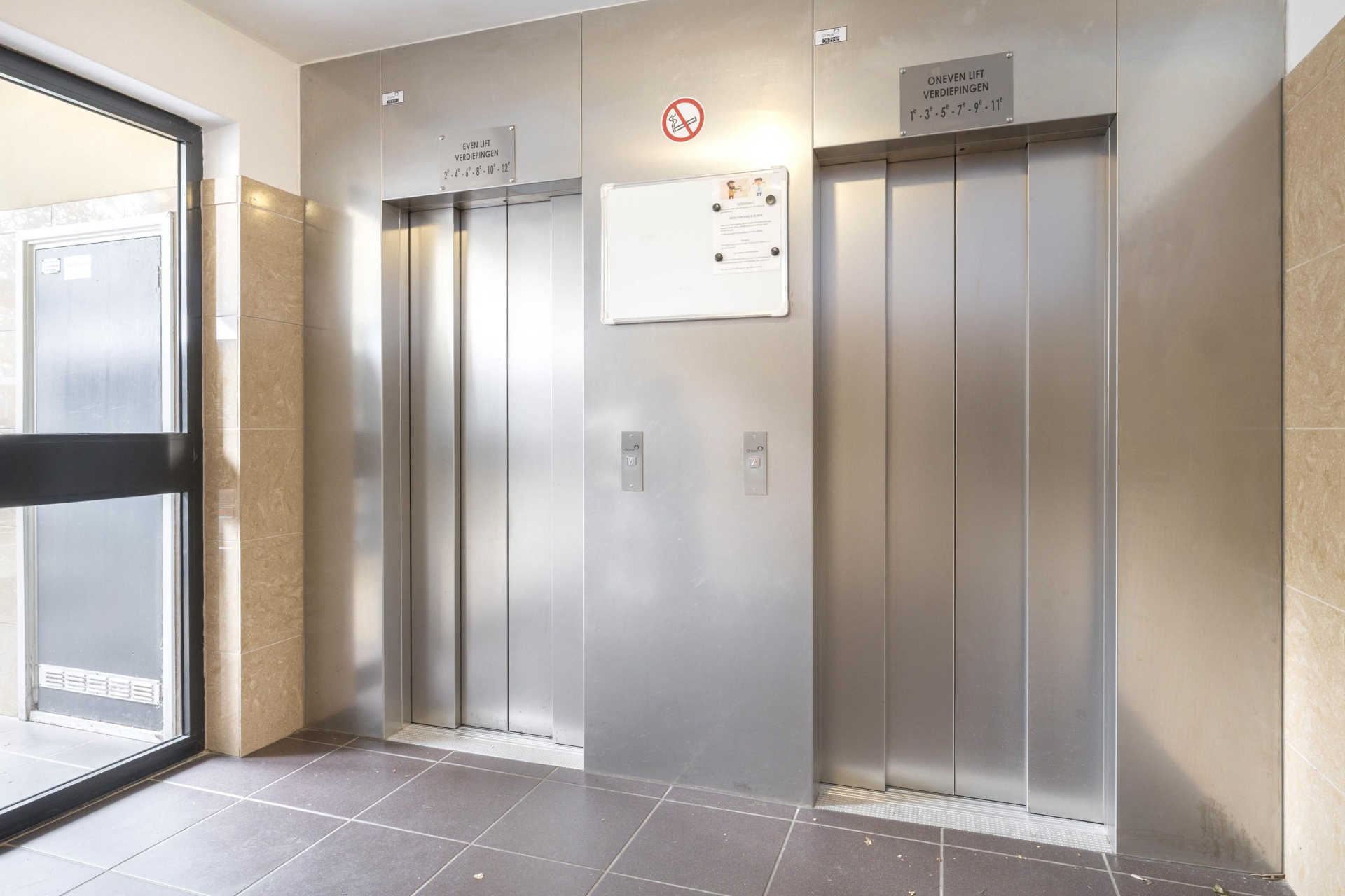 Gesloten portiek met bellentableau en lift of trap naar de vijfde verdieping.