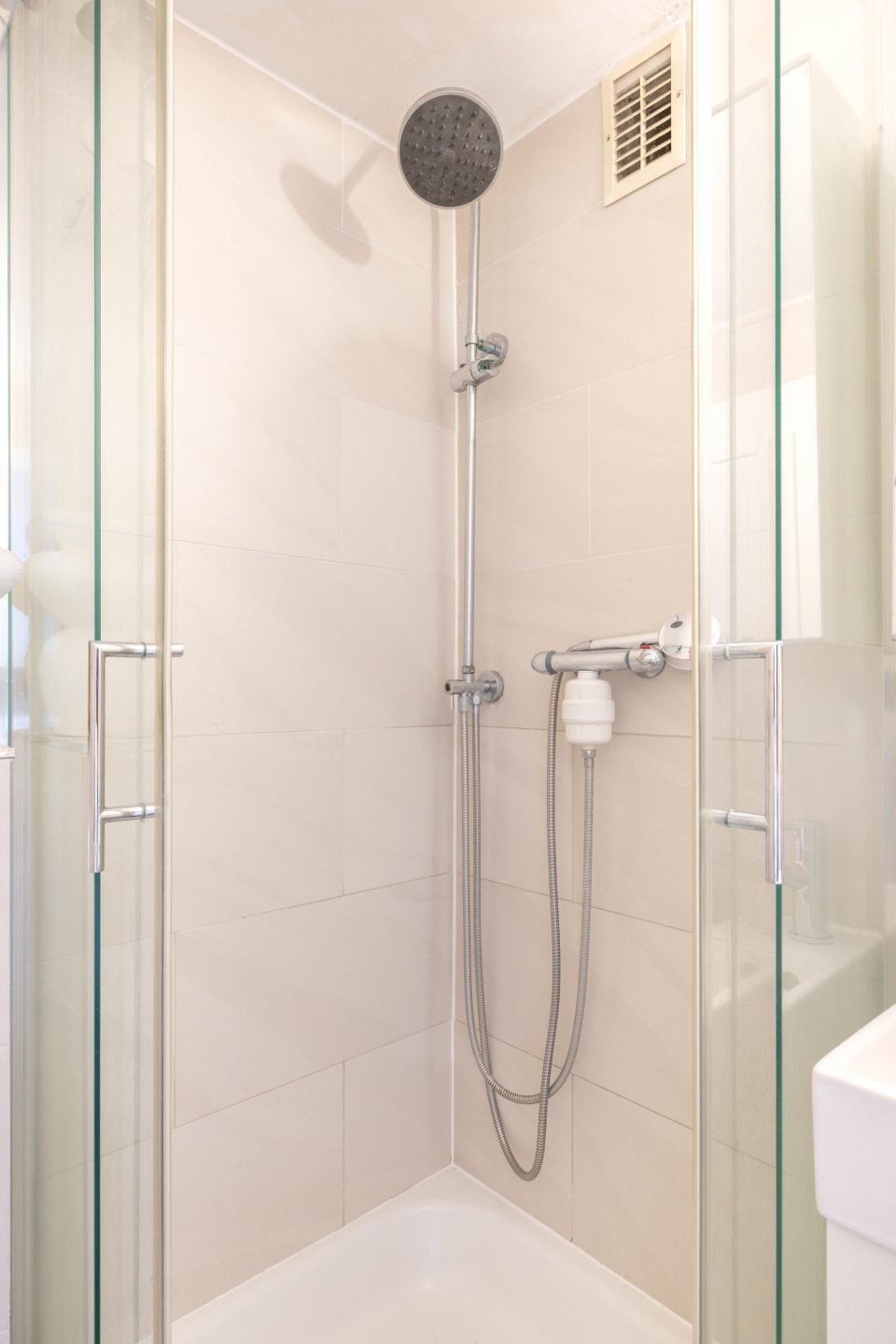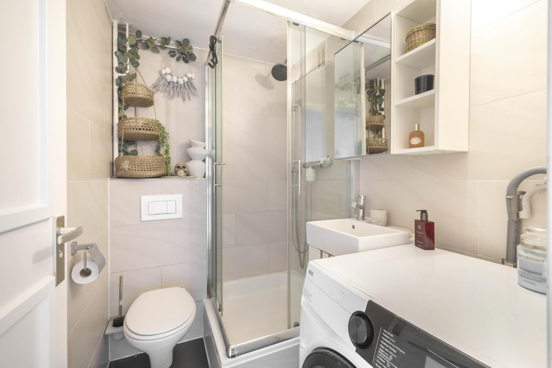 Aan de linkerkant van de hal ligt de moderne badkamer met toilet, douchehoek, wastafelmeubel met spiegelkast en opstelplaats voor de wasmachine.