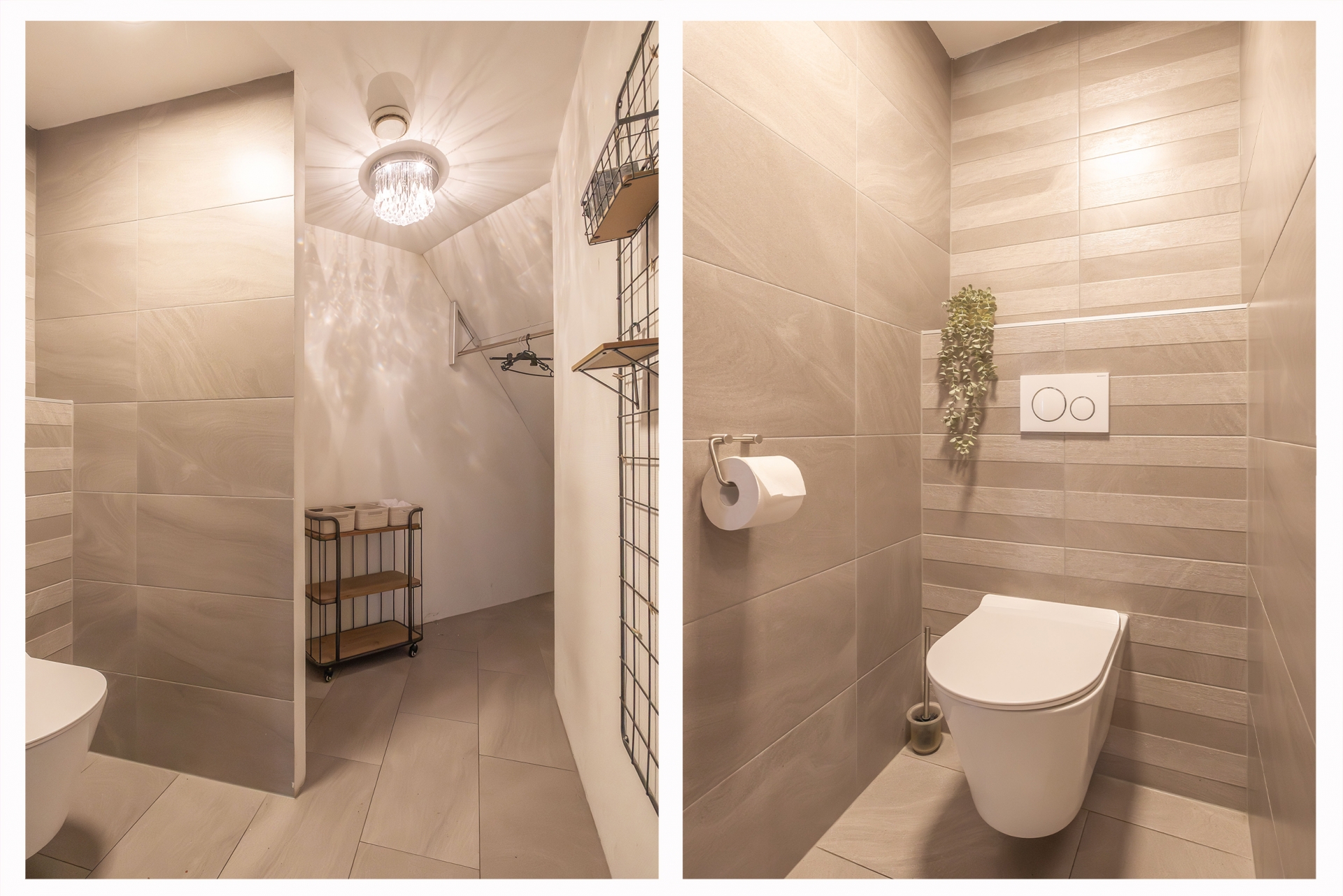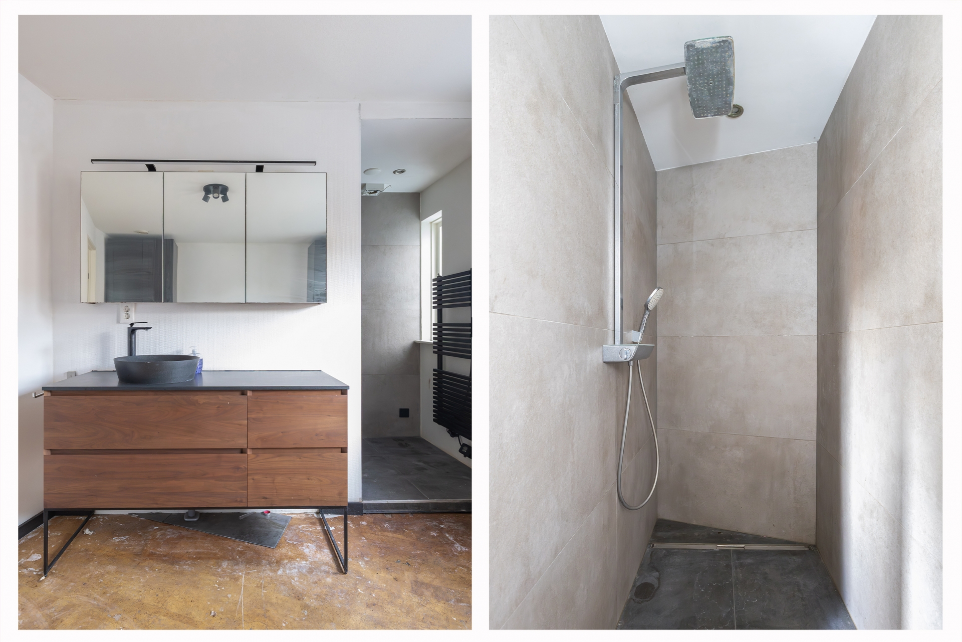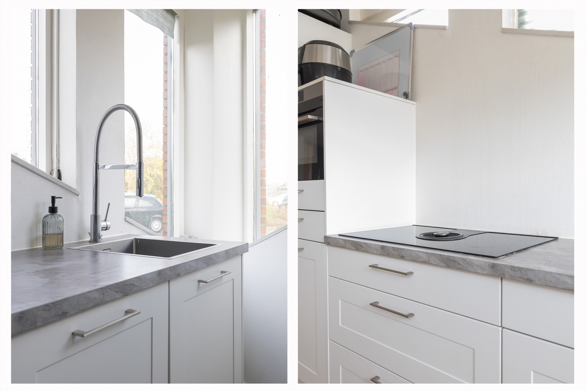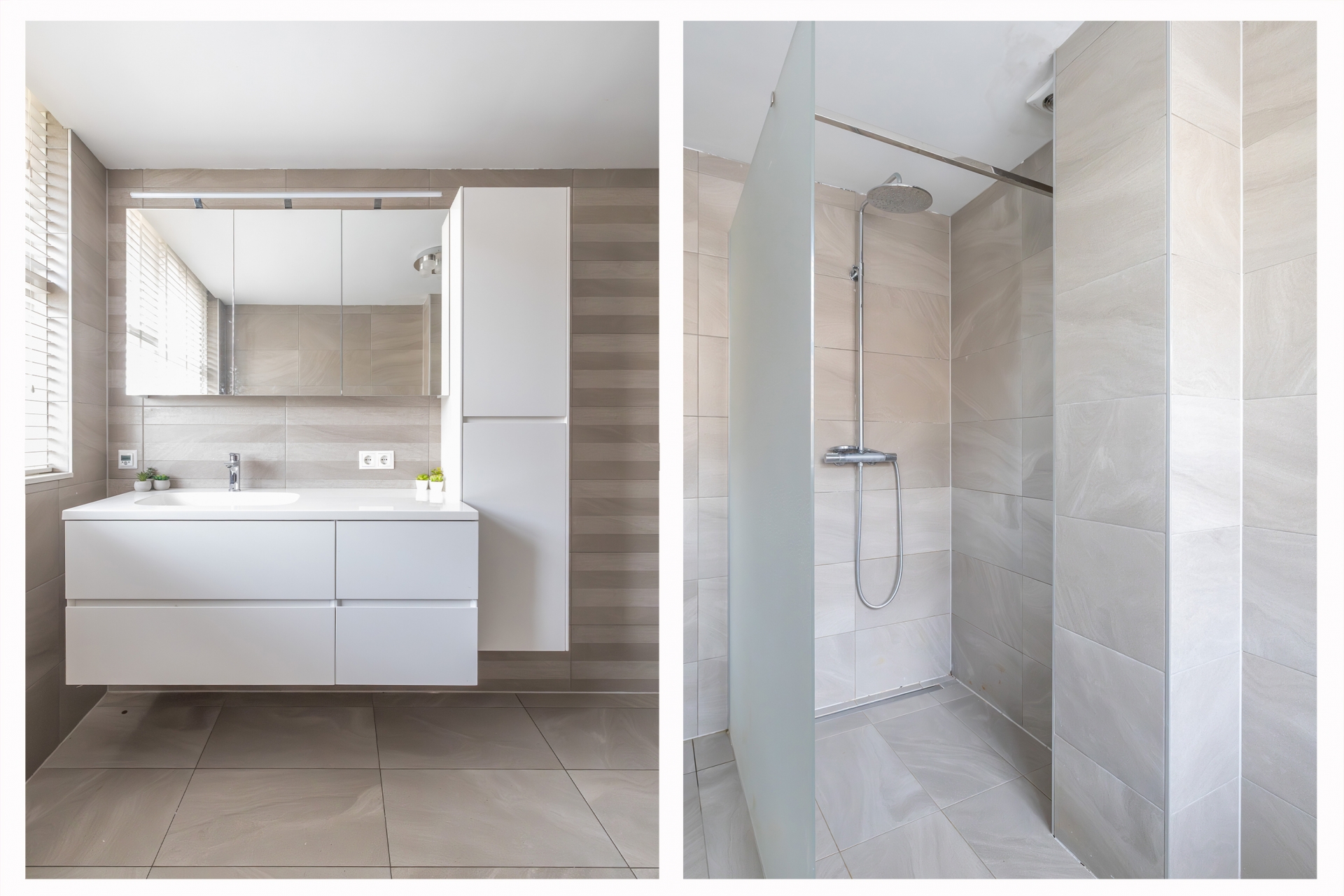 Grenzend hieraan bevindt zich de toiletruimte met hangend closet en wasmachineaansluiting. Tegenover de toiletruimte vindt u de badkamer. Deze volledig betegelde badkamer is uitgevoerd met een antraciet kleurige tegel en is voorzien van een bijzonder riante inloopdouche en een eigen wastafelmeubel. Verder de hal in gelopen vindt u de toegang tot de slaapkamer. Aan de achterzijde van de woning bevindt zich de bijzonder ruime, maar bovenal speelse woonkamer. Tevens bevindt zich hier de open keuken. Deze open keuken is uitgevoerd met een witte kleurstelling en beschikt over diverse Inbouwapparatuur uur te weten; koel/vries combinatie, combi magnetron, 4-pits inductie kookplaat, vaatwasser en rvs spoelbak.