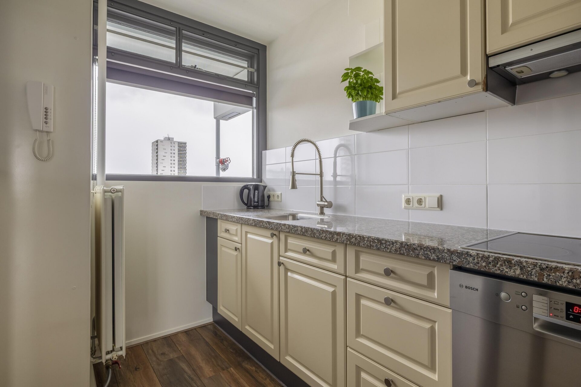 Middels de lift kom je uit op de 8e verdieping, waar het appartement is gelegen. Entree en hal met de meterkast. Dichte keuken aan de voorzijde van het complex. De keuken is voorzien van diverse (inbouw)apparatuur en een close-in boiler van 10 liter (eigendom, 2015). Vanuit de keuken is er toegang tot de woonkamer. De ruime woonkamer is gelegen aan de achterzijde van het complex en biedt vanaf hier een waanzinnig weids uitzicht over de wijk. Middels een openslaande deur is het ruime balkon toegankelijk. Deze is ook nog eens zonnig gesitueerd, namelijk op het zuiden. Gegarandeerd dat je hier optimaal gaat genieten van de zon en het uitzicht!