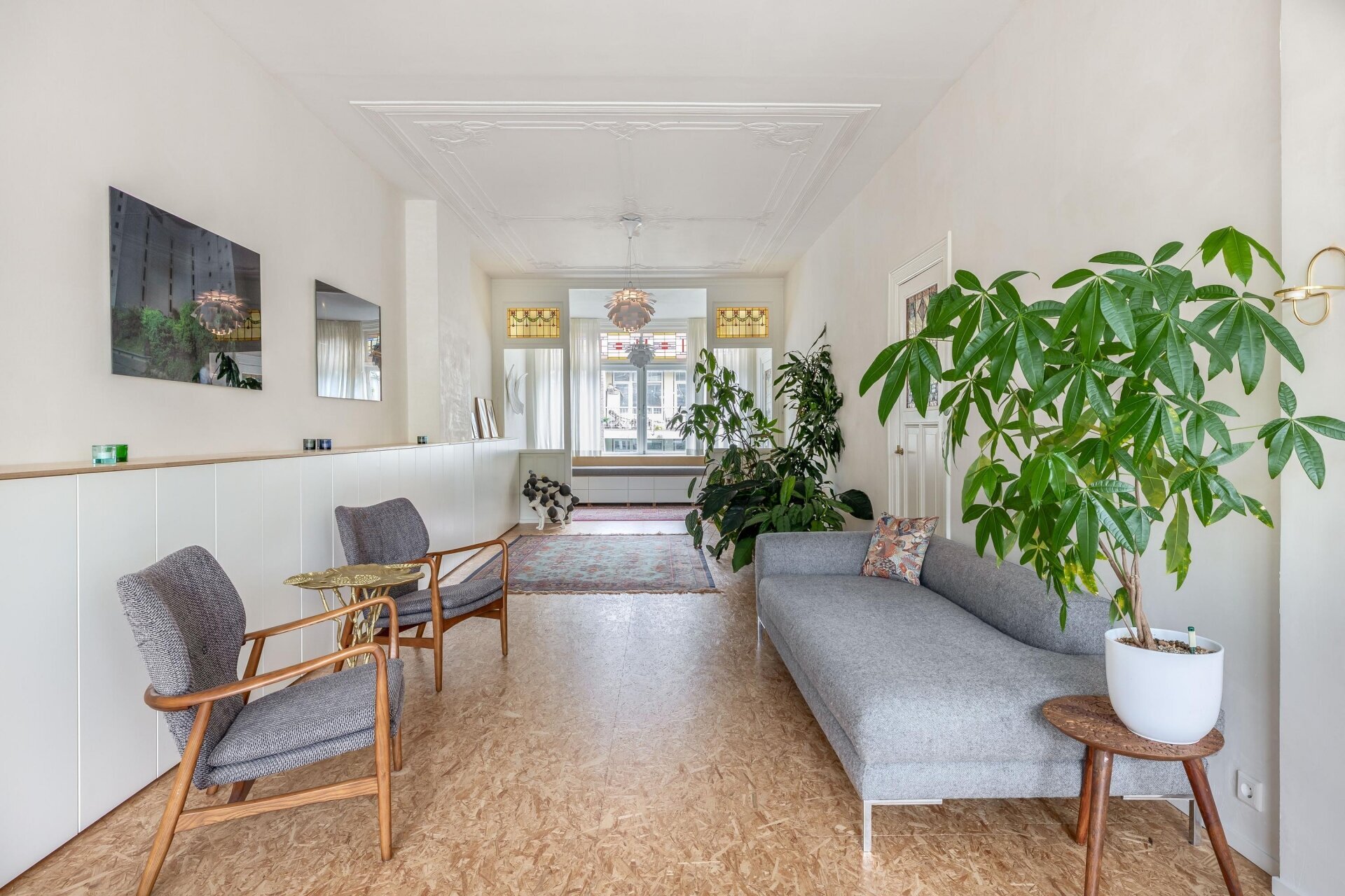 Wat meteen opvalt bij binnenkomst is het gevoel van ruimte. Op de tweede verdieping wordt je verrast door het karakter van deze woning vanuit vervlogen jaren met de prachtige ornamenten, glas-in-lood en paneeldeuren. Dit staat in prachtig contrast met de 2 verdiepingen erboven.