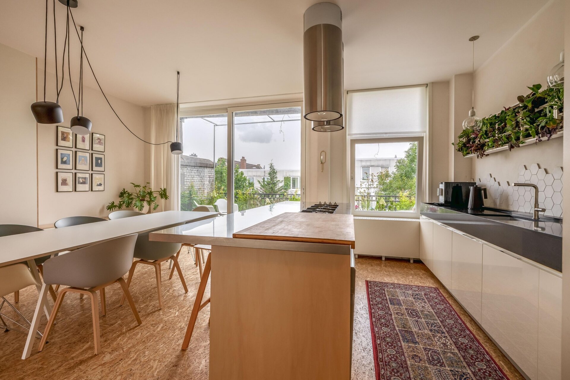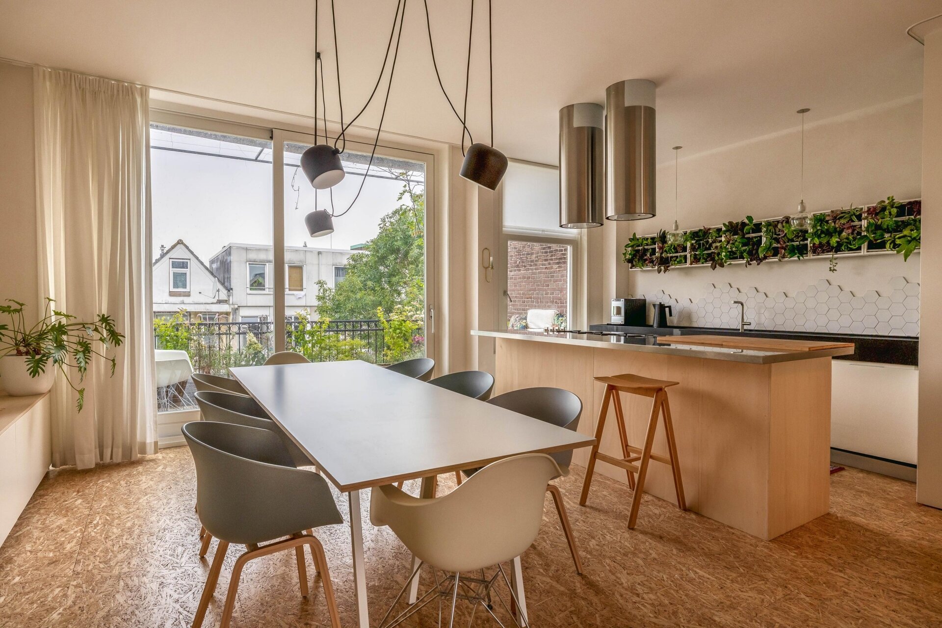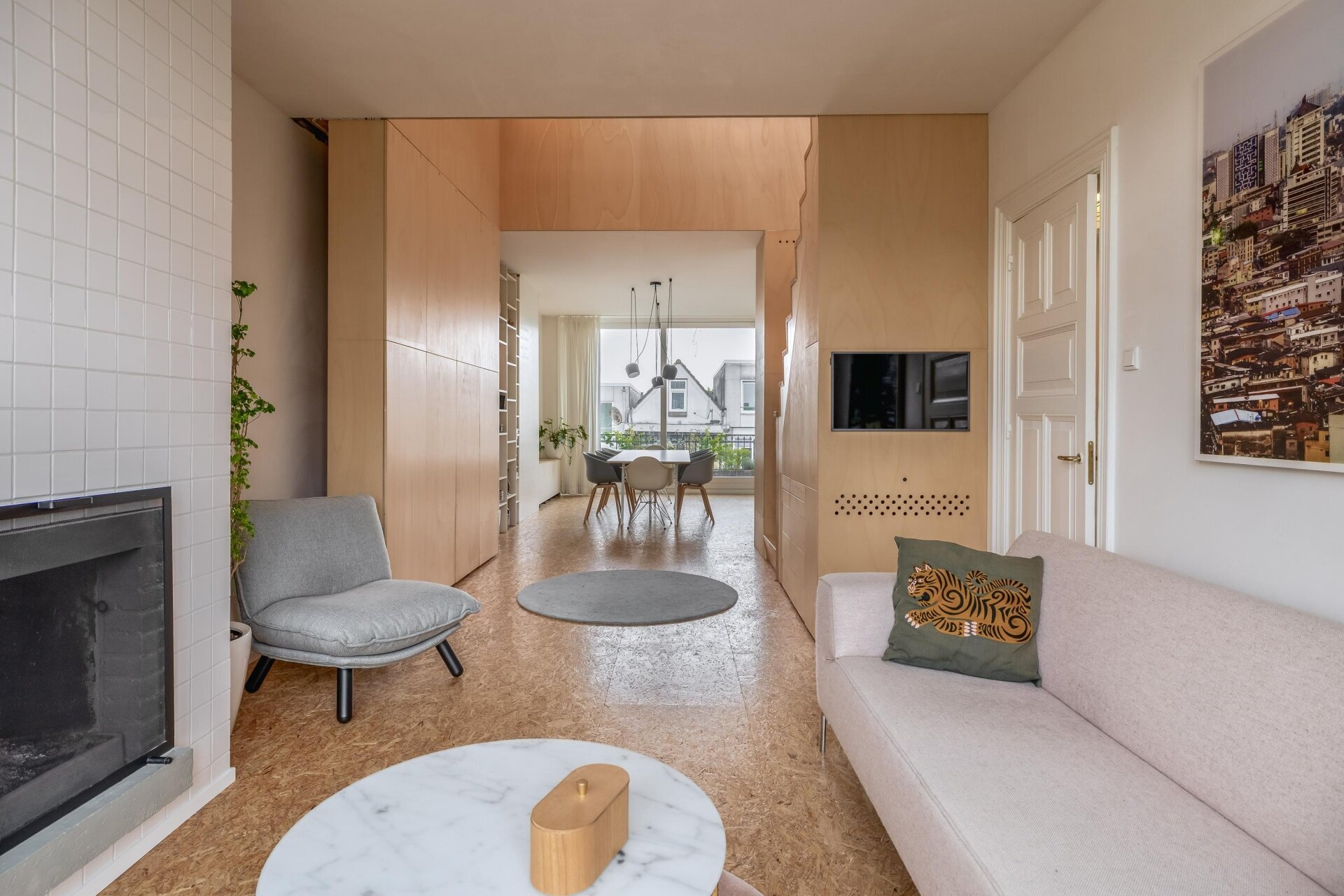 De derde verdieping is één grote open leefruimte met een moderne keuken aan de voorzijde en een sfeervolle woonkamer aan de achterzijde, waar de schuifpui je leidt naar het terras. De houten trap en vide zorgen voor een indrukwekkend ruimtelijk effect. Dankzij de open verbinding met de vierde verdieping valt het daglicht vanuit meerdere kanten binnen en ontstaat er een fijn gevoel van contact tussen de verdiepingen.