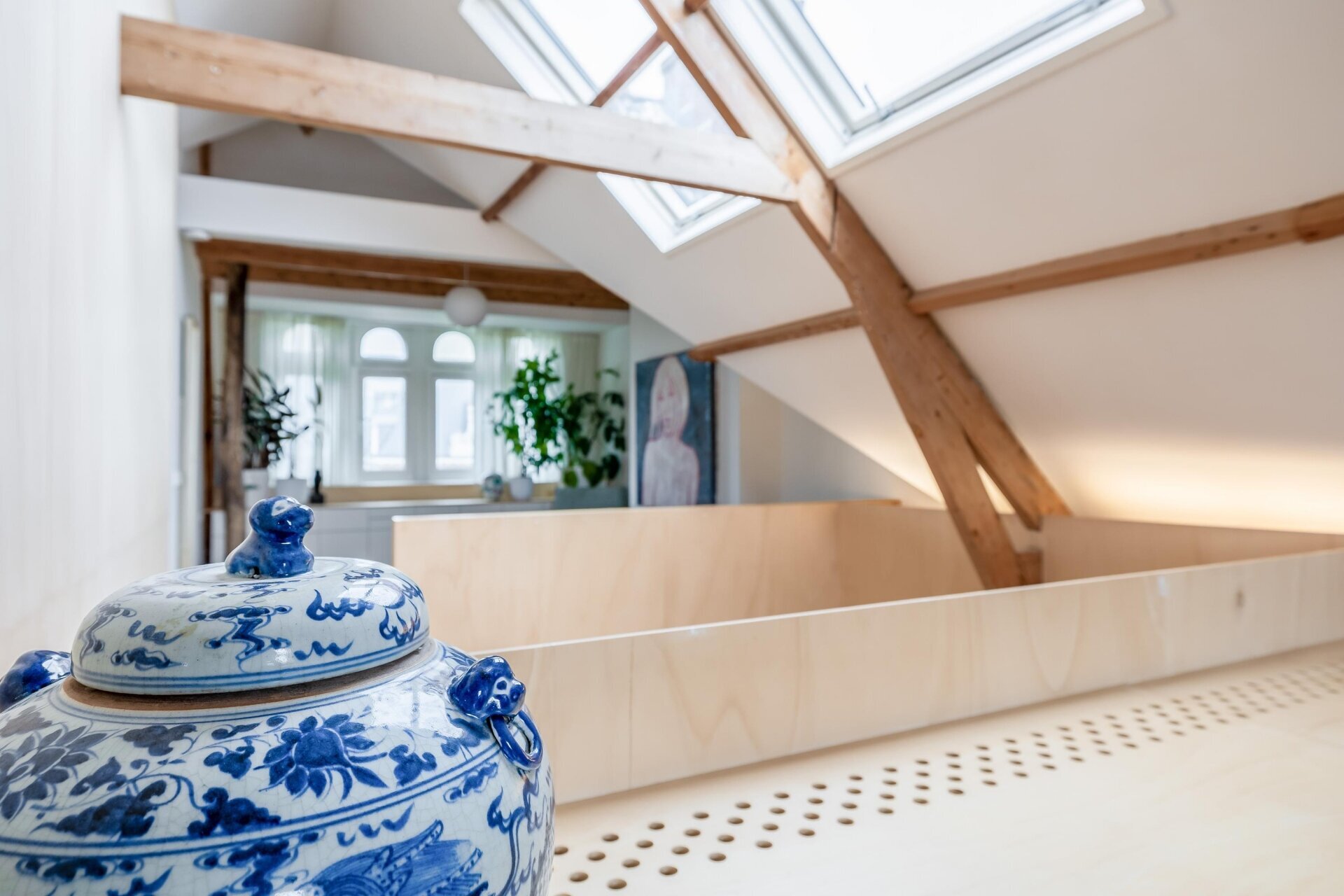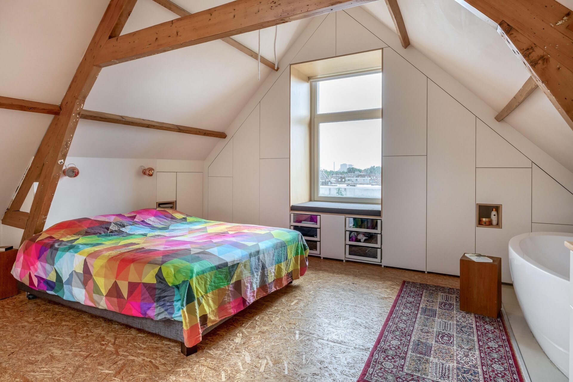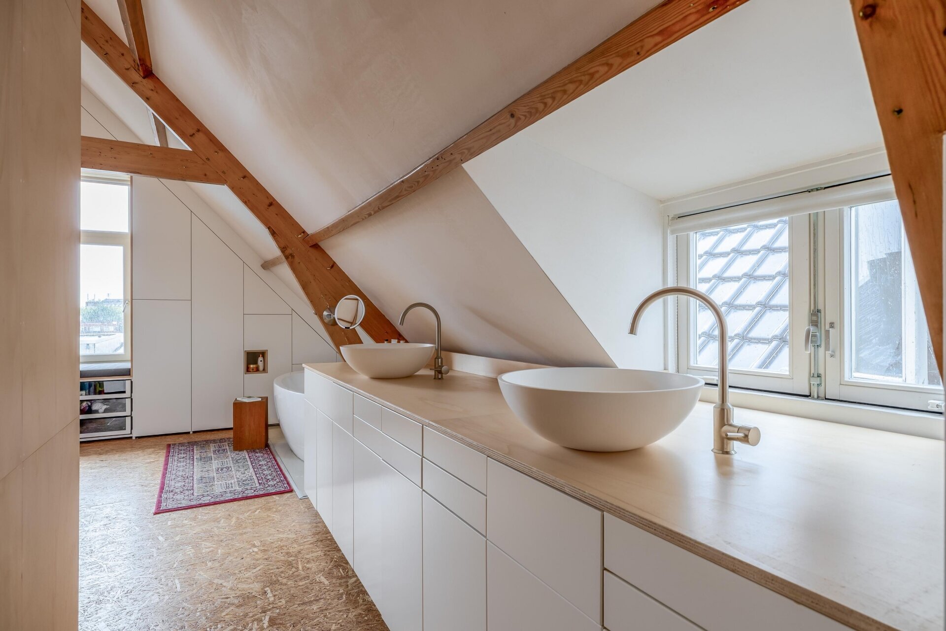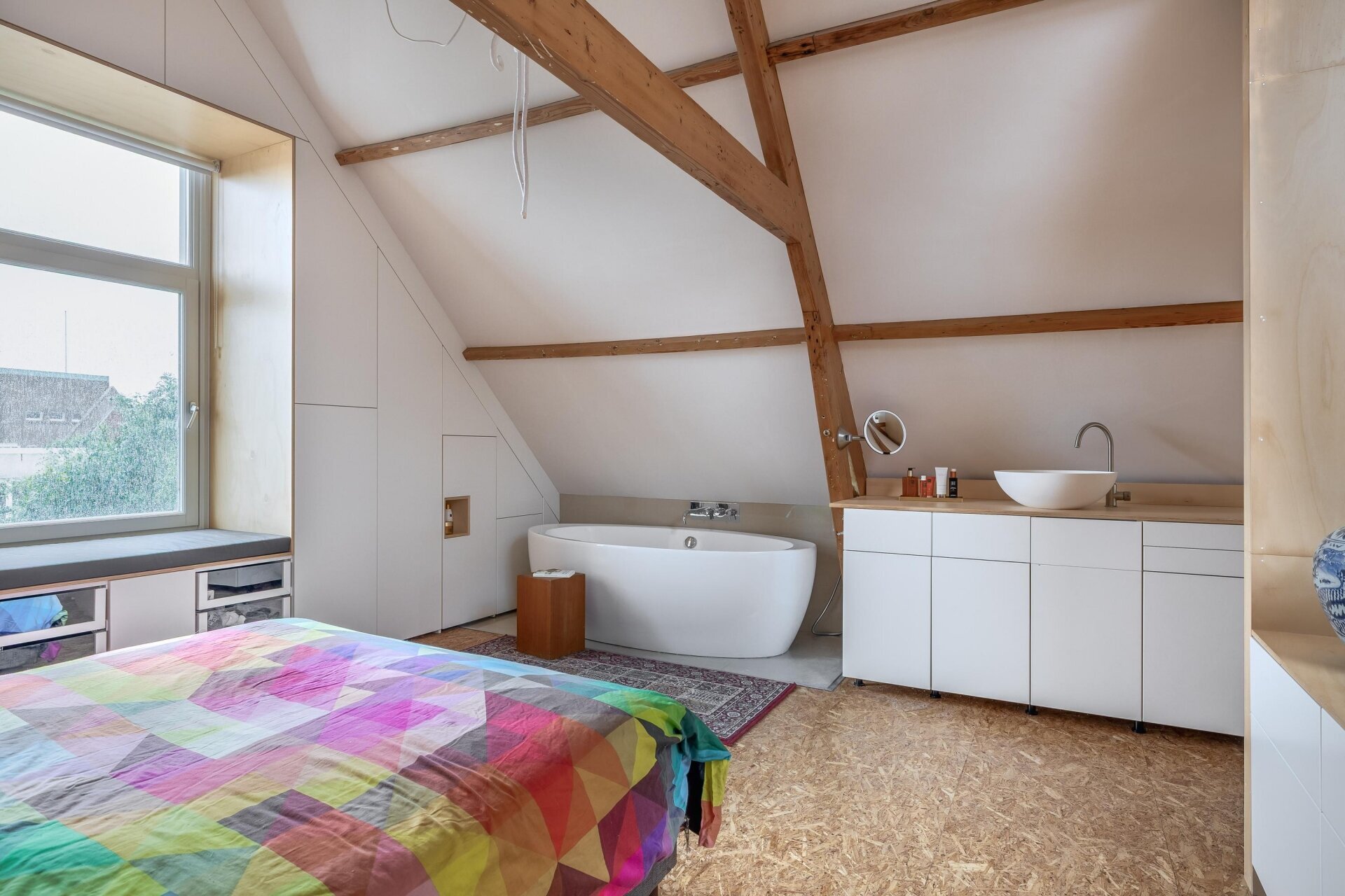 De vierde verdieping is nu ingericht als open slaap- en badruimte, met zichtbare houten balken, dubbele wastafels, veel opbergruimte en een vrijstaand ligbad. Een heerlijke plek waar je kunt ontspannen en wegkruipen van de drukte van de dag. Dankzij het slimme ontwerp is er overal balans tussen karakter, openheid en privacy.