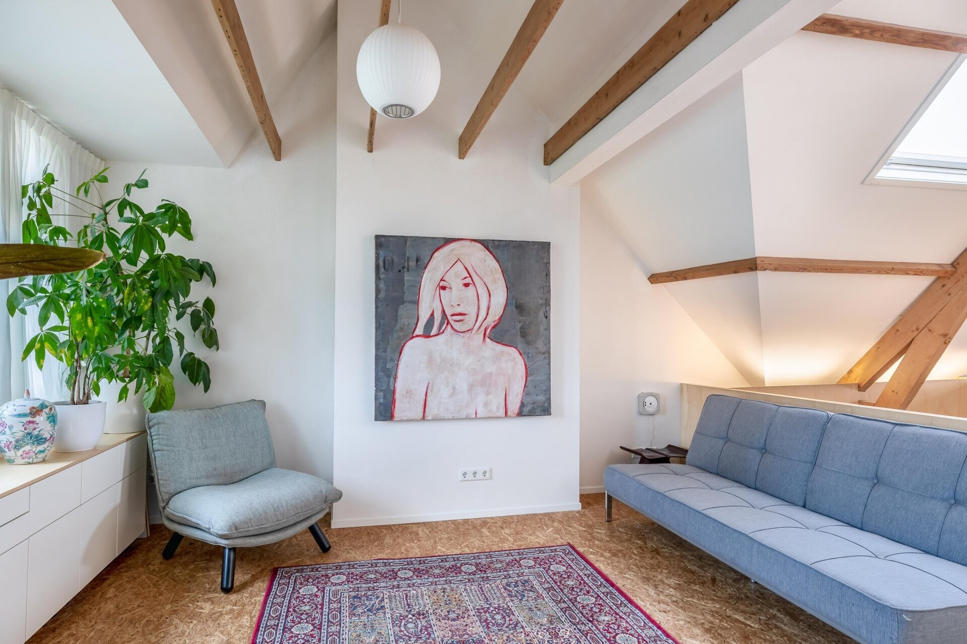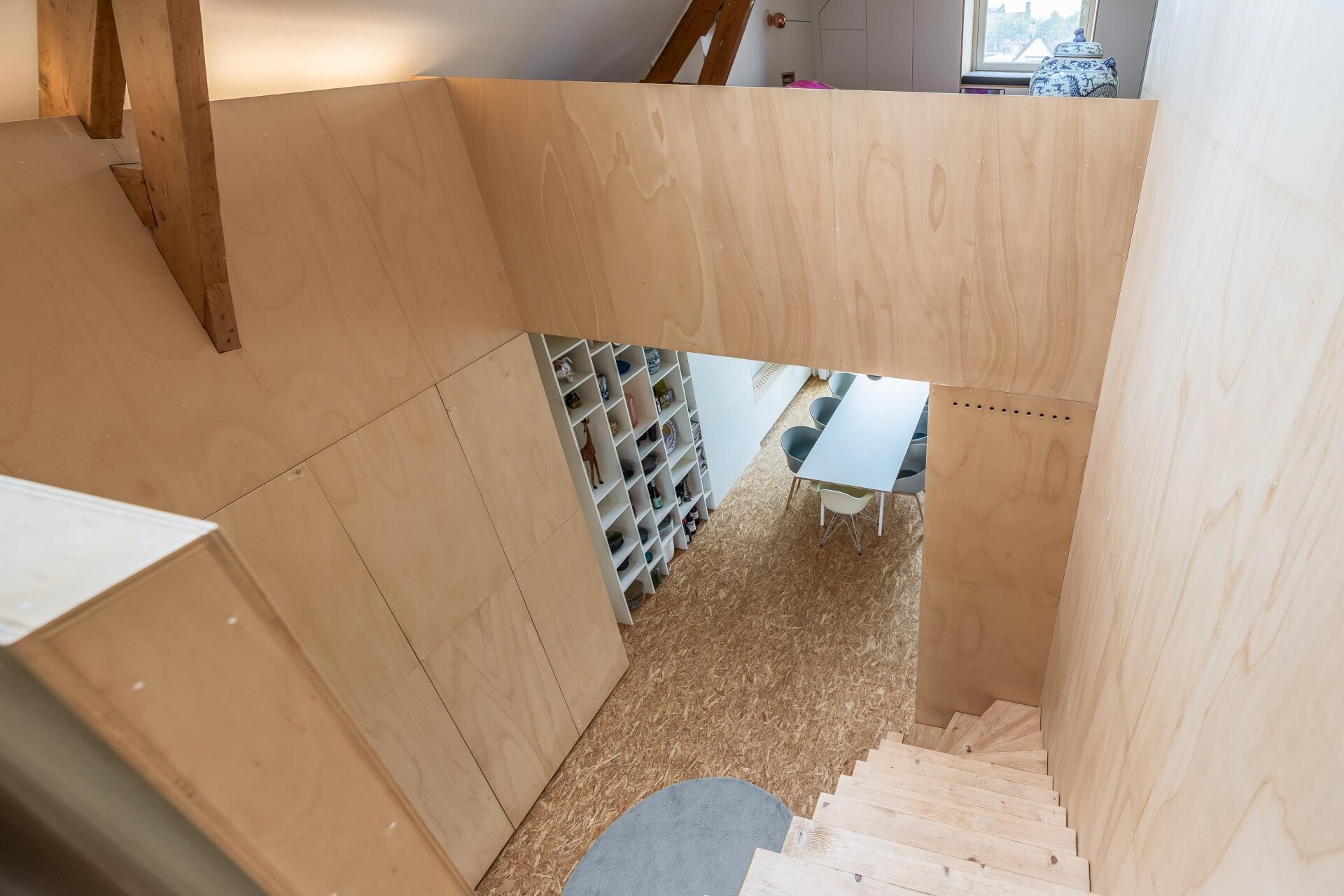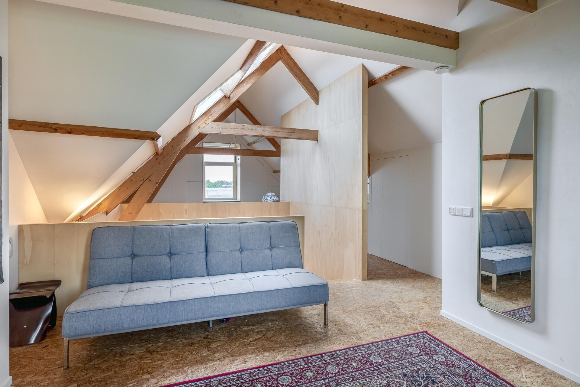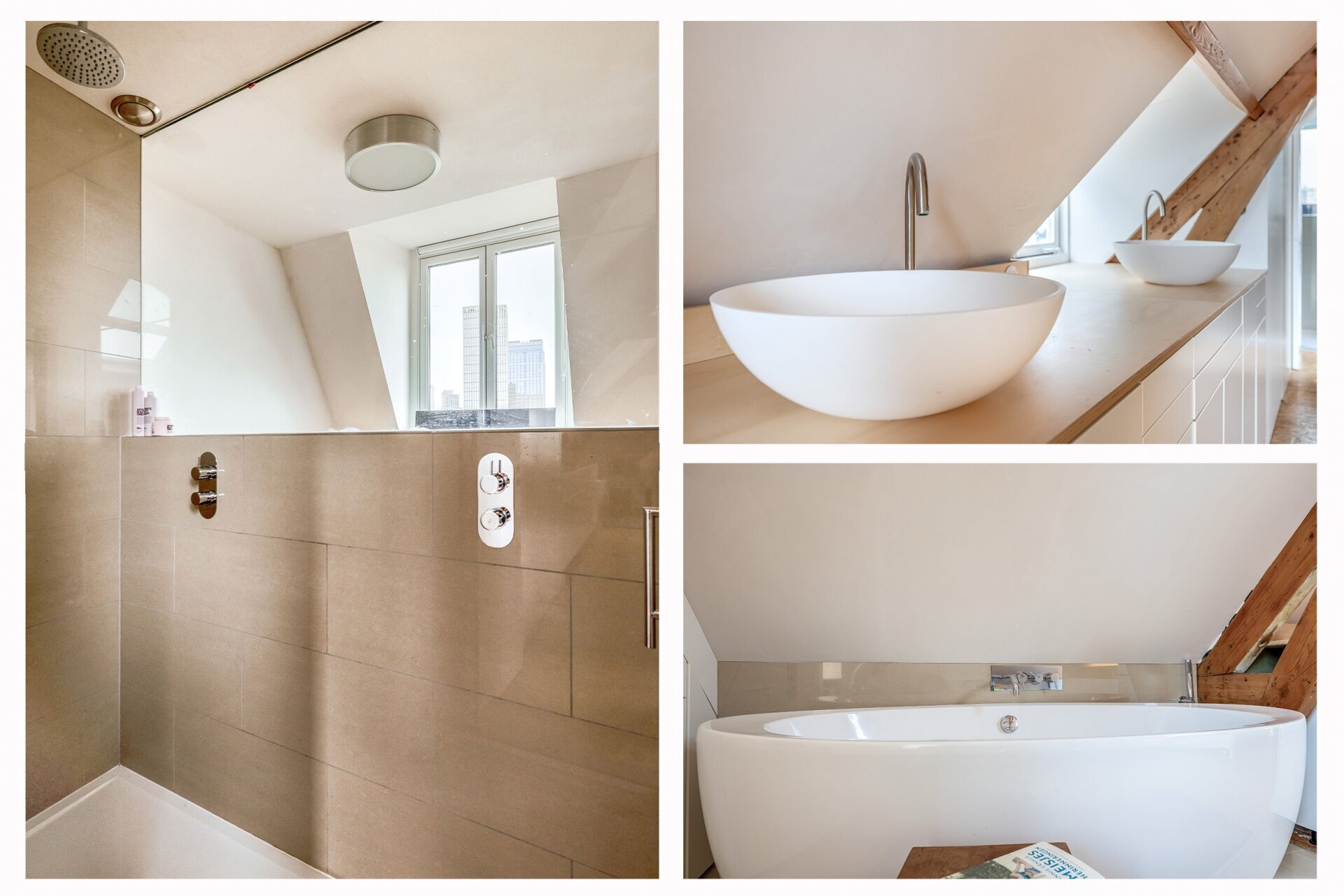 De vierde verdieping is nu ingericht als open slaap- en badruimte, met zichtbare houten balken, dubbele wastafels, veel opbergruimte en een vrijstaand ligbad. Een heerlijke plek waar je kunt ontspannen en wegkruipen van de drukte van de dag. Dankzij het slimme ontwerp is er overal balans tussen karakter, openheid en privacy.