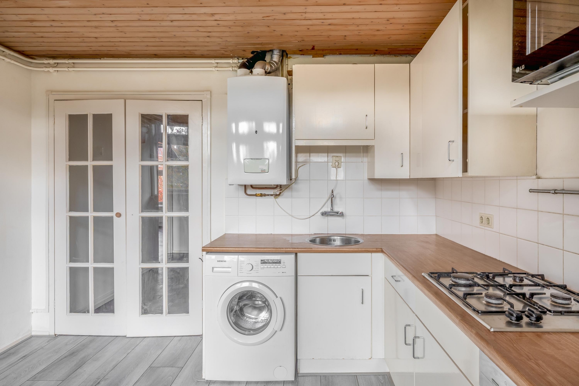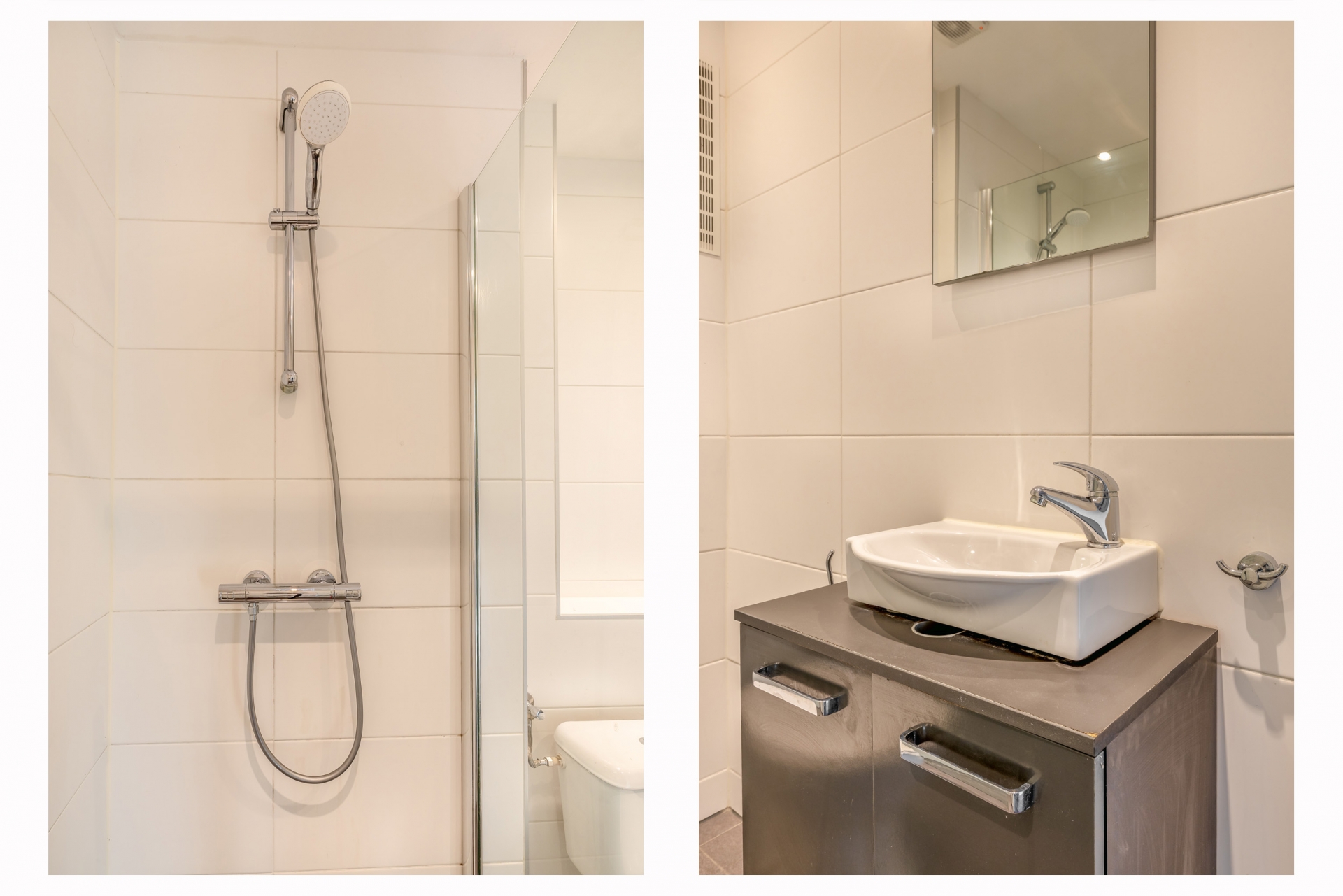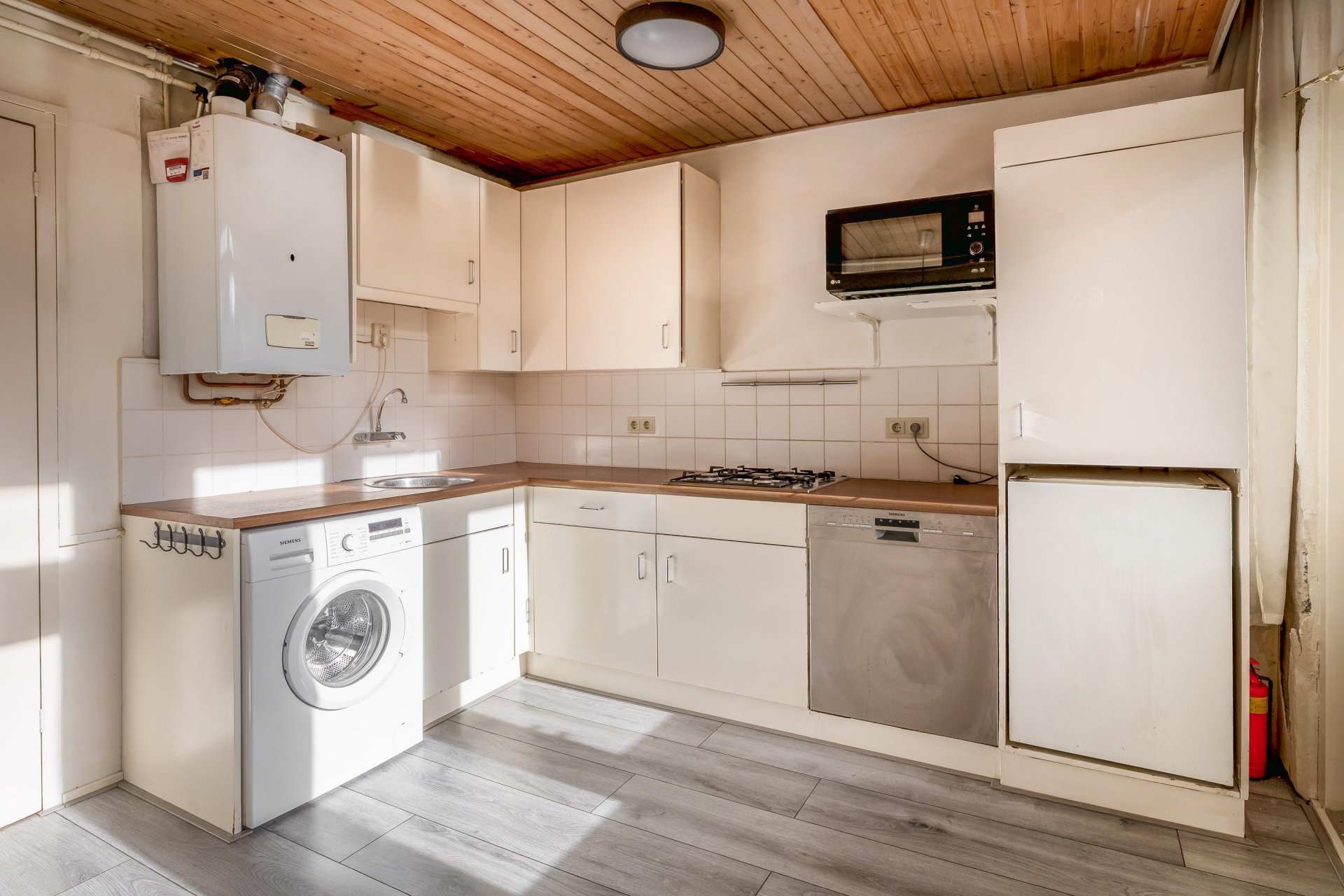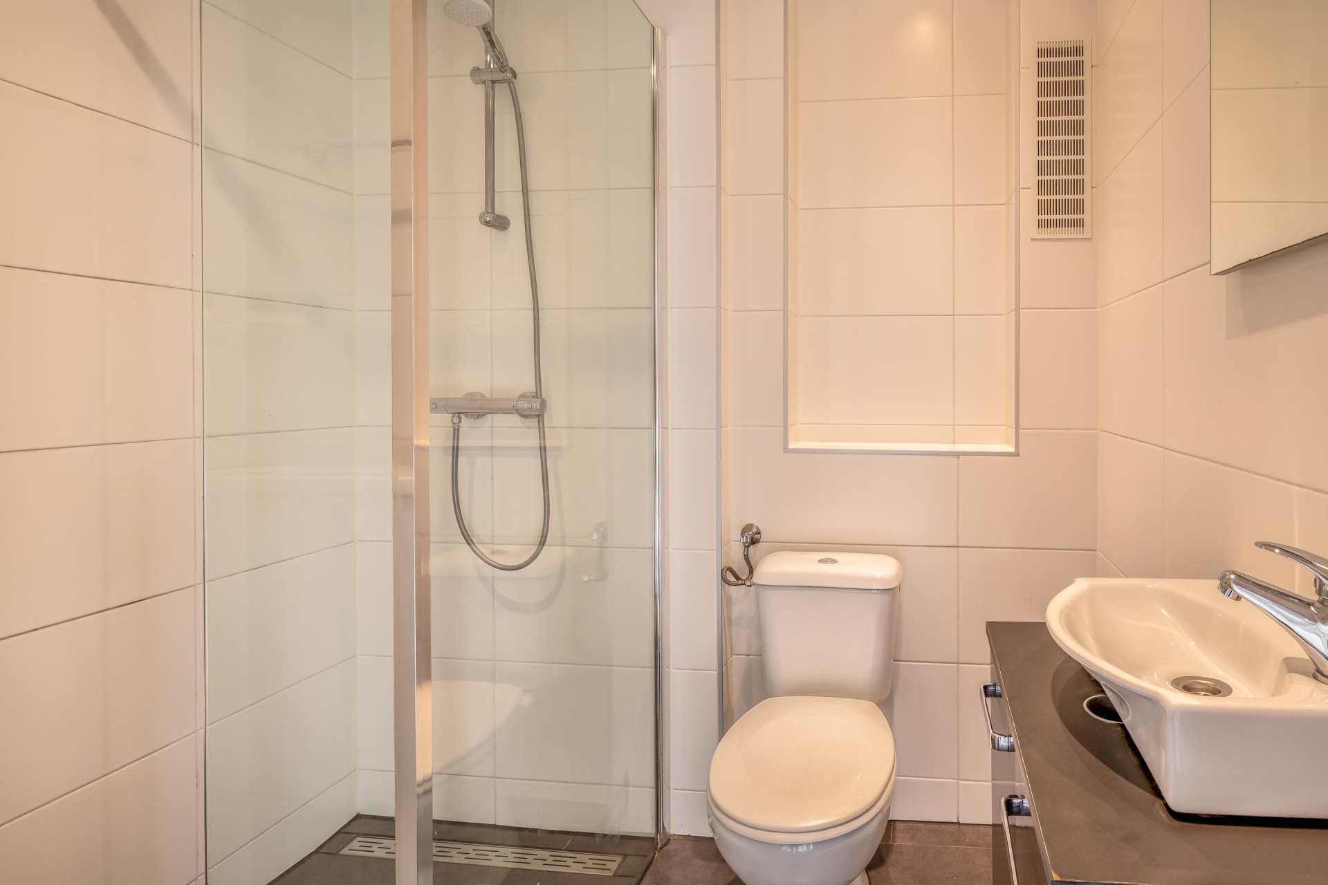 De keuken is eenvoudig uitgevoerd maar netjes en praktisch ingedeeld. De badkamer is voorzien van een douche, wastafel en toilet.