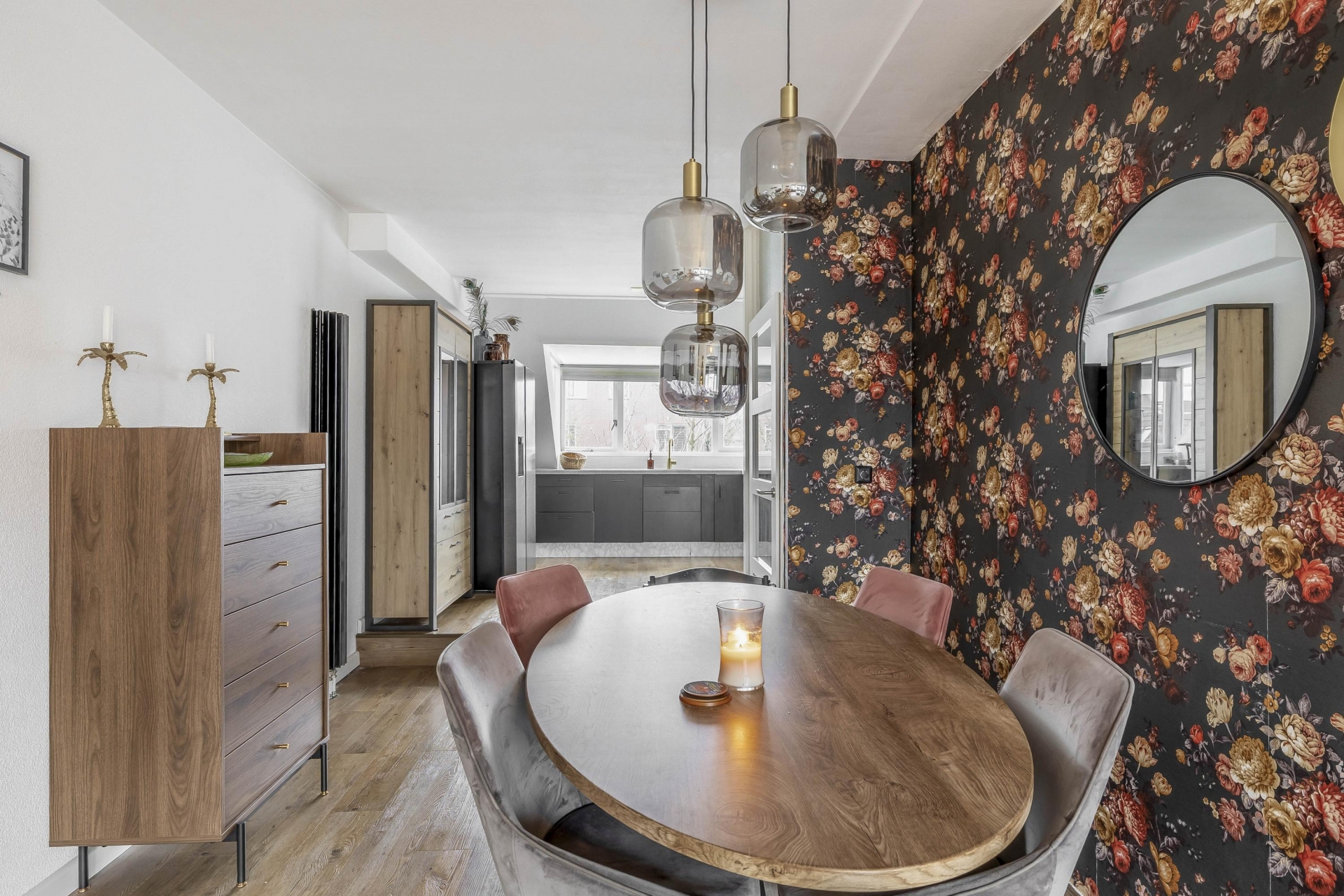 De eerste woonlaag is verrassend ruim en strak afgewerkt, met een warme houten vloer en lichte wanden die zorgen voor een prettige sfeer. De woonkamer voelt open en uitnodigend aan, met genoeg plek voor een gezellige zithoek en een aparte eethoek. Blikvanger is de sfeervolle gashaard, perfect voor koude avonden of gewoon voor wat extra gezelligheid. En ook in de zomer zit je hier en boven comfortabel, want in 2025 zijn er airco's geplaatst waarmee je het hele jaar door een aangenaam binnenklimaat hebt.
