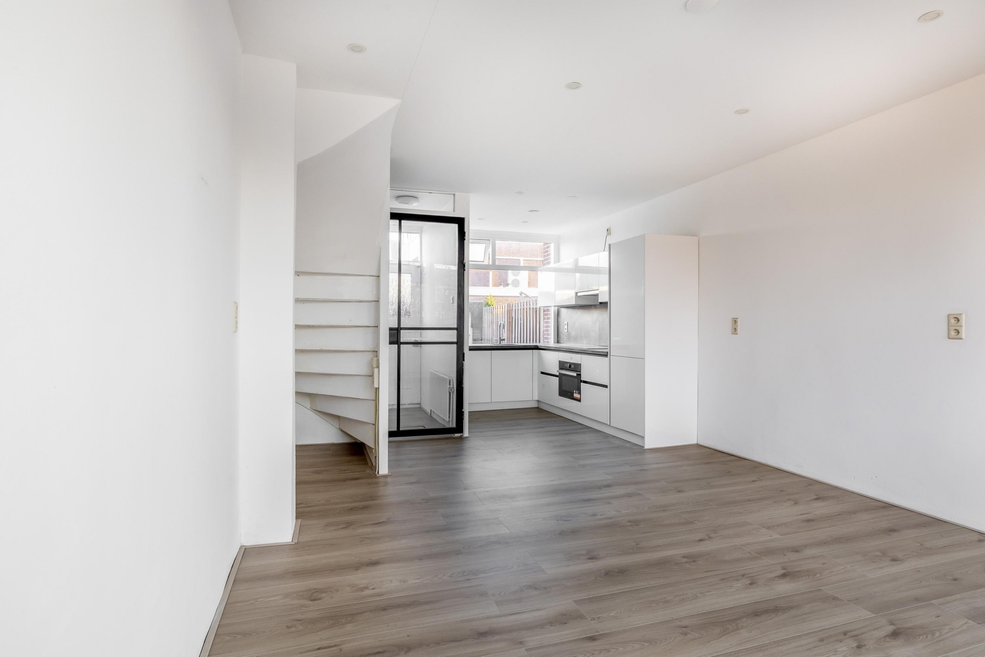Zodra je binnenkomt valt de open indeling direct op. De woonkamer is lekker licht dankzij de grote raampartijen aan de voor- en achterzijde, en biedt genoeg plek voor een zithoek en een eettafel. De moderne keuken aan de voorzijde is recent vernieuwd en voorzien van een strak, greeploos ontwerp met veel opbergruimte en inbouwapparatuur. Dankzij het grote raam kijk je uit op de achtertuin en stap je via een deur zo je achtertuin in.