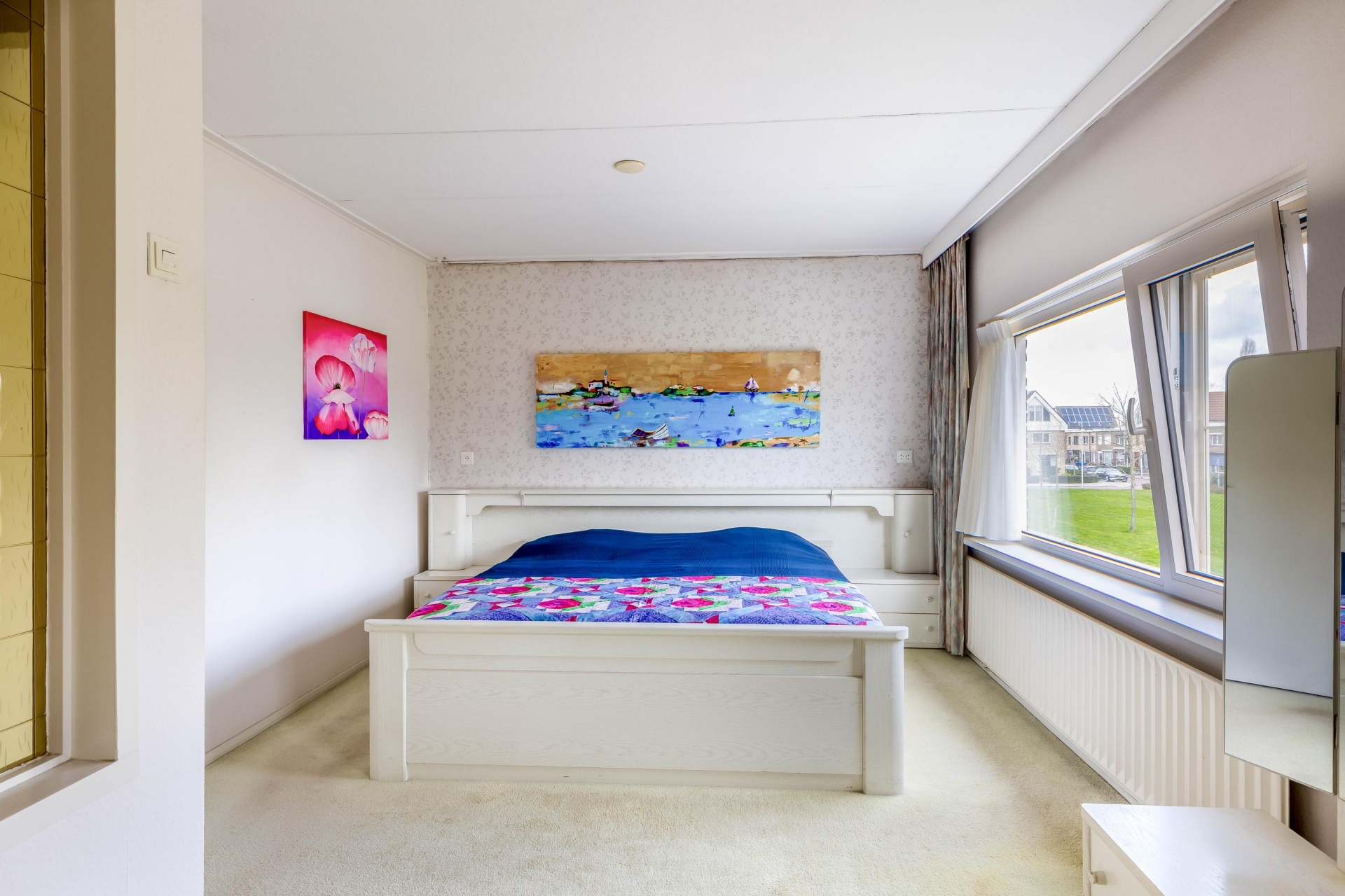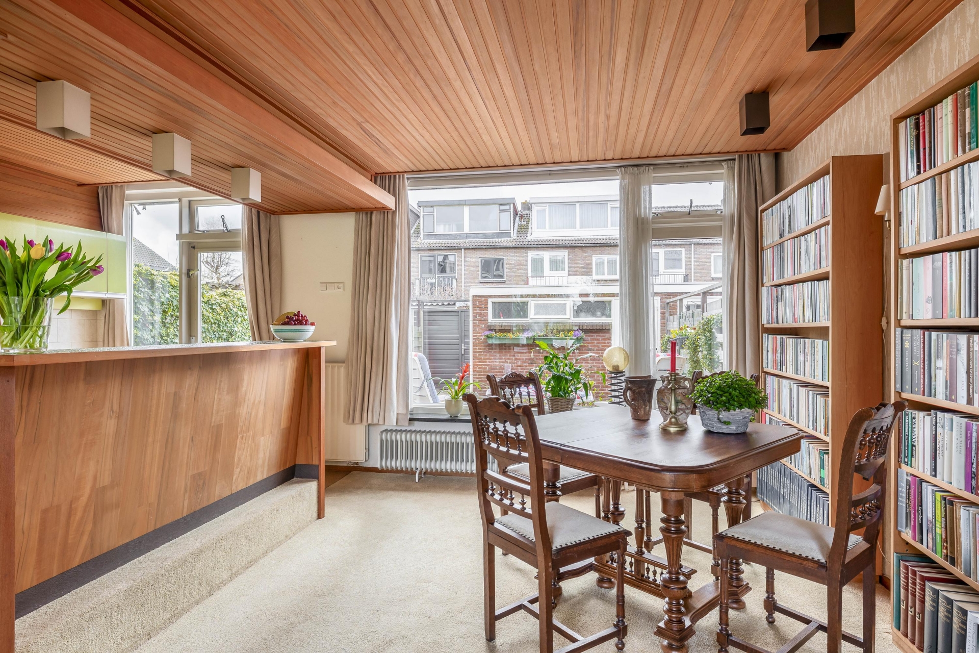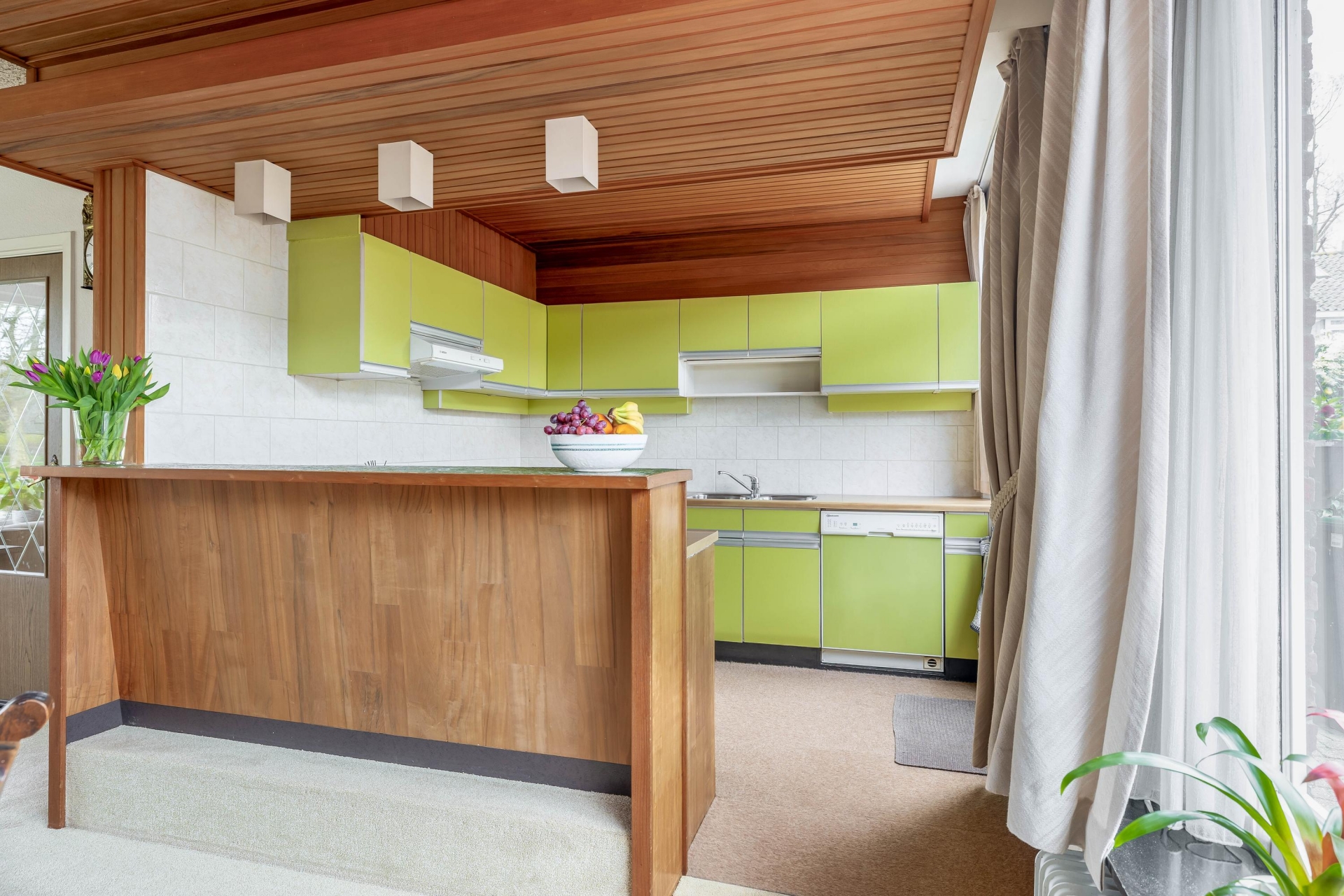 Bij binnenkomst valt direct op dat dit een huis is waar je nog echt je eigen draai aan kunt geven. De doorzonwoonkamer is lekker licht door de grote raampartijen aan zowel de voor- als achterzijde. Aan de voorkant kijk je vrij uit over het groen, terwijl je aan de achterzijde zicht hebt op de tuin.
