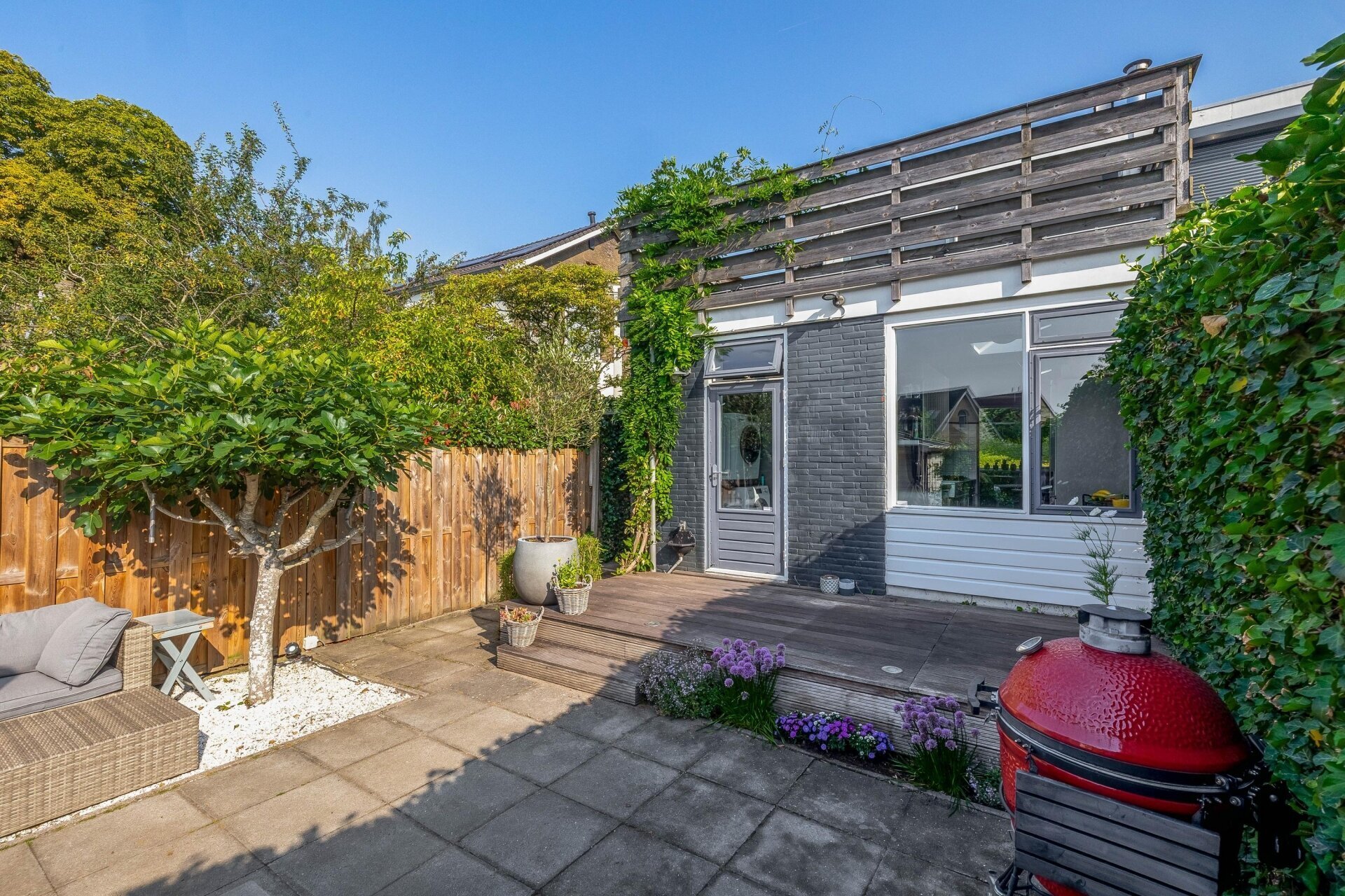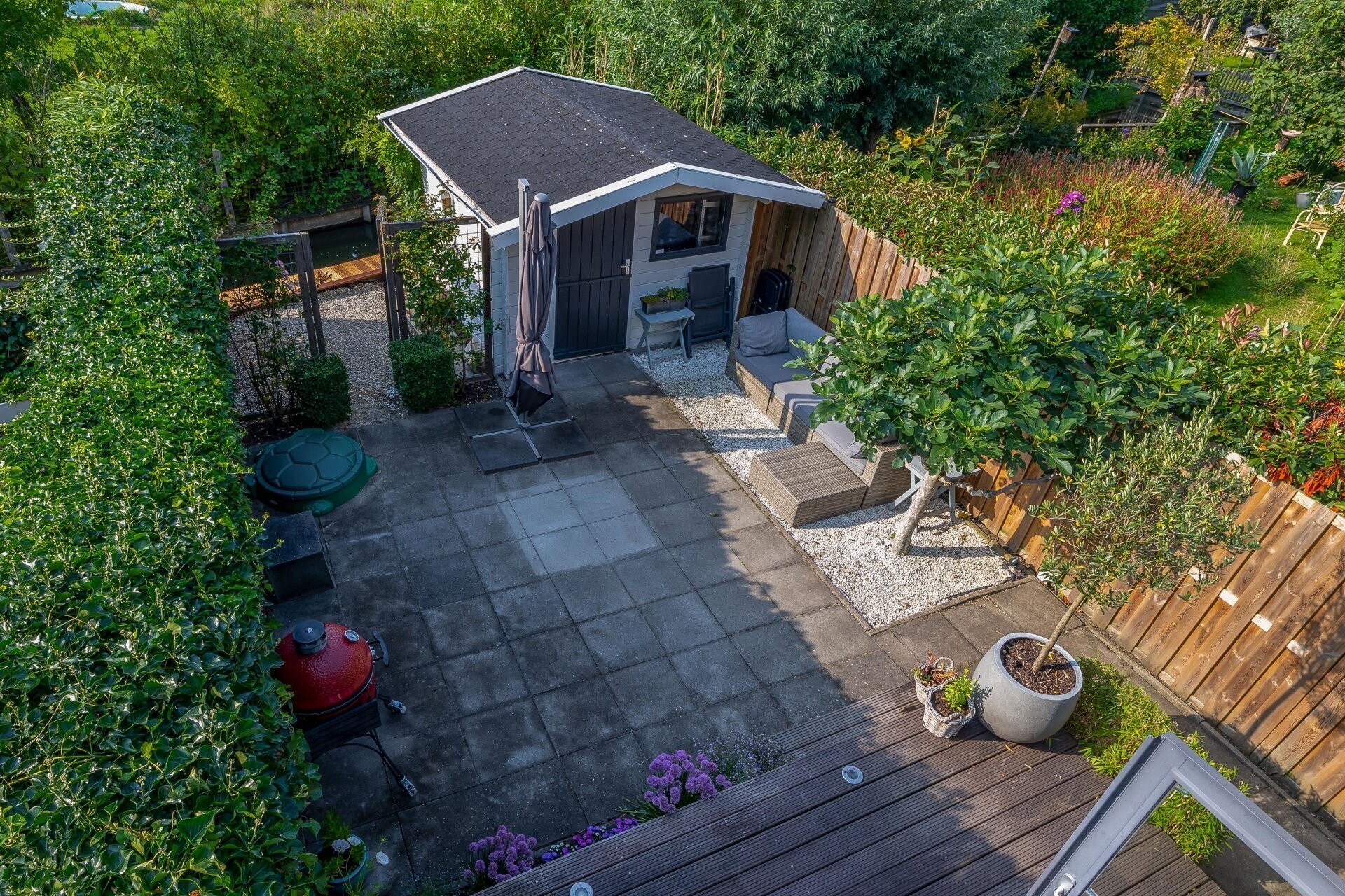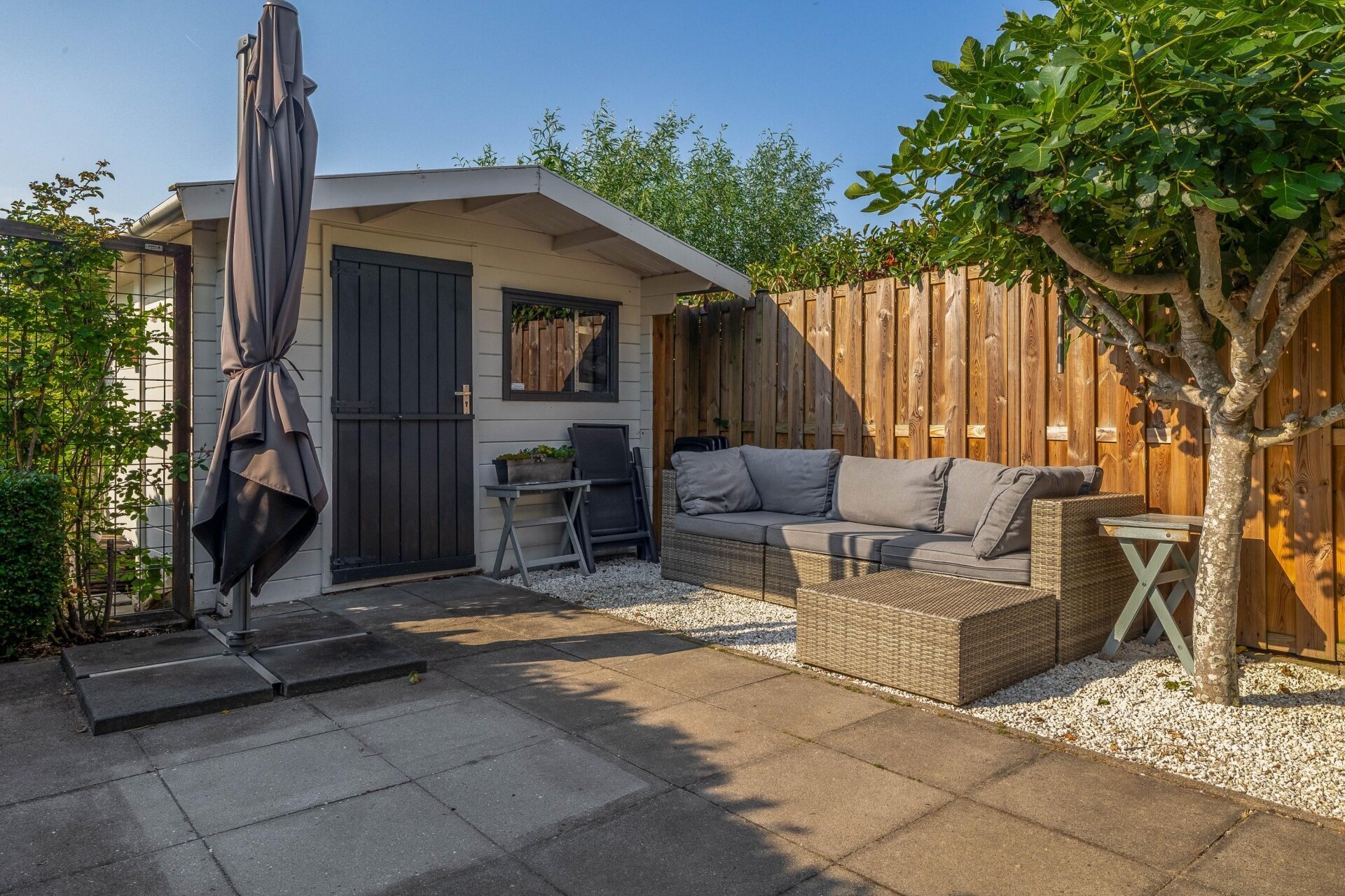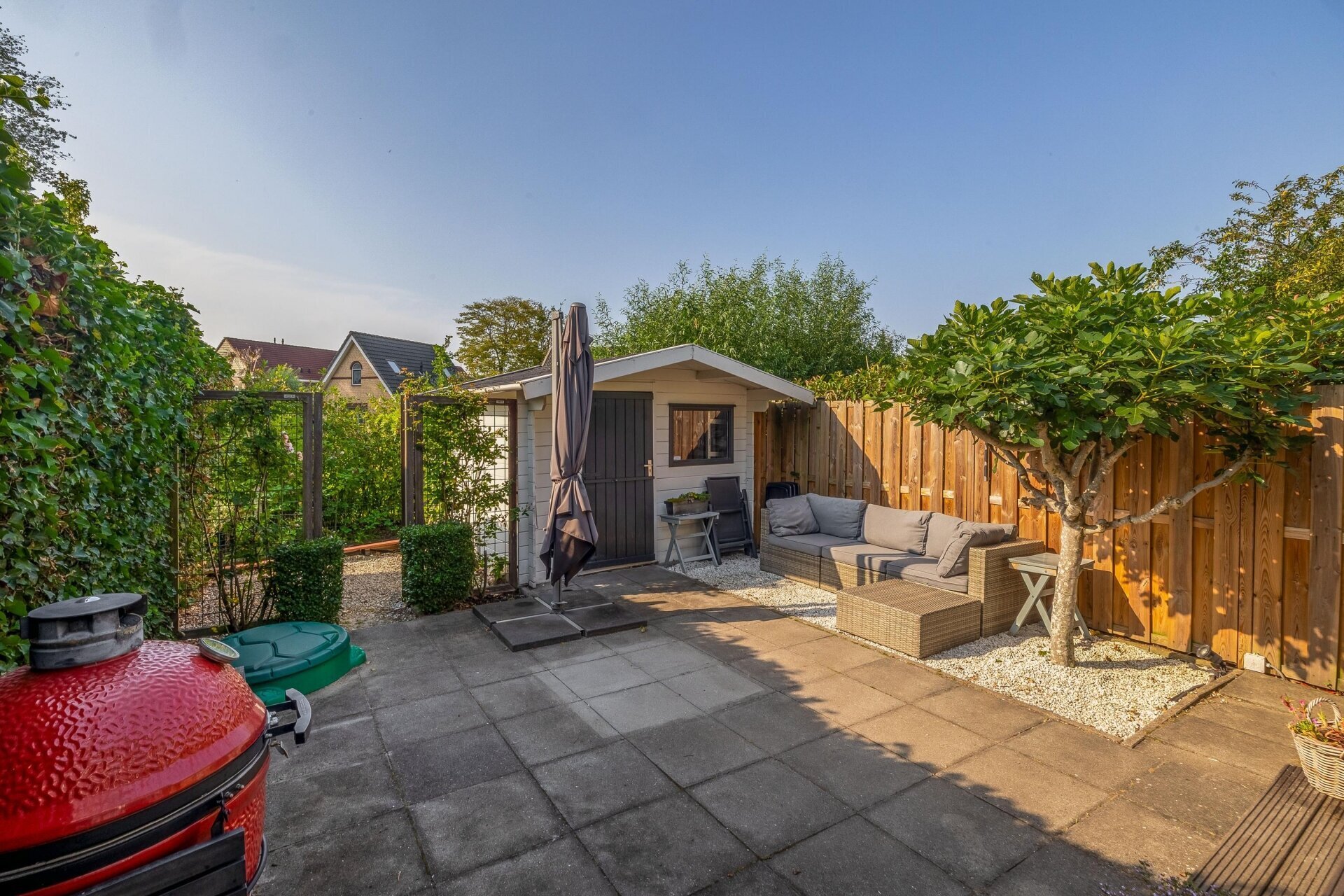 Via de achterdeur kom je in de verrassend ruime en fraai aangelegde tuin – een echt pluspunt van deze woning. De tuin ligt op het zuiden, dus zon is hier (bij goed weer) gegarandeerd. De combinatie van groen, bestrating, een sfeervol terras én een berging maakt dit tot een tuin waar je het hele voorjaar en zomer met plezier doorbrengt. Achterin is er een knusse zithoek gecreëerd – perfect voor een rustige ochtend met koffie of een barbecue met vrienden.