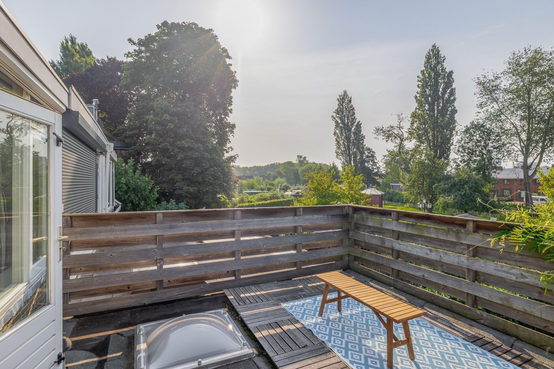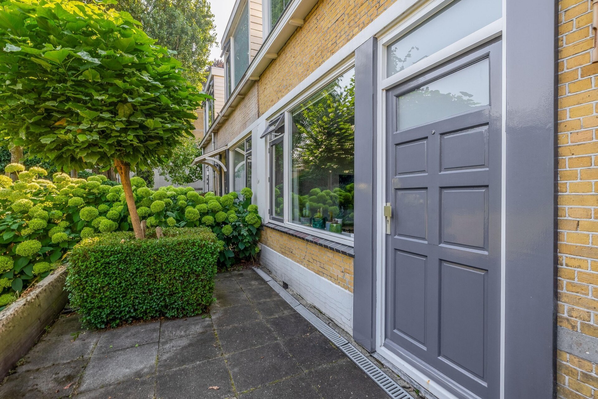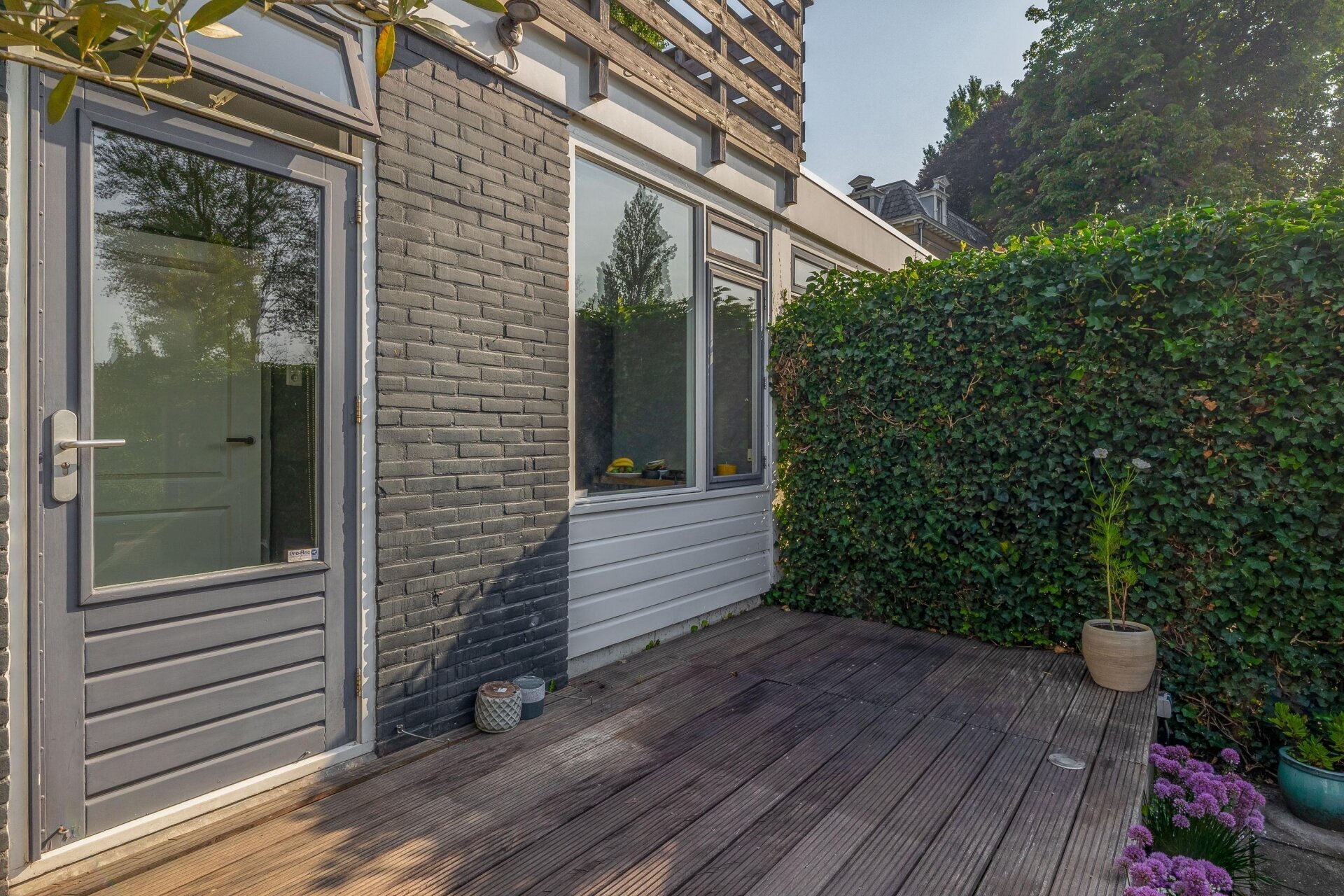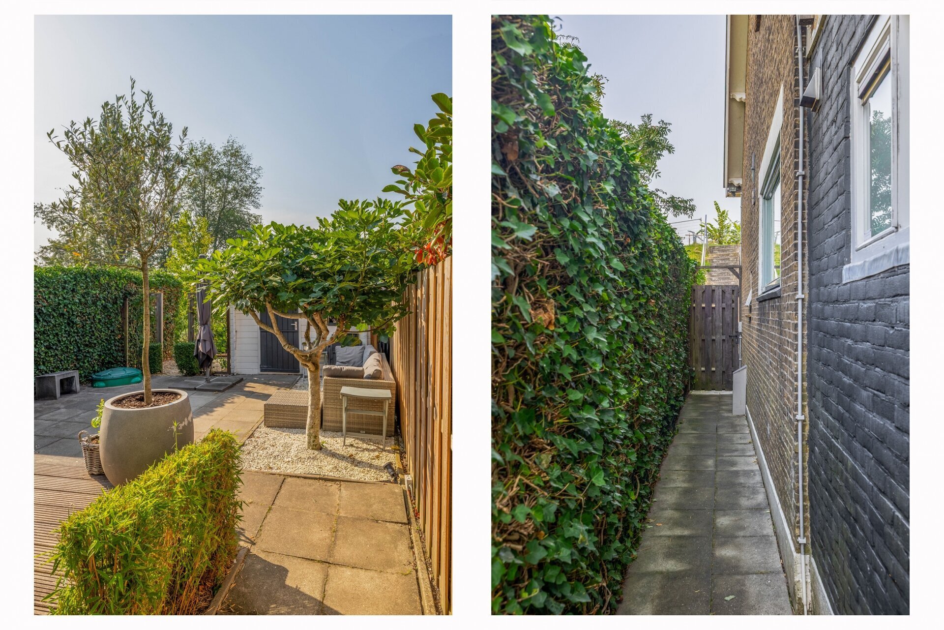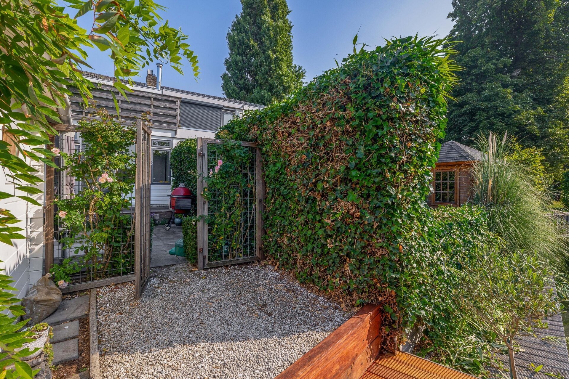Via de achterdeur kom je in de verrassend ruime en fraai aangelegde tuin – een echt pluspunt van deze woning. De tuin ligt op het zuiden, dus zon is hier (bij goed weer) gegarandeerd. De combinatie van groen, bestrating, een sfeervol terras én een berging maakt dit tot een tuin waar je het hele voorjaar en zomer met plezier doorbrengt. Achterin is er een knusse zithoek gecreëerd – perfect voor een rustige ochtend met koffie of een barbecue met vrienden.
