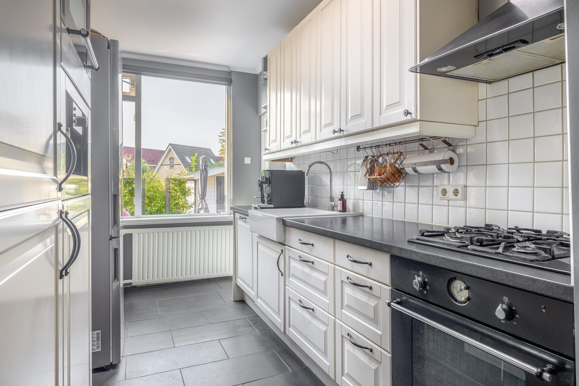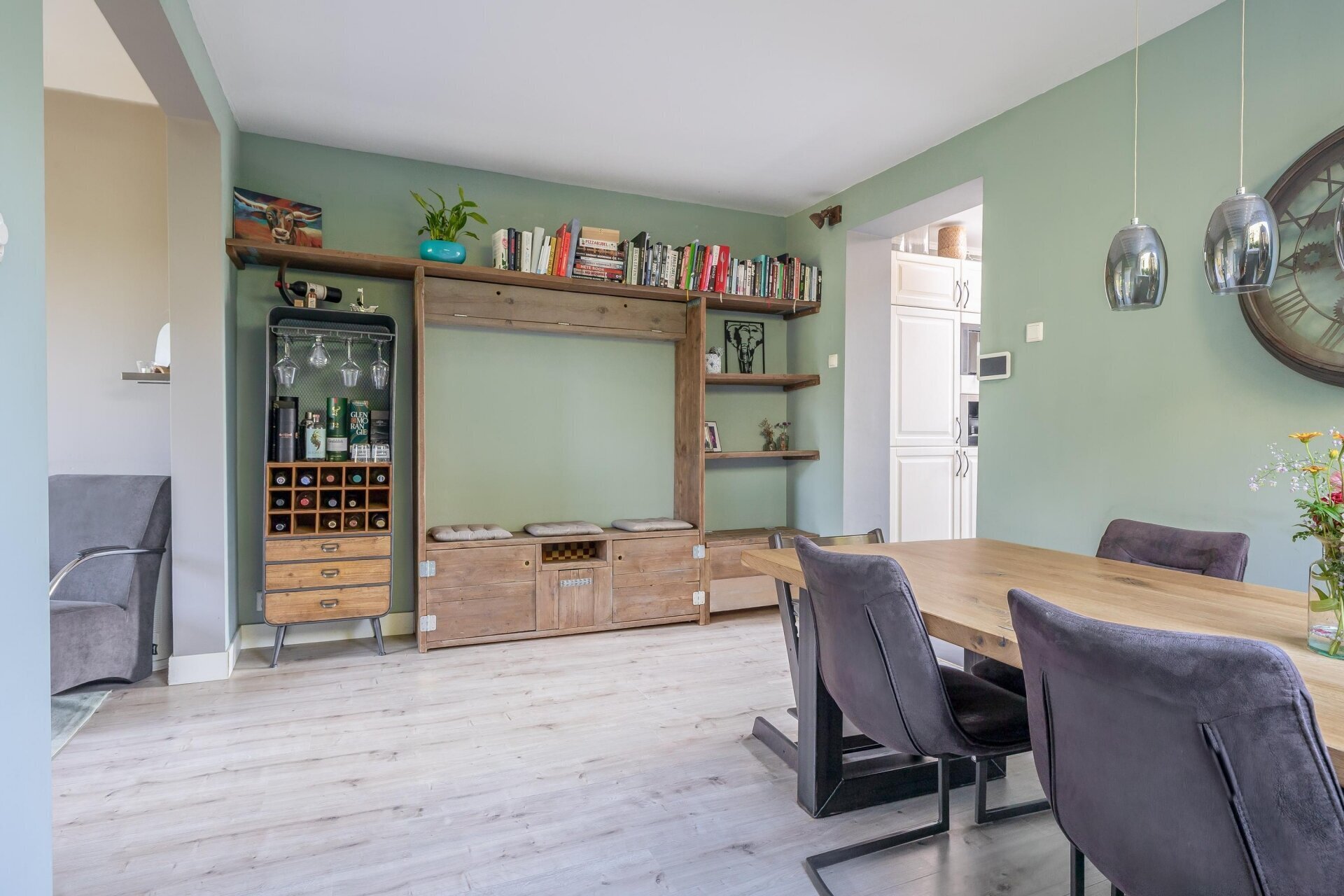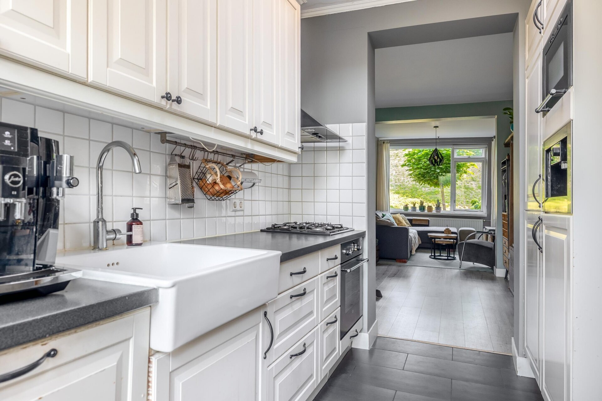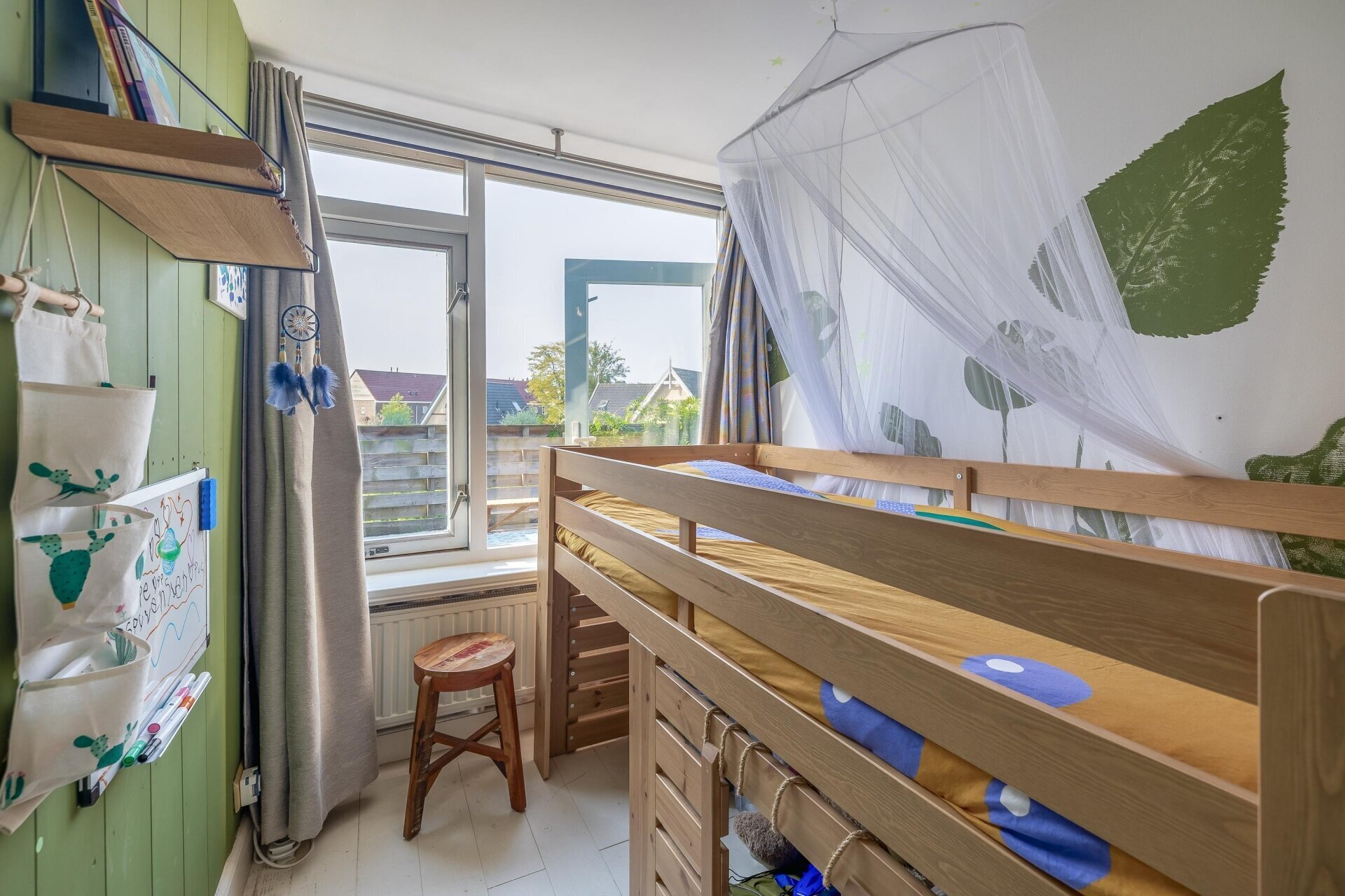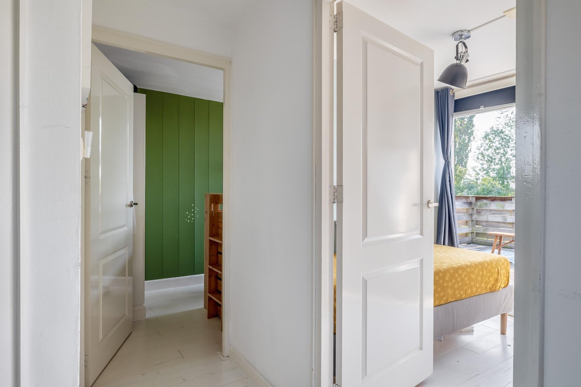Zodra je de woonkamer binnenstapt, valt het vele daglicht op. De grote ramen zorgen voor een open gevoel, terwijl de originele details je herinneren aan de rijke geschiedenis van het huis. Hier is het ’s avonds heerlijk knus en overdag juist een lichte plek om te ontspannen of te werken. De open keuken sluit mooi aan op de leefruimte, waardoor je hier makkelijk contact houdt met gezelschap terwijl je staat te koken. De badkamer is compact maar praktisch ingedeeld, en uiteraard is er ook een separaat toilet aanwezig.