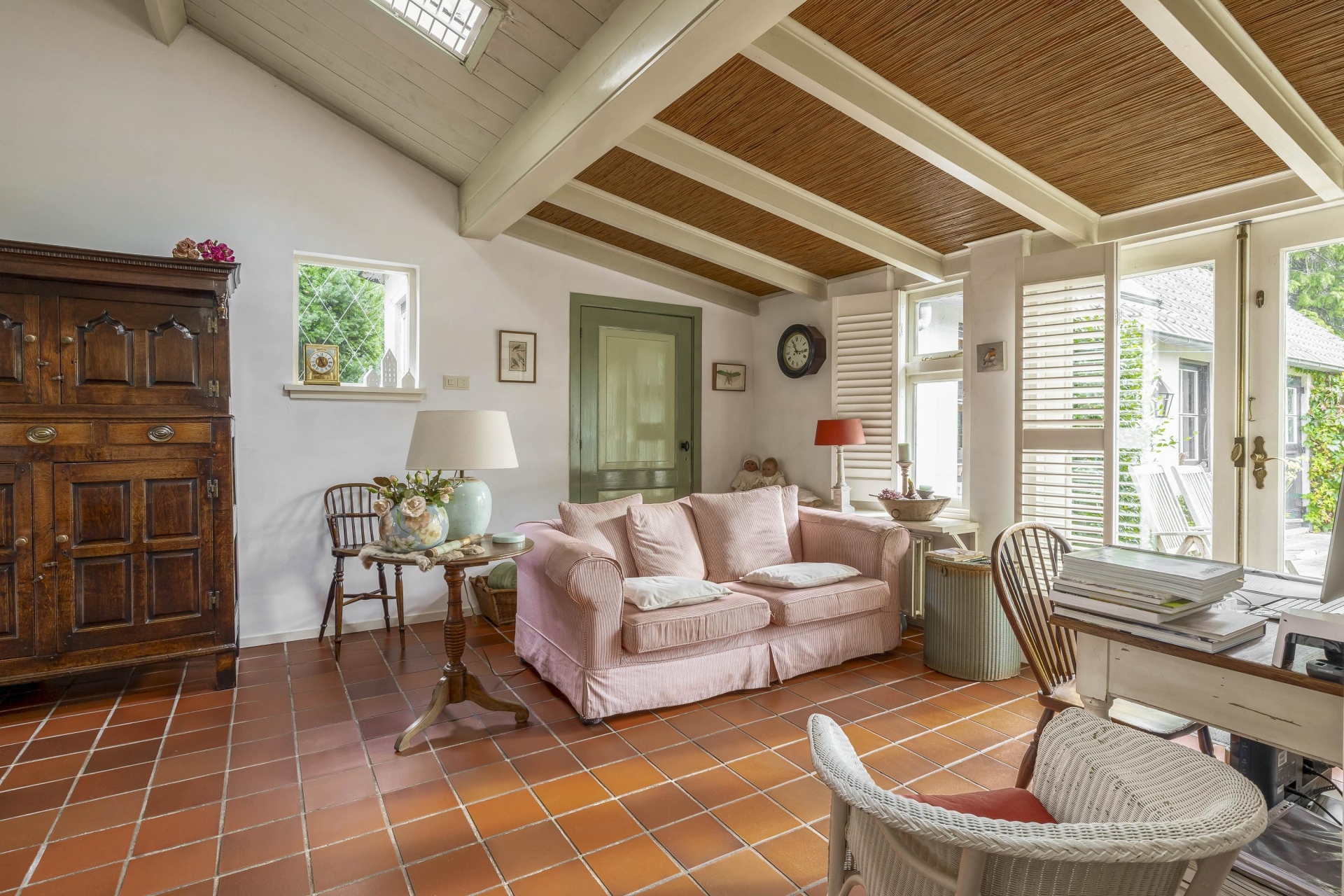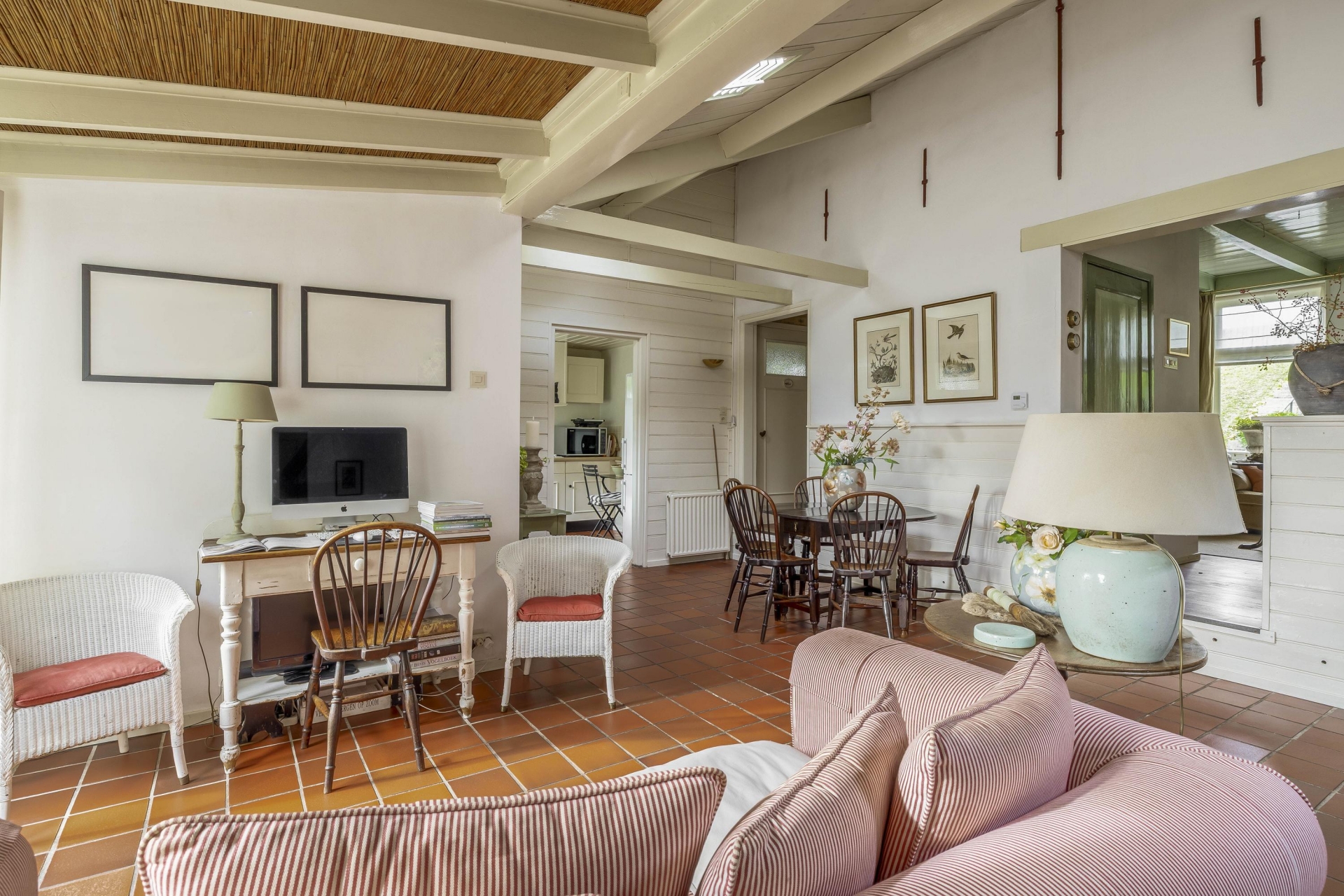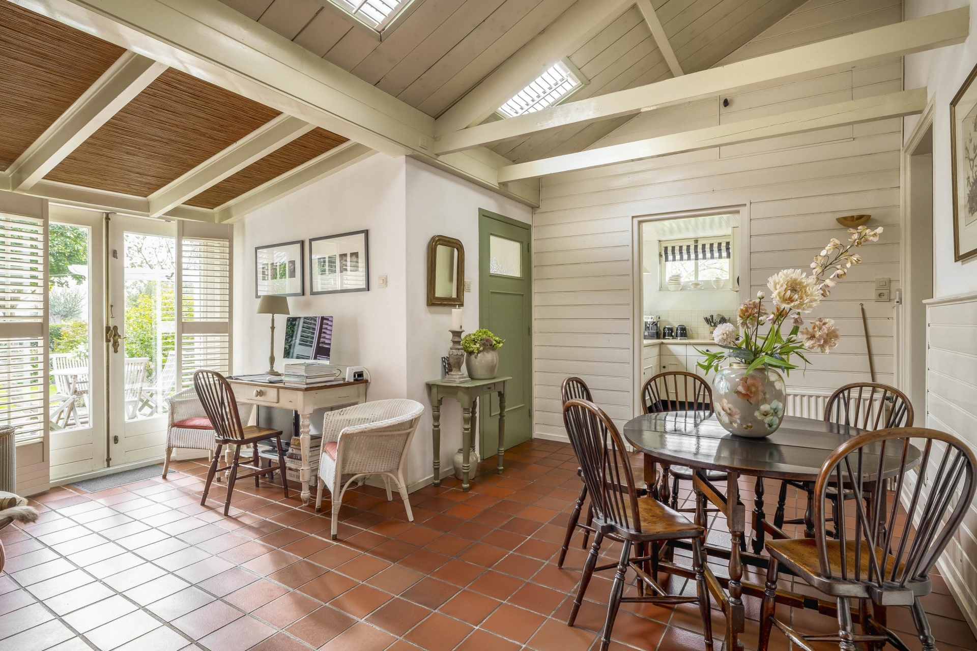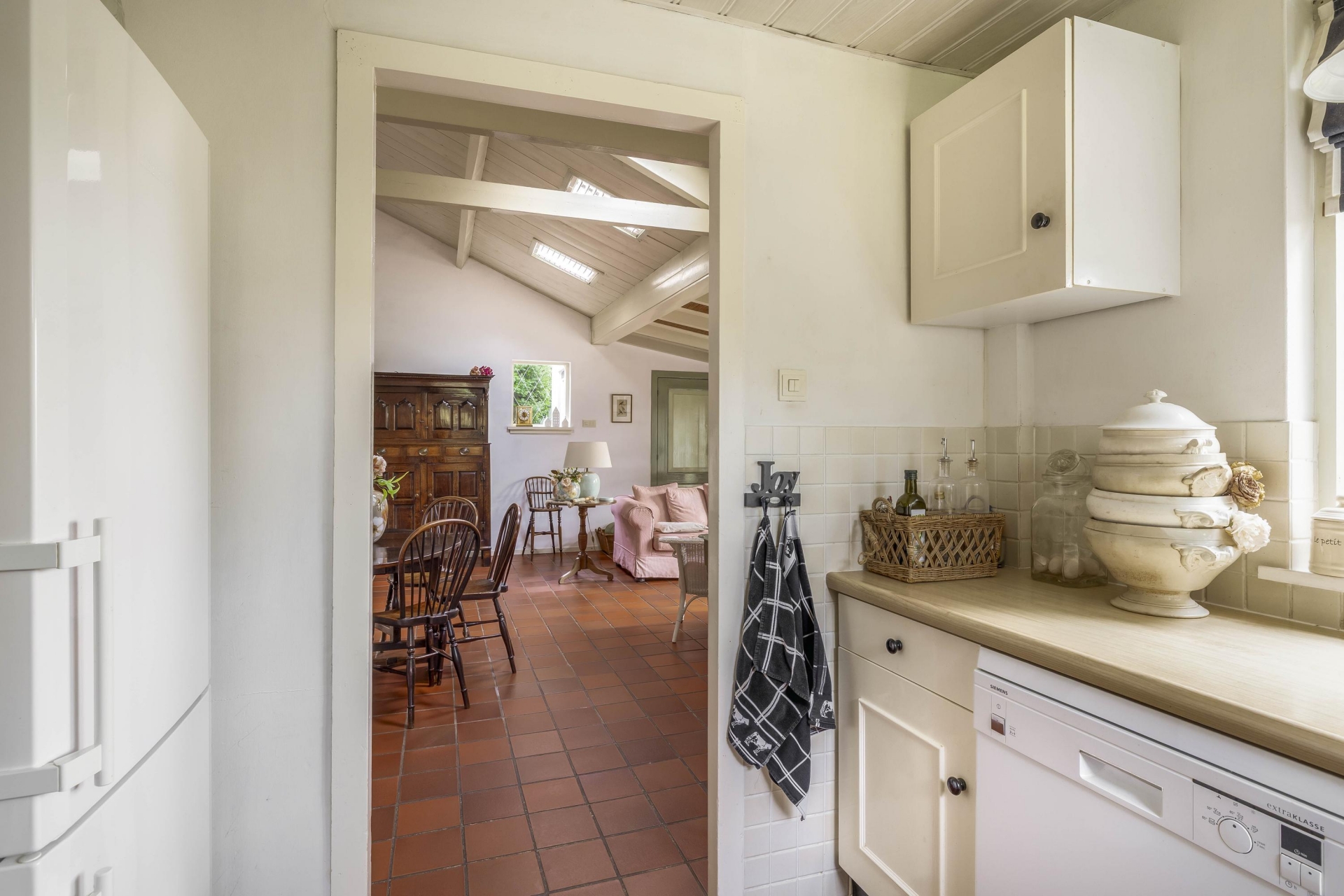 Daarnaast vind je het eetgedeelte/tuinkamer met plavuizenvloer en openslaande deuren naar de tuin – hier voel je de seizoenen binnenkomen. De keuken is eenvoudig, maar netjes.