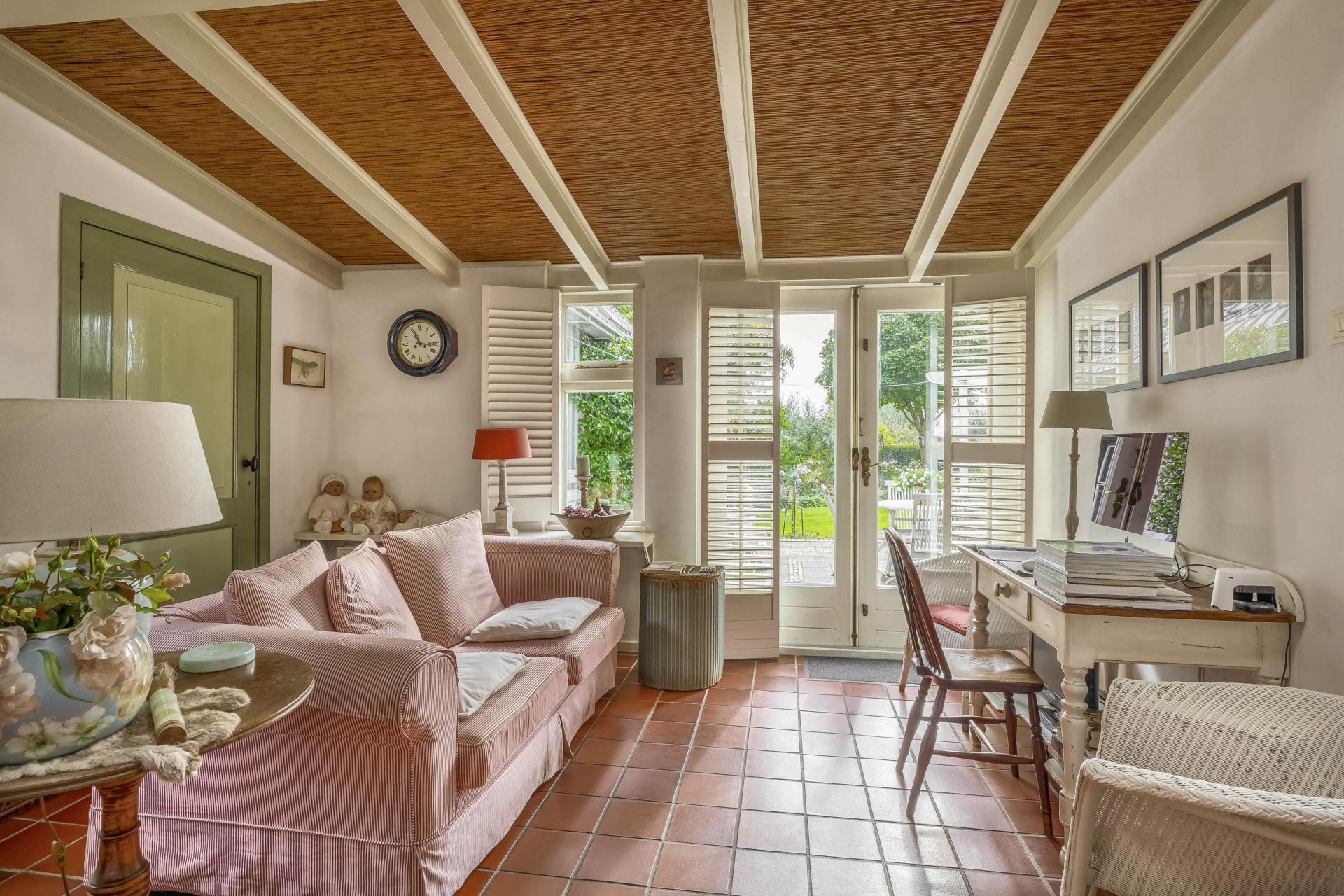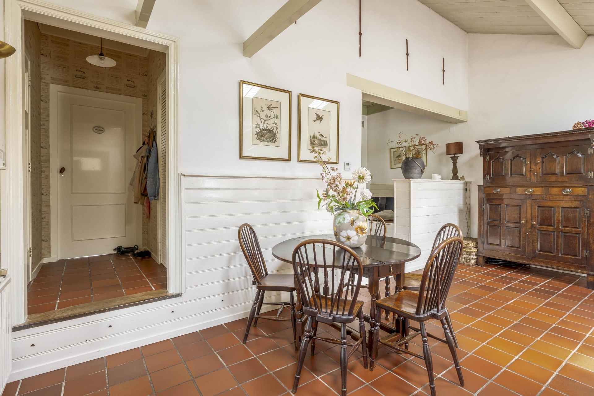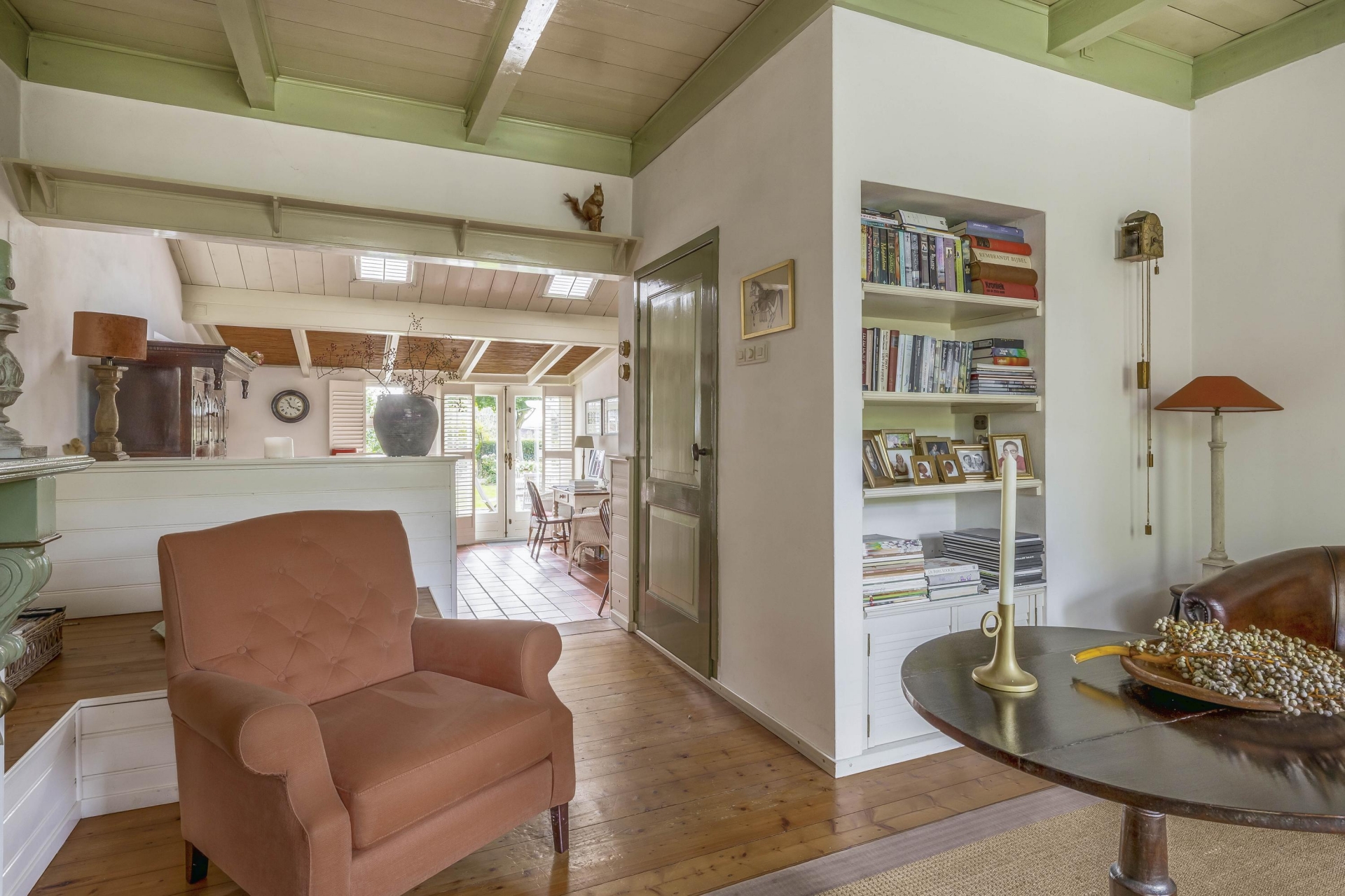Daarnaast vind je het eetgedeelte/tuinkamer met plavuizenvloer en openslaande deuren naar de tuin – hier voel je de seizoenen binnenkomen. De keuken is eenvoudig, maar netjes.