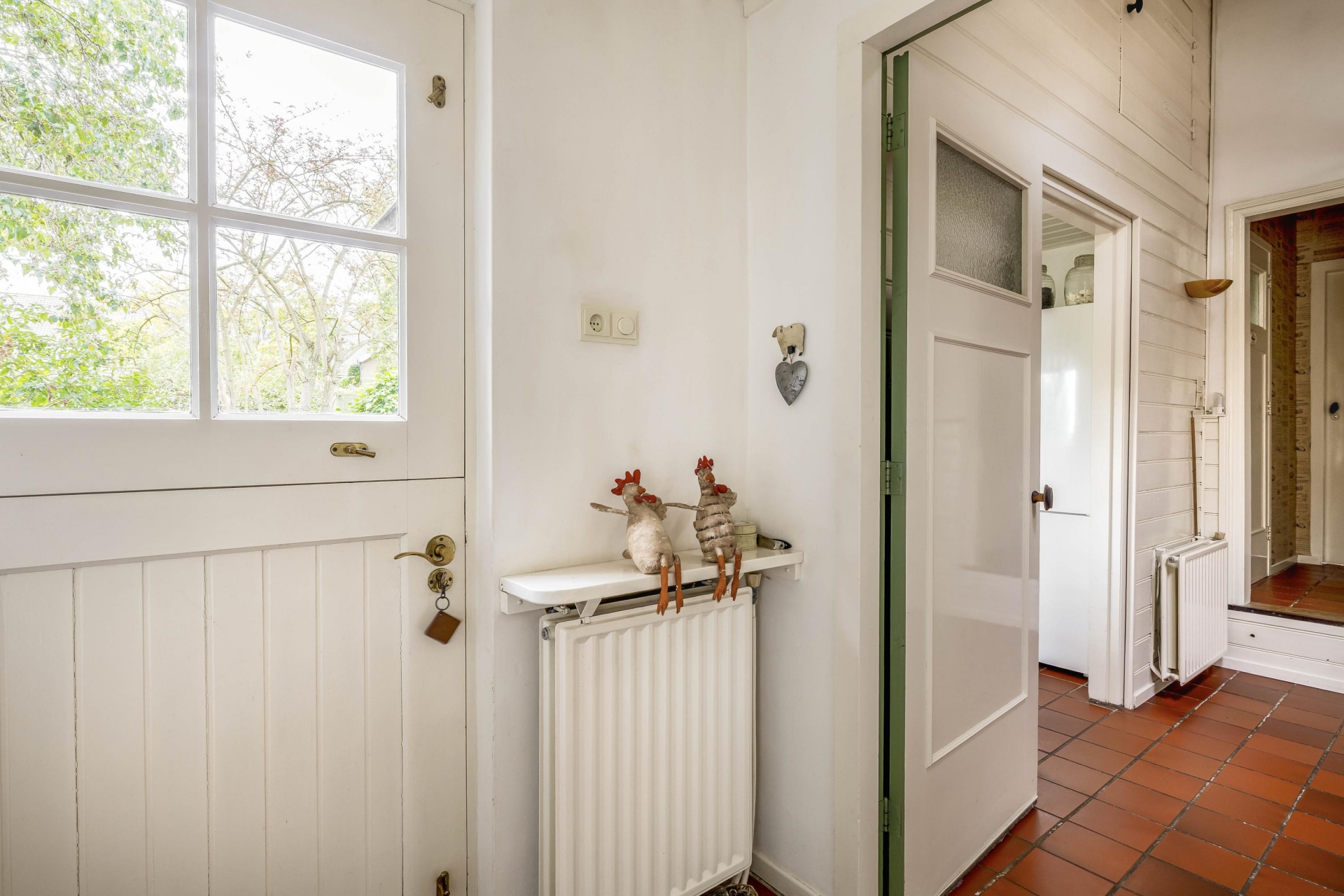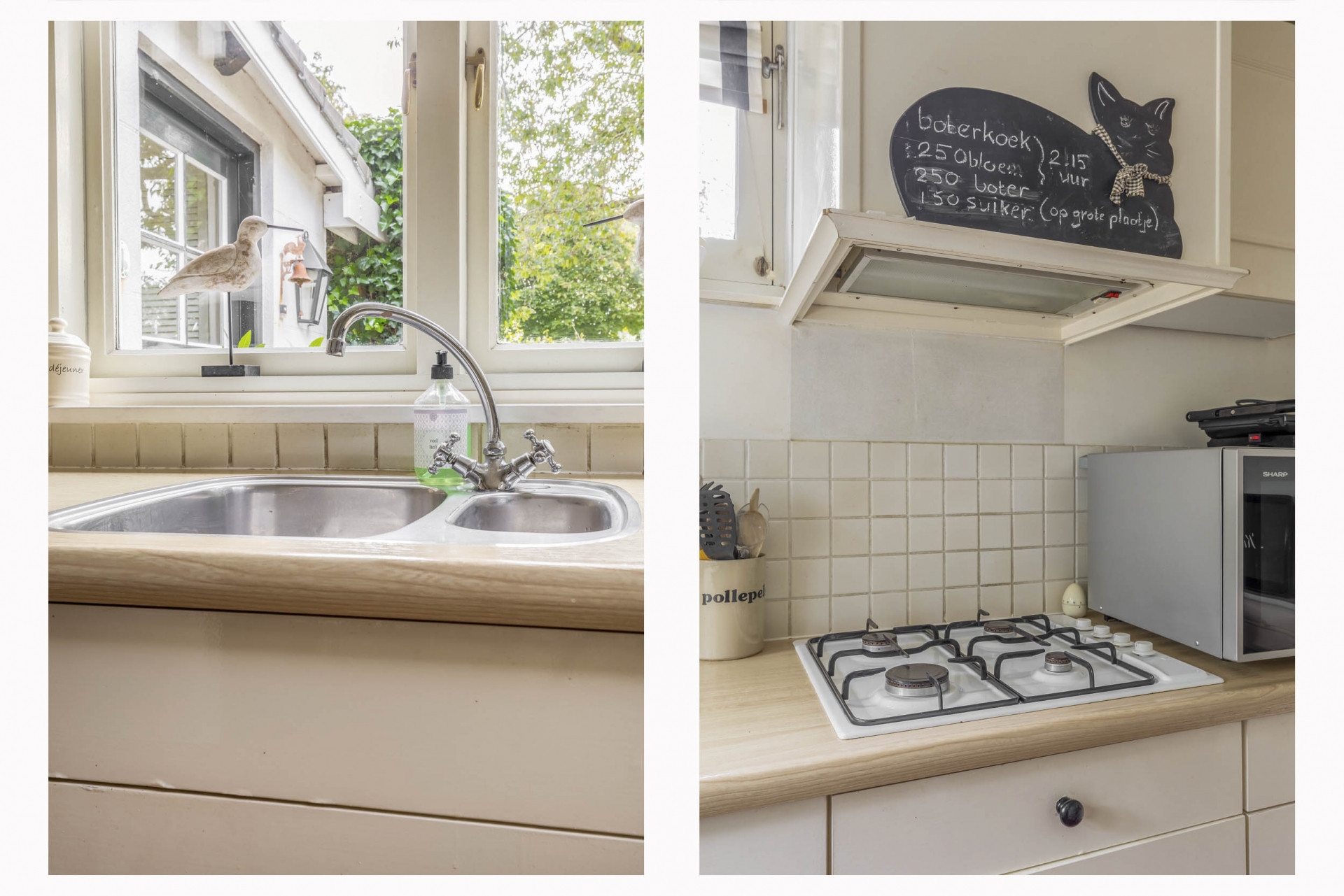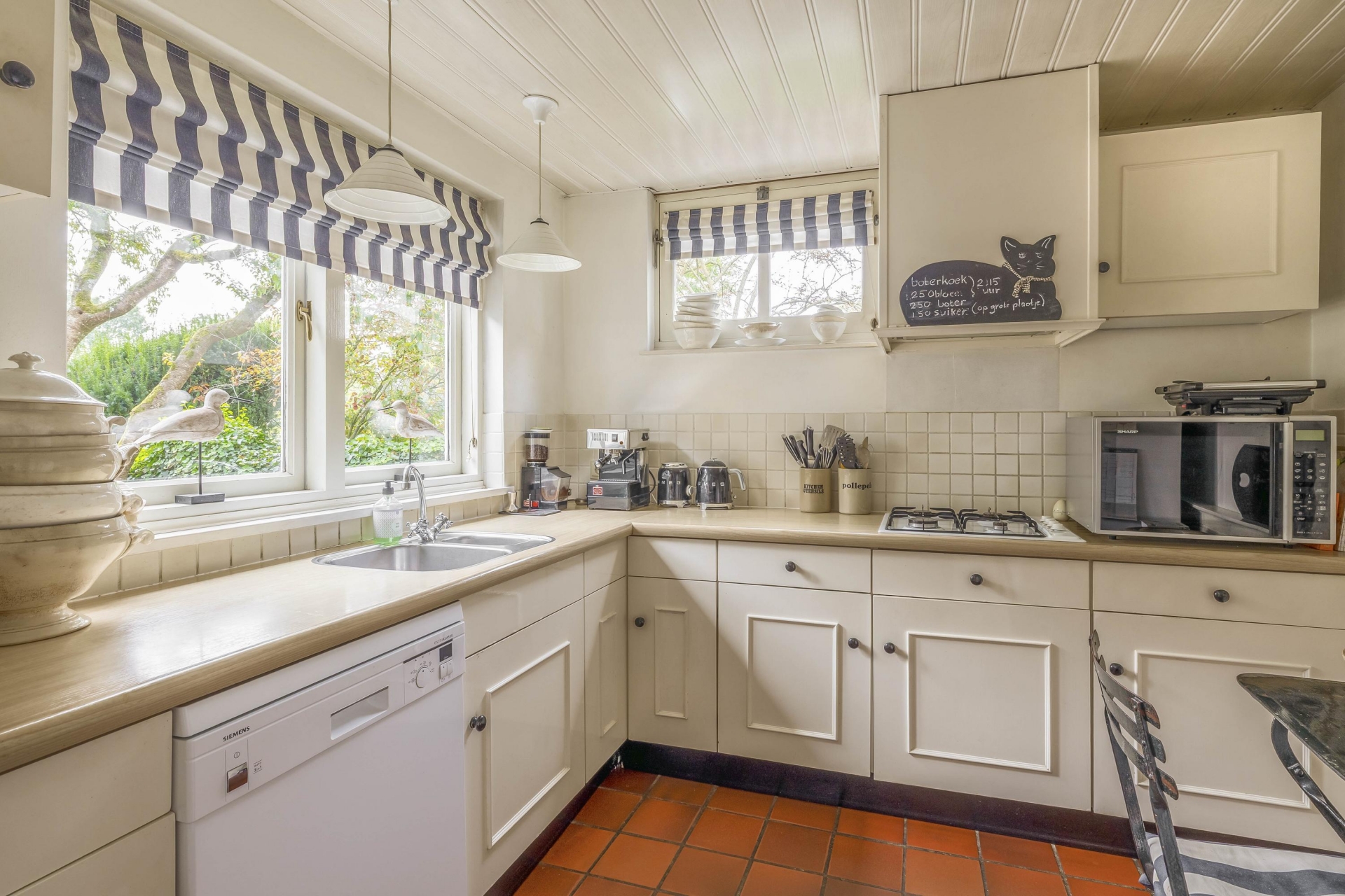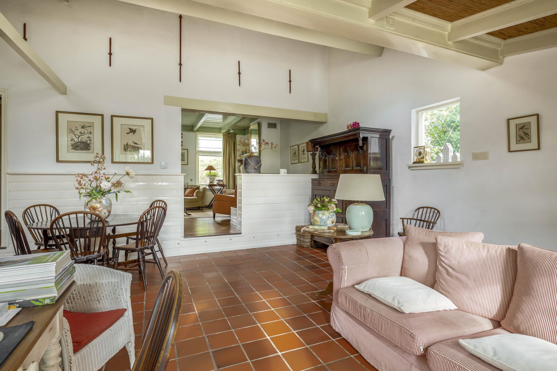 Daarnaast vind je het eetgedeelte/tuinkamer met plavuizenvloer en openslaande deuren naar de tuin – hier voel je de seizoenen binnenkomen. De keuken is eenvoudig, maar netjes.