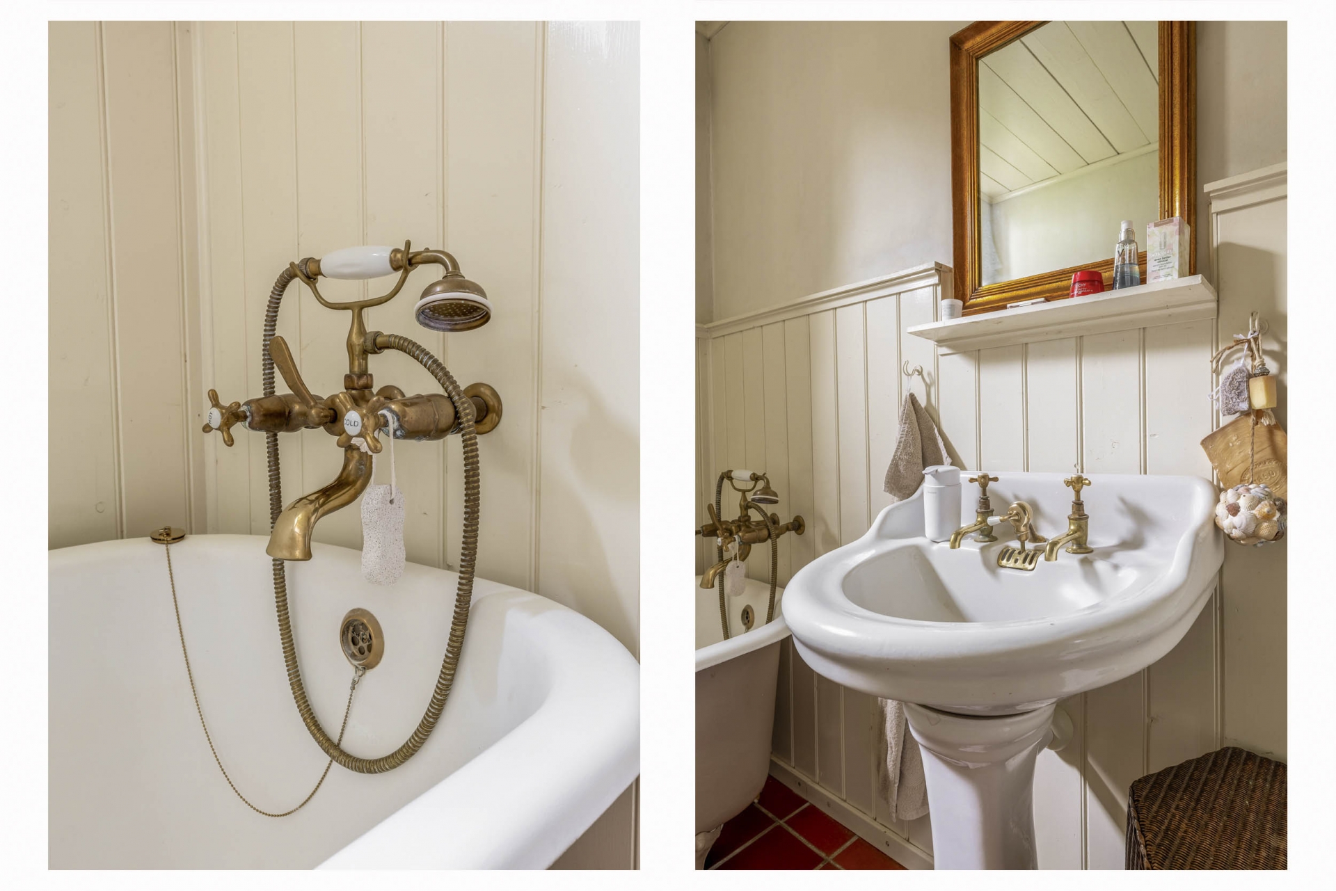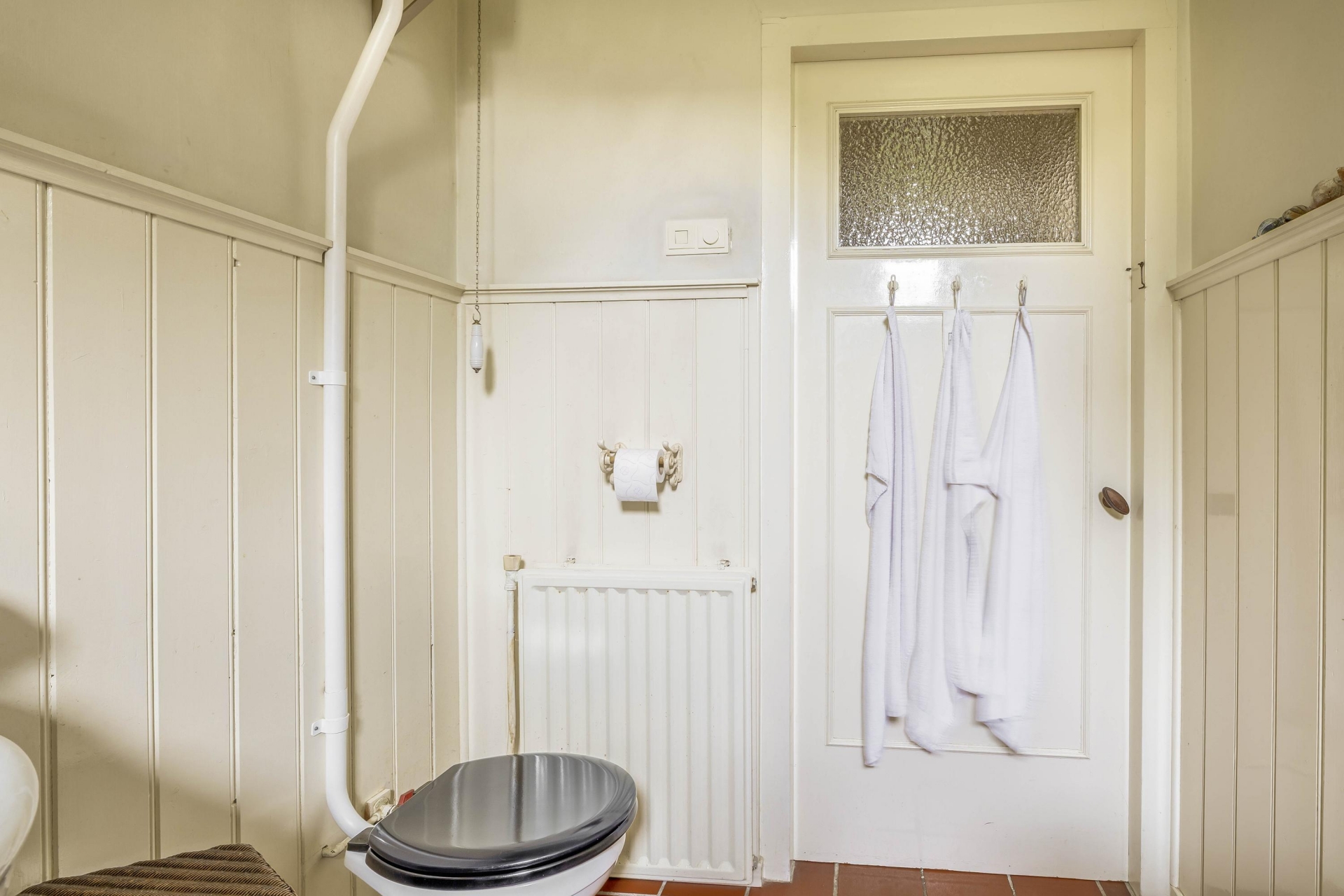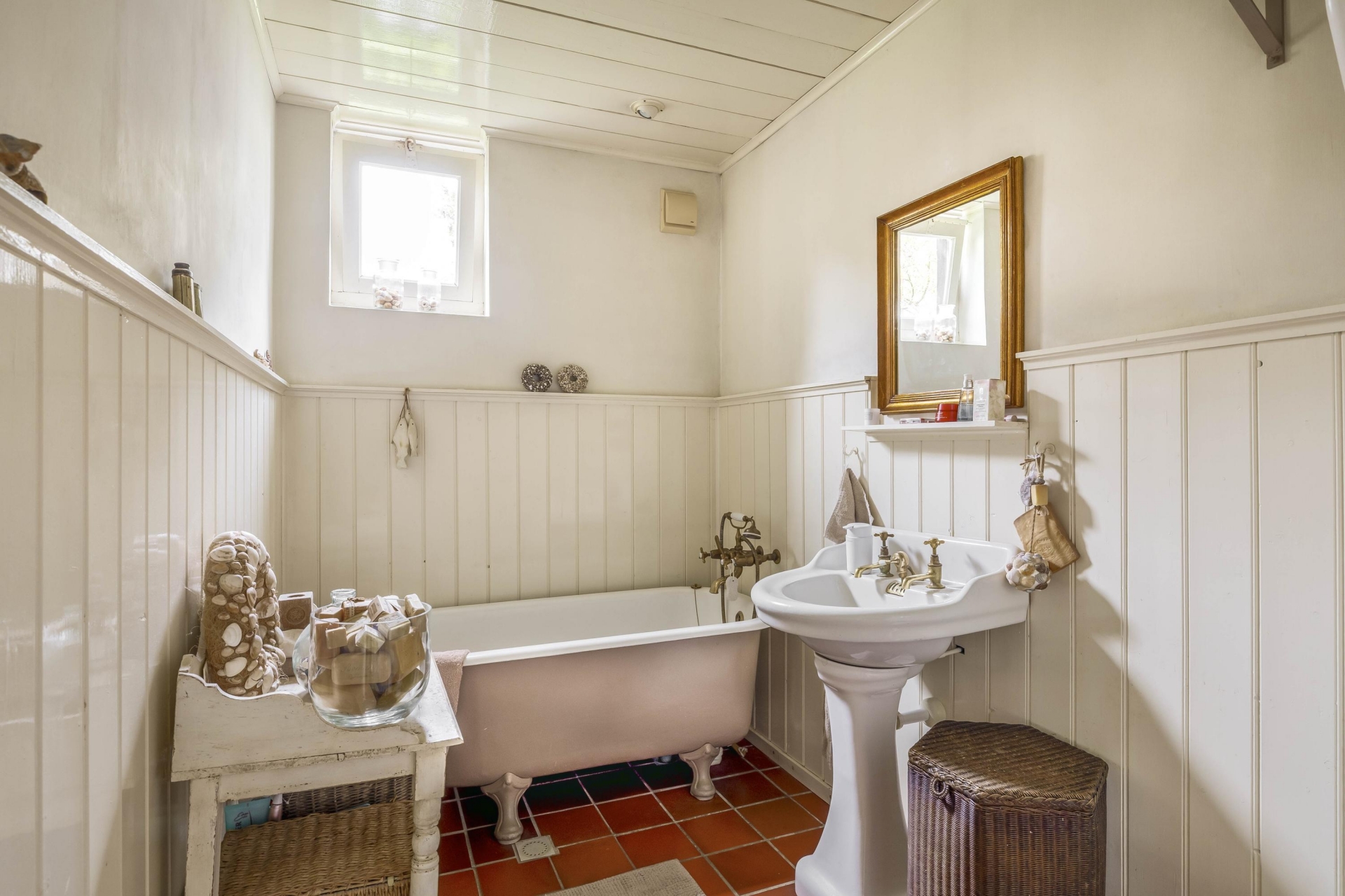De badkamer op de begane grond is rond 2005 vernieuwd en beschikt over een vrijstaand ligbad met douche, wastafel en toilet.