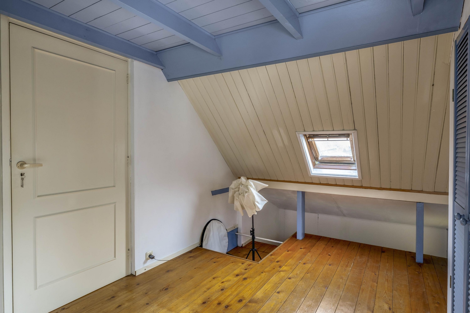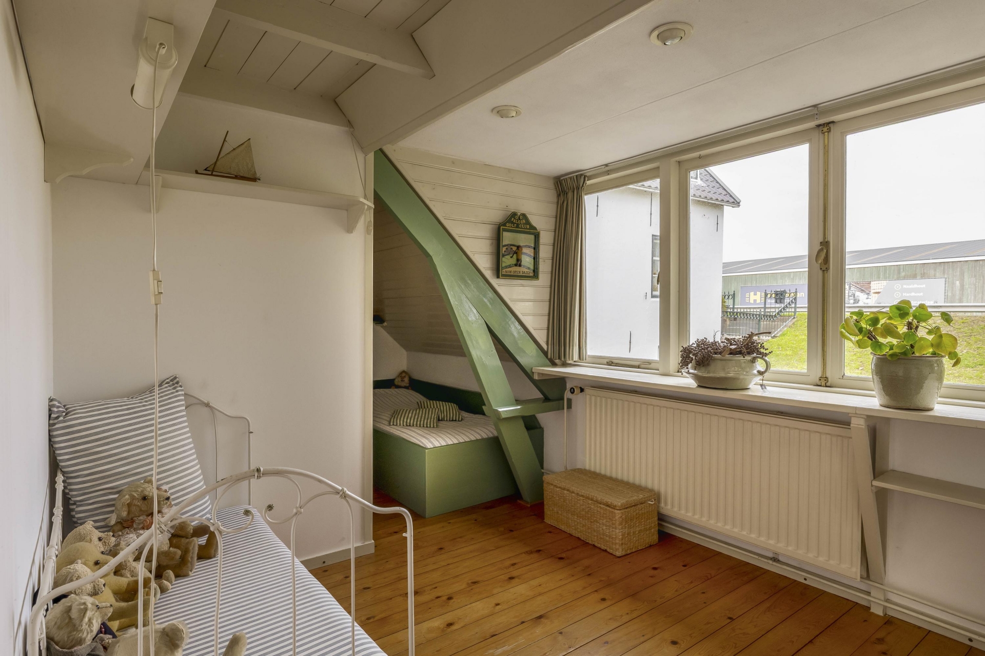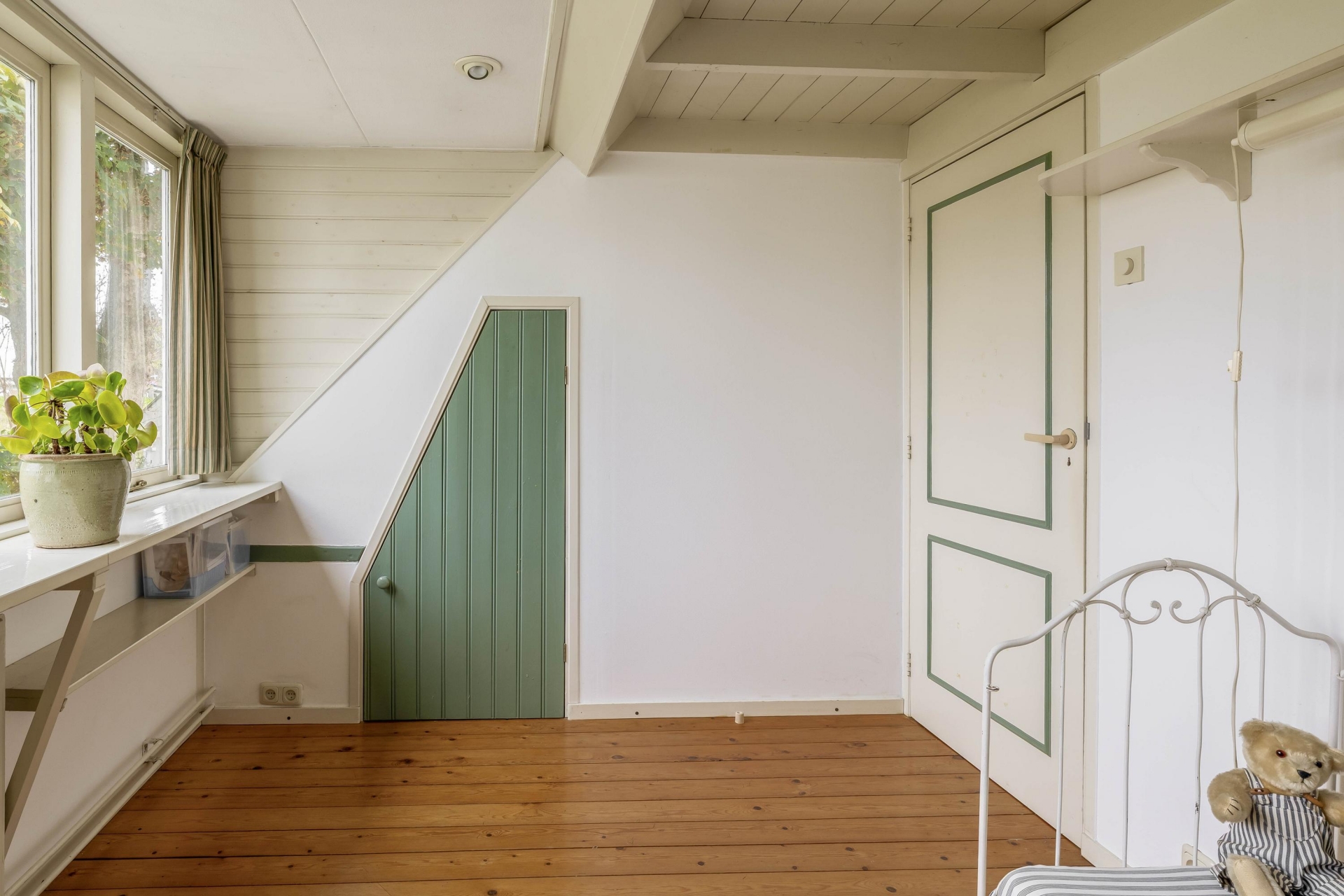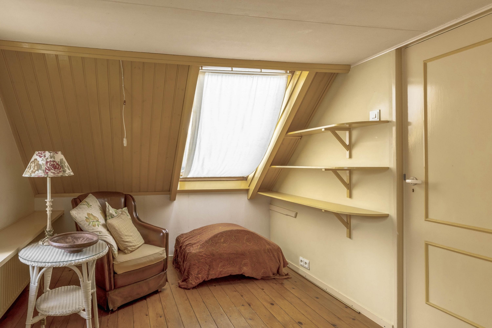 Op de verdieping bevinden zich drie charmante slaapkamers – elk met vaste kasten, bedstede-elementen of dakkapellen – en een overloop met voldoende bergruimte. Er is een aparte kast waar eventueel een tweede toilet gerealiseerd kan worden (waterafvoer aanwezig). Boven de verdieping bevindt zich nog een praktische bergvliering, bereikbaar via een losse trap.