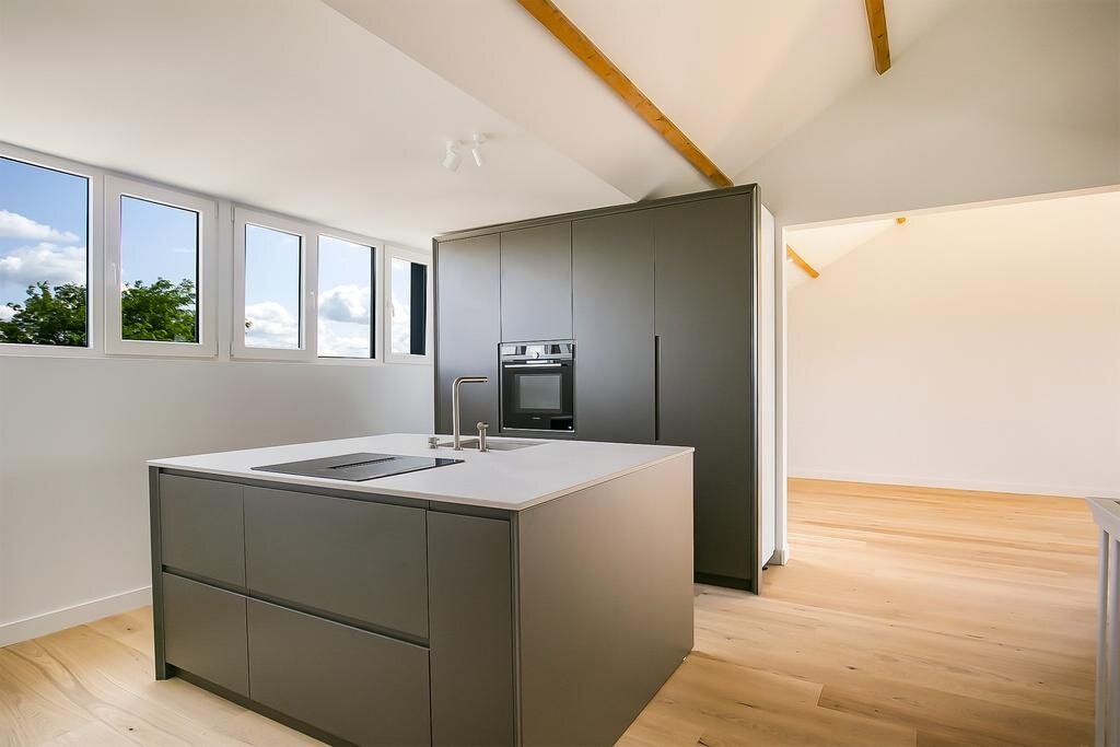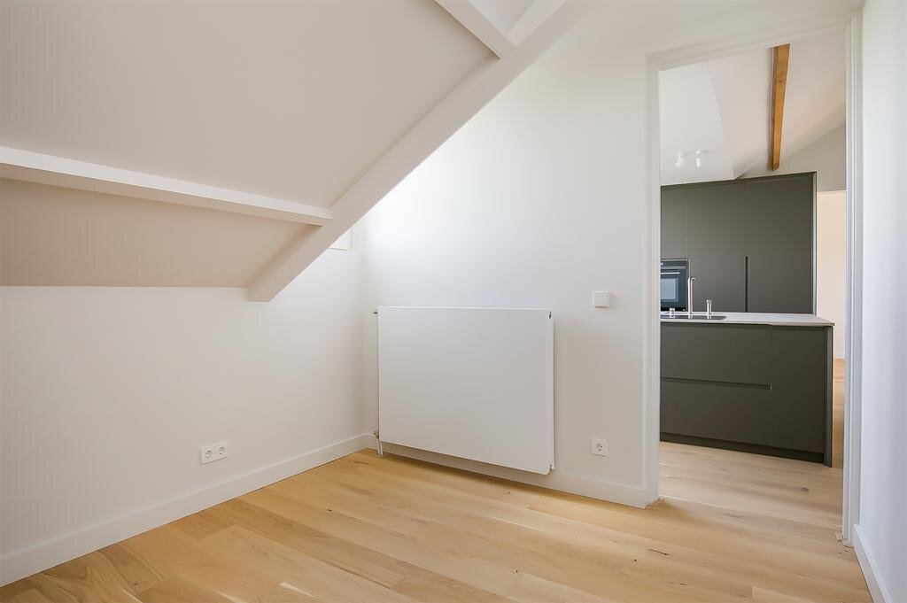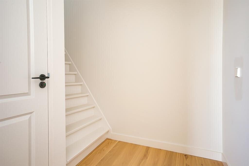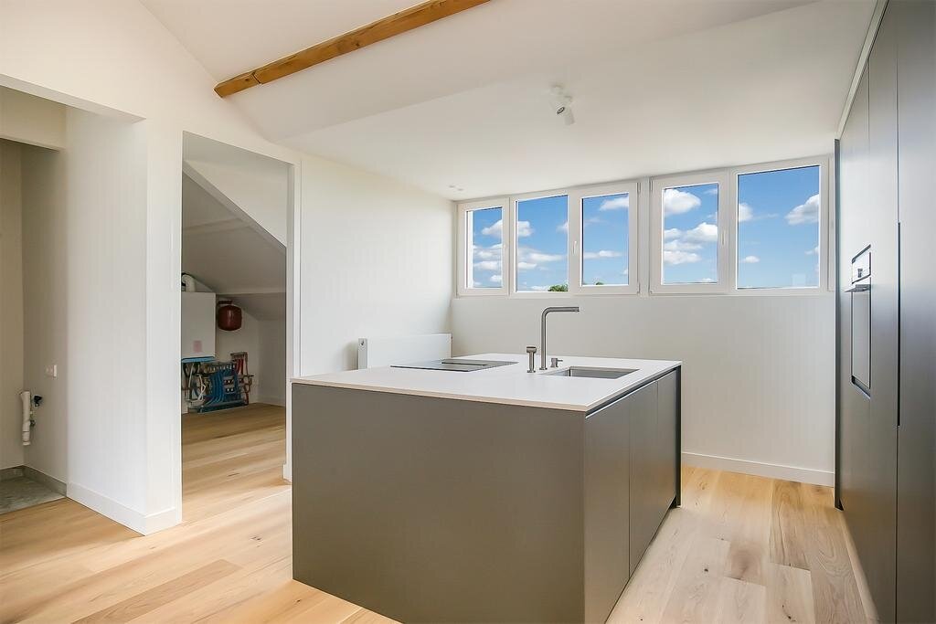 Via de ingang bovendijks kom je kom je in de gemeenschappelijke hal met meterkast. Vanuit de hal loop je door naar de trapopgang met separaat toilet. Via de trap kom je uit op de overloop met toegang tot alle ruimtes. Hier vallen meteen de prachtig hoge planfonds op. De woonkeuken beschikt over een kookeiland en alle benodigde inbouwapparatuur, zoals een inductiekookplaat met geïntegreerde afzuigkap, vaatwasser, combi-oven, koelkast, vriezer en voldoende opbergruimte.