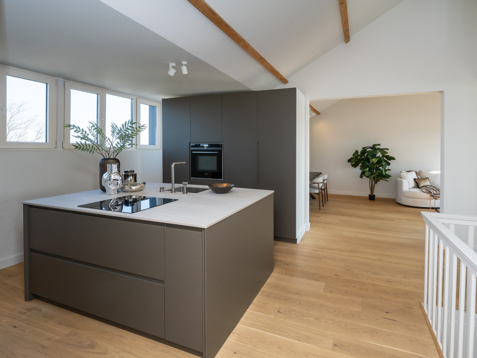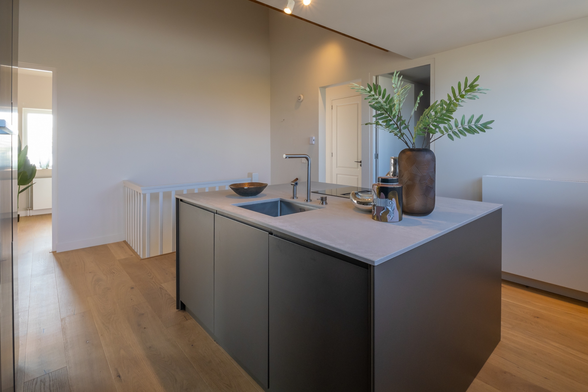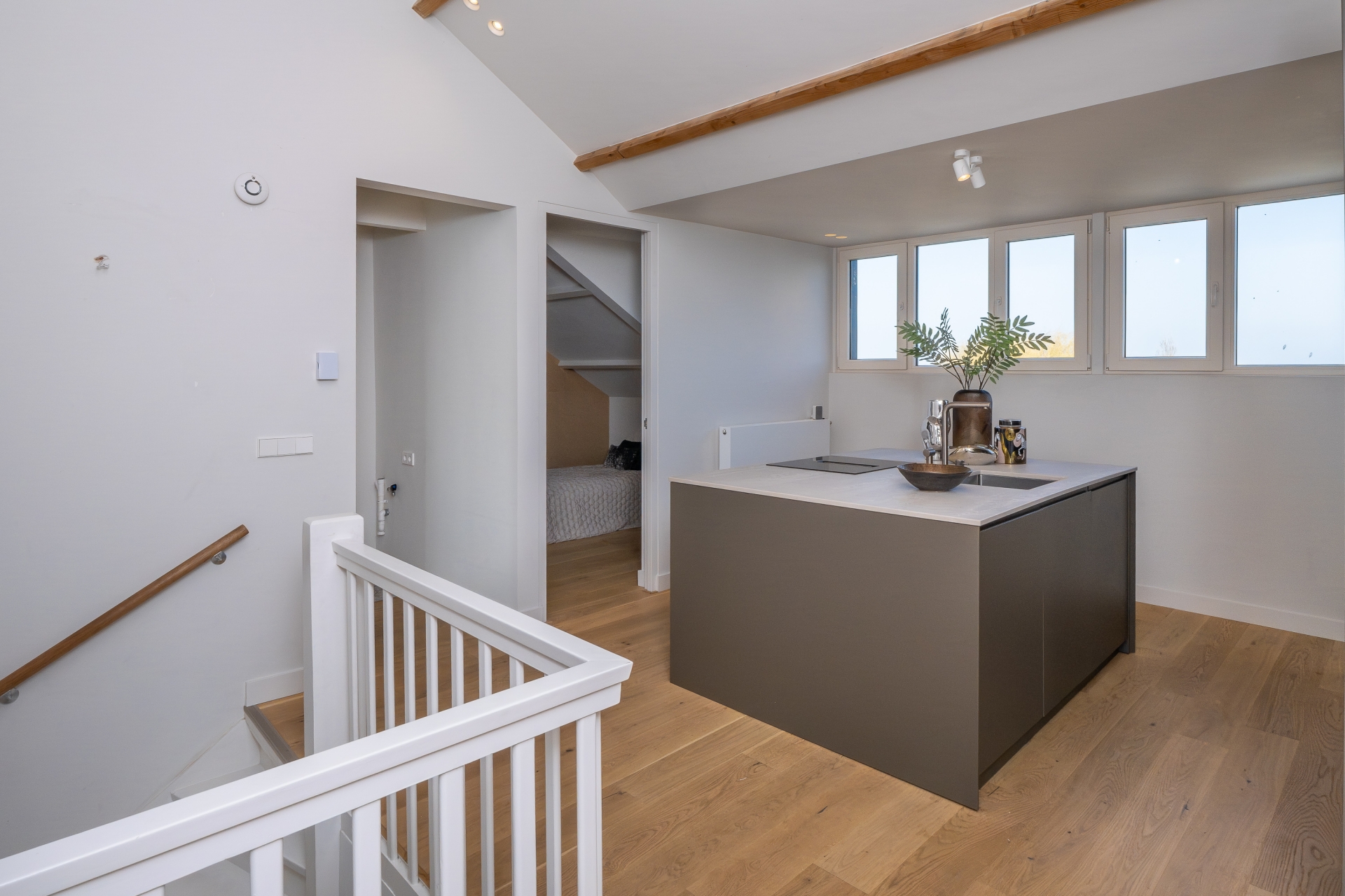 Via de ingang bovendijks kom je kom je in de gemeenschappelijke hal met meterkast. Vanuit de hal loop je door naar de trapopgang met separaat toilet. Via de trap kom je uit op de overloop met toegang tot alle ruimtes. Hier vallen meteen de prachtig hoge planfonds op. De woonkeuken beschikt over een kookeiland en alle benodigde inbouwapparatuur, zoals een inductiekookplaat met geïntegreerde afzuigkap, vaatwasser, combi-oven, koelkast, vriezer en voldoende opbergruimte.