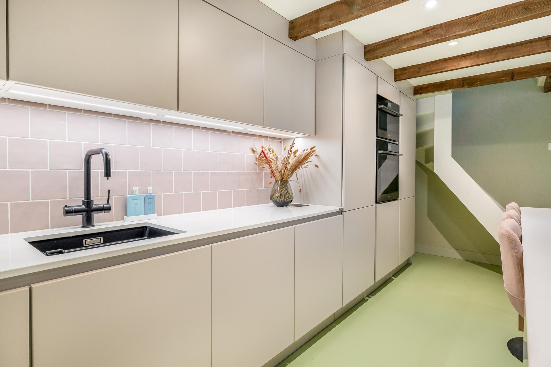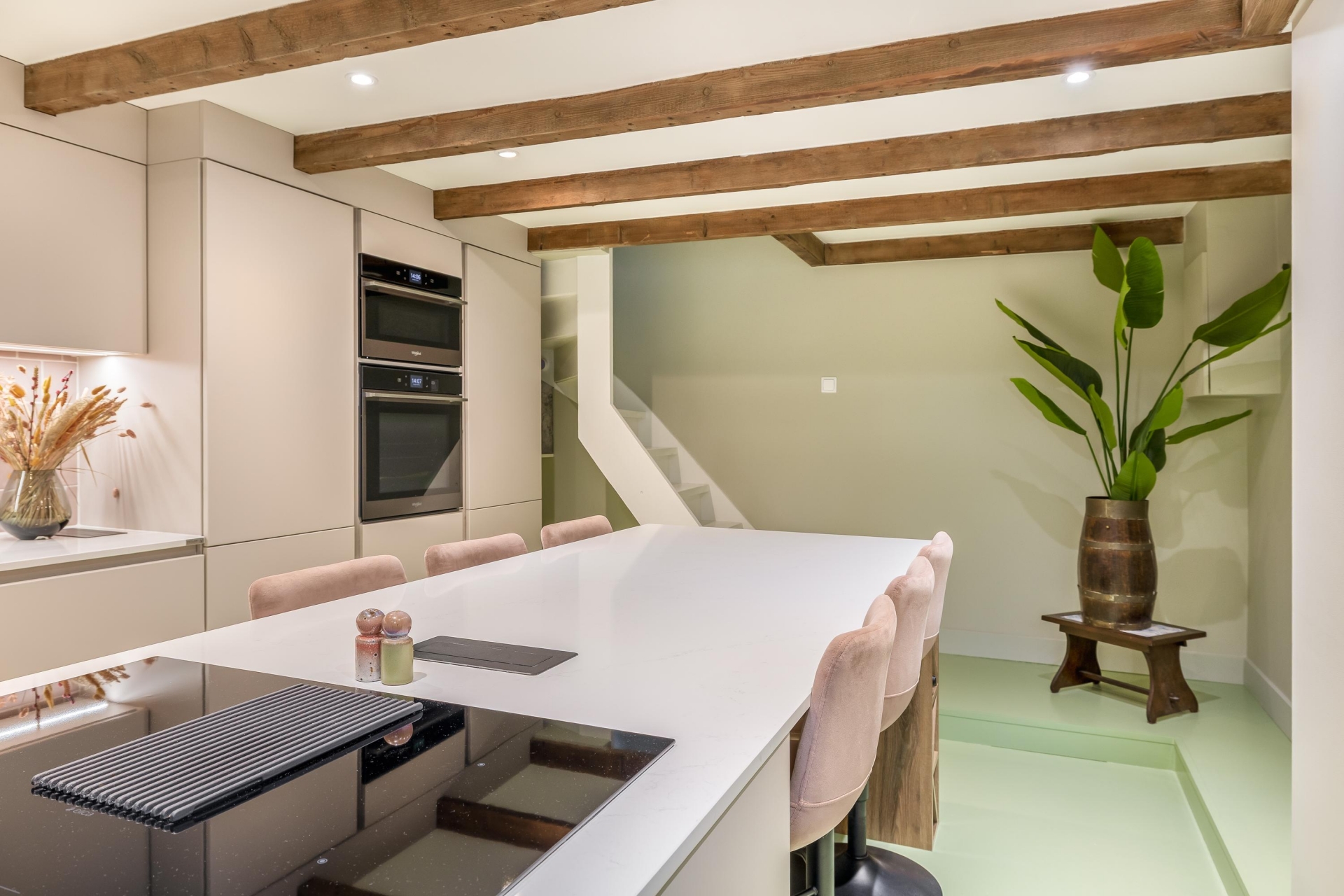 In het souterrain ligt de keuken en dat is niet zomaar een keuken. Dit is de plek waar het leven zich afspeelt. Het kookeiland nodigt uit om aan te schuiven, een glas wijn in te schenken en bij te praten terwijl er wordt gekookt. Lange avonden aan tafel, spontane etentjes en spelletjesavonden. De keuken (2022) is voorzien van alle gemakken: inductie kookplaat met geïntegreerde afzuiging, vaatwasser, koel-vriescombinatie, combi-oven, oven en Quooker. De keuken is voorzien van comfortabele vloerverwarming.