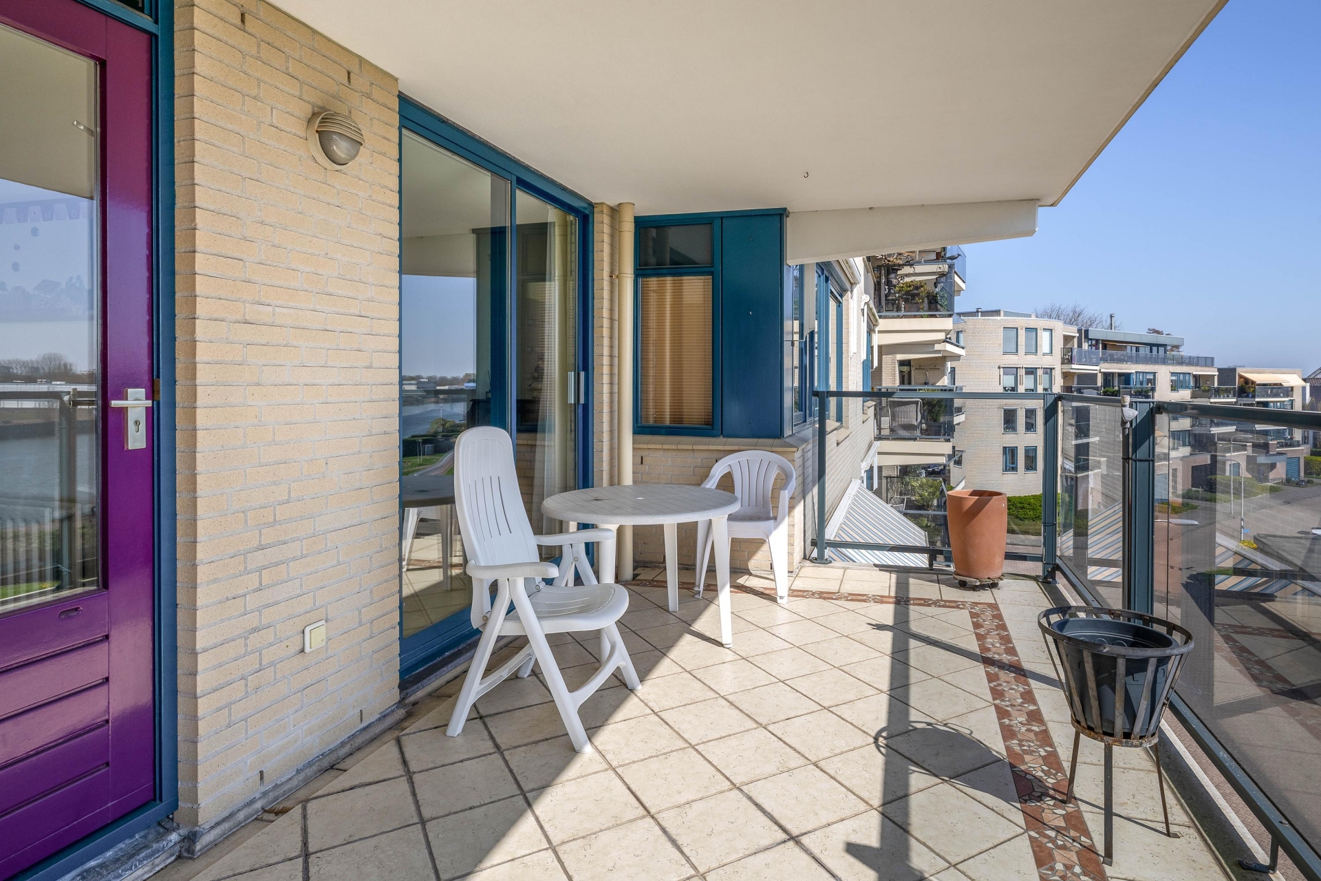 Dit terras biedt niet alleen een waanzinnig uitzicht over het water maar het is ook een uitnodiging om heerlijk in het zonnetje te genieten. Gegarandeerd dat u hier het hele jaar gaat genieten van een optimaal vakantiegevoel. Het terras heeft een oppervlakte van 16 m² en is gesitueerd op het zuidoosten, wat het mogelijk maakt om al vroeg de dag te beginnen met een kopje koffie in de zon, maar het is ook mogelijk een plekje in de schaduw op te zoeken doordat het balkon overdekt is.