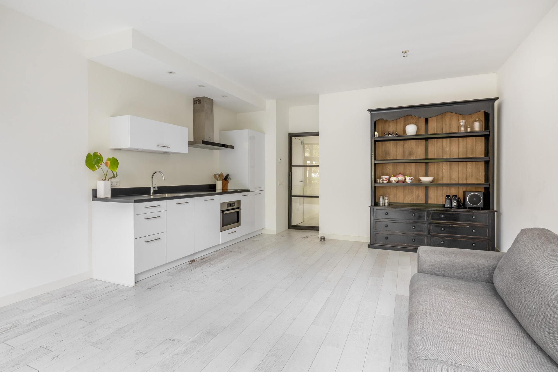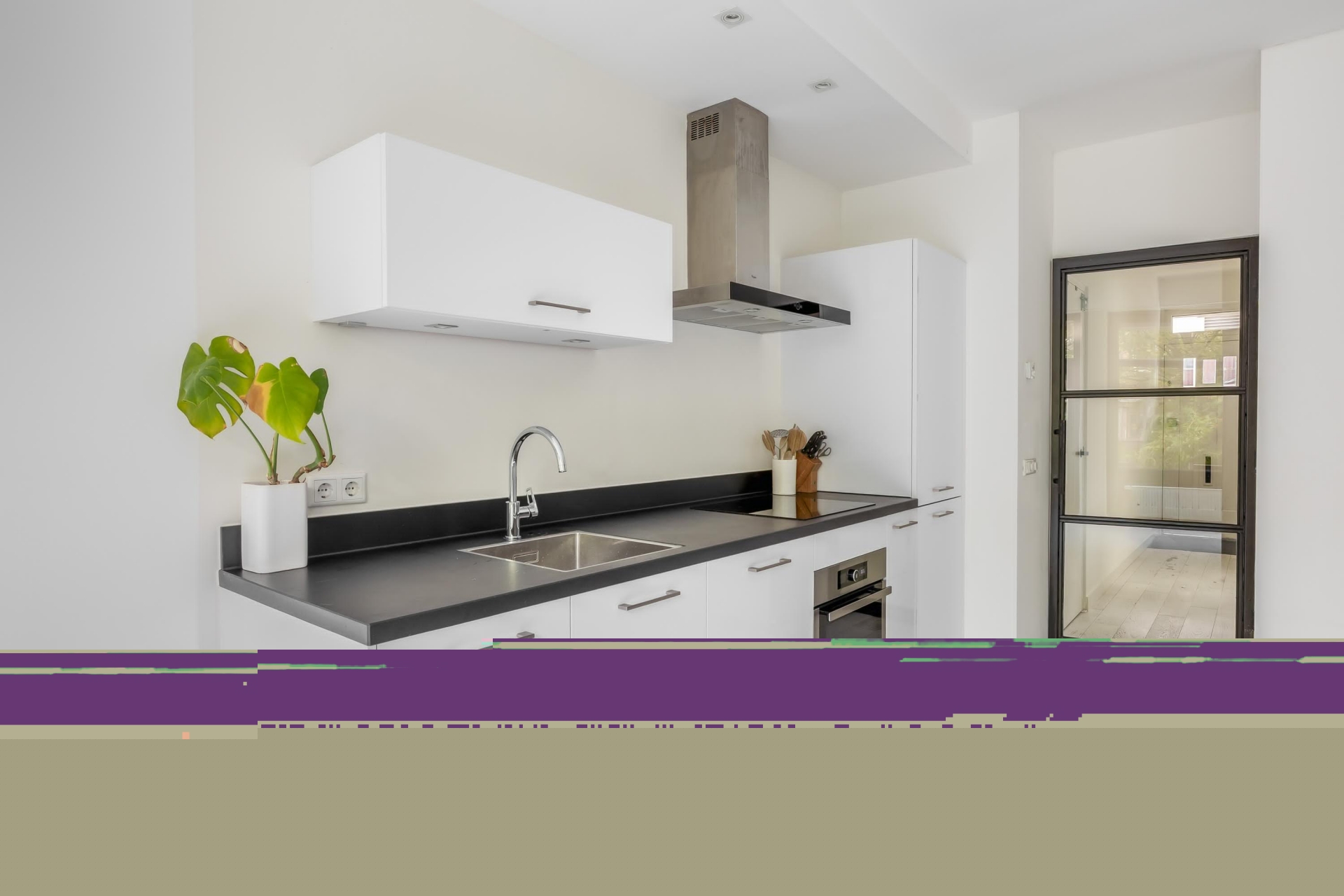 De open keuken is strak afgewerkt en uitgerust met diverse inbouwapparatuur, waaronder een 4-pits gasfornuis, vaatwasser, magnetron en afzuigkap. Vanuit de woonkamer geven de openslaande deuren toegang tot de diepe, rustig gelegen tuin op het westen – een heerlijke plek om van de middag- en avondzon te genieten.