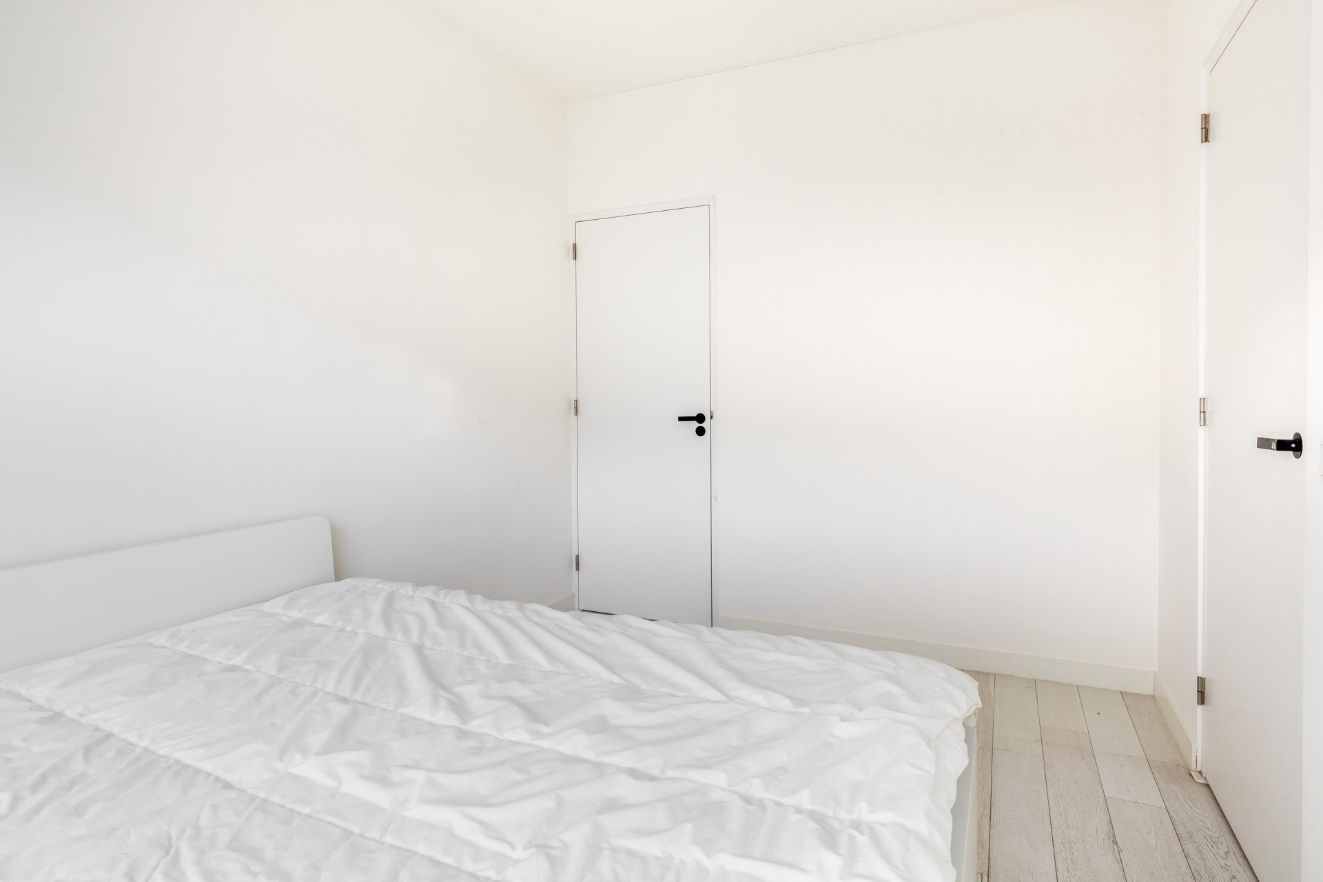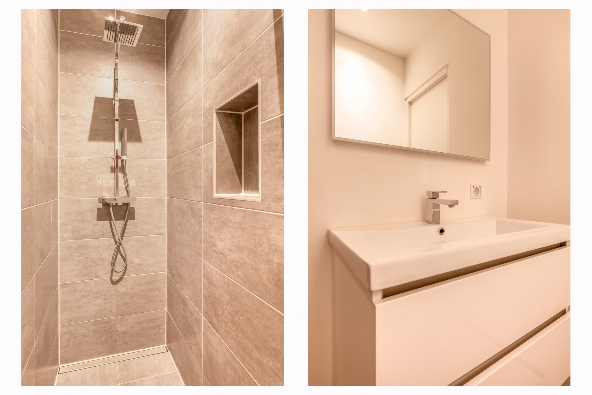 De moderne badkamer is voorzien van een inloopdouche, wastafel en spiegel, en het toilet bevindt zich separaat tussen de woon- en slaapkamer. In de hal is bovendien een vaste kast met extra bergruimte aanwezig.