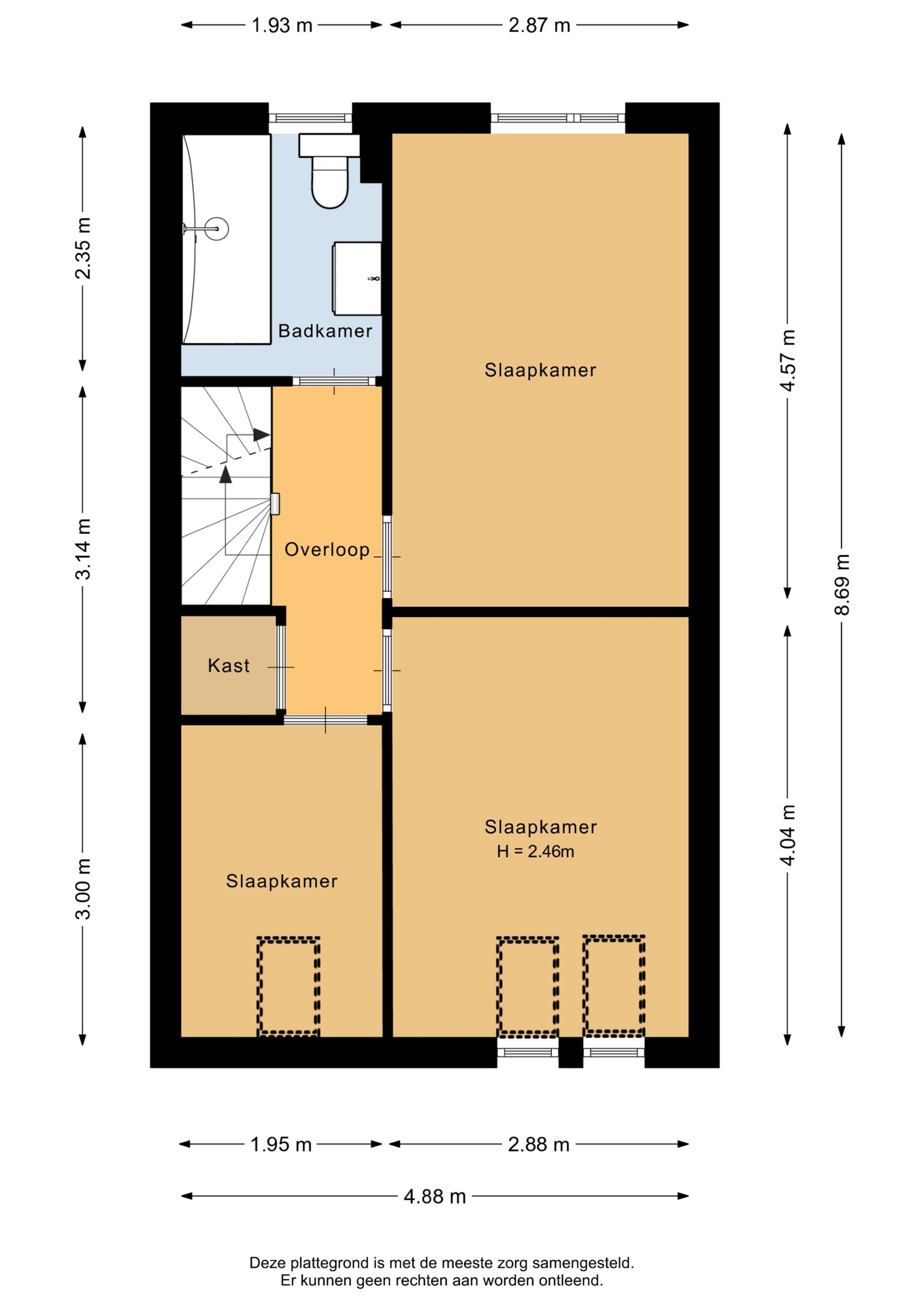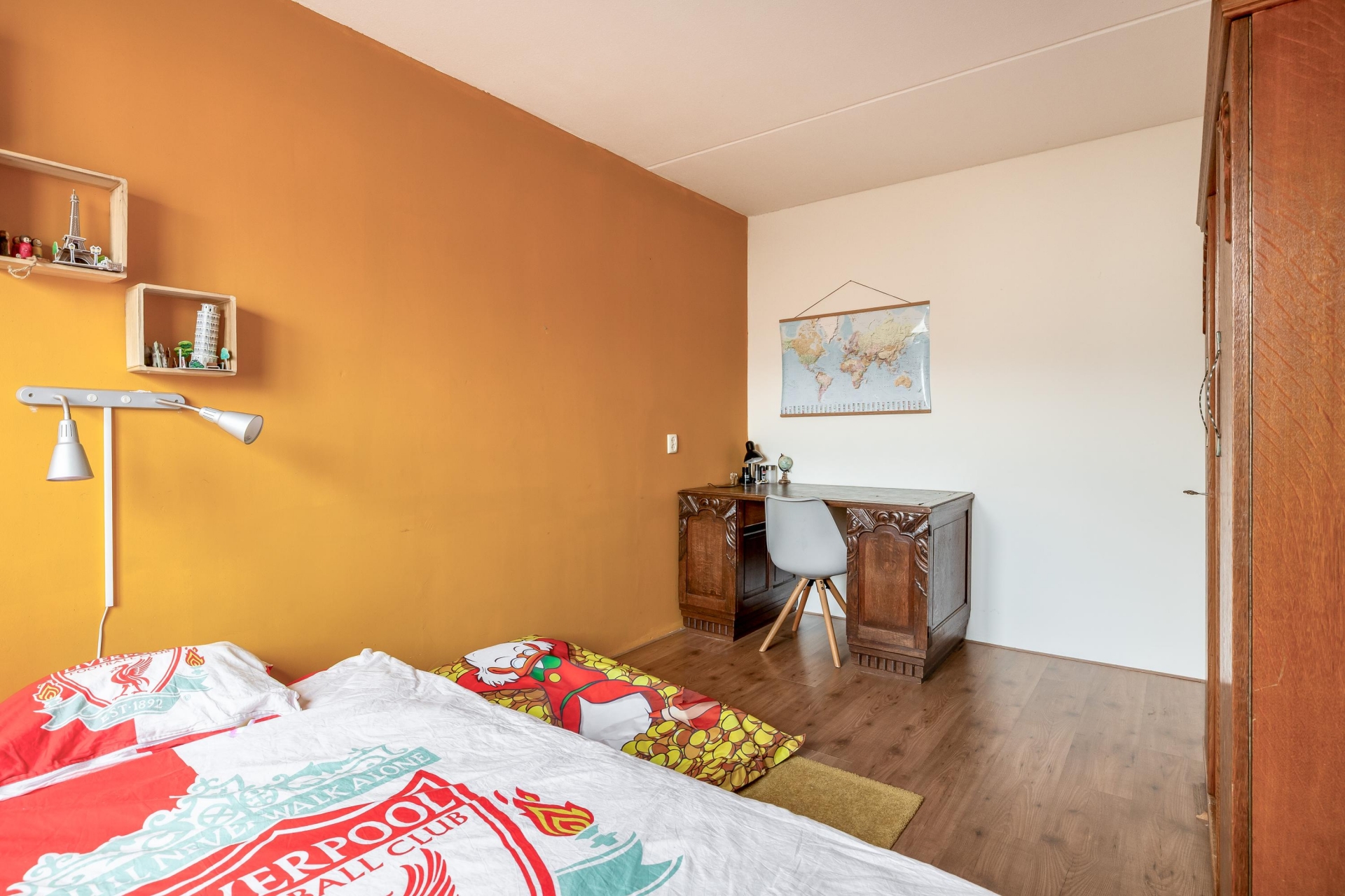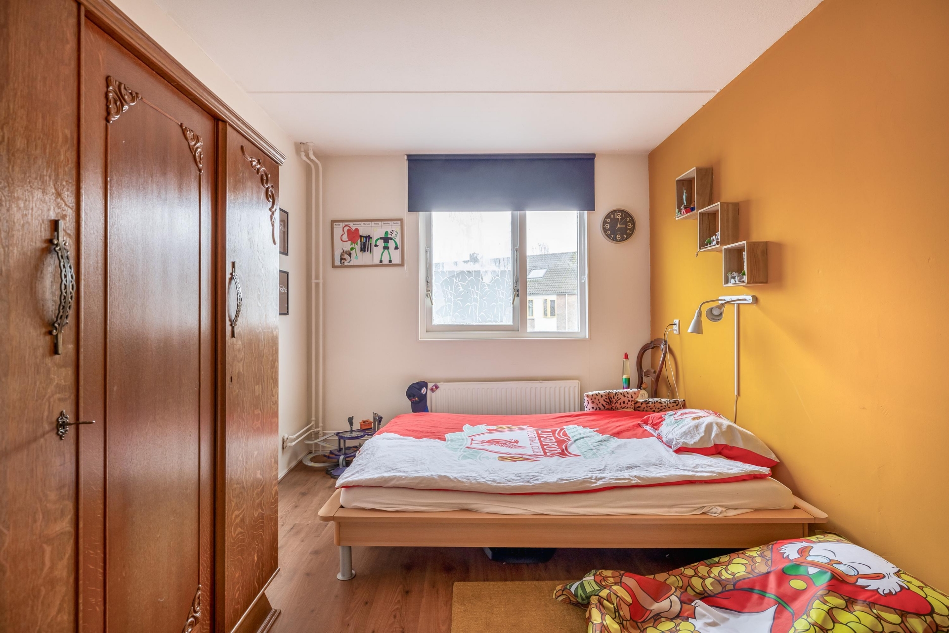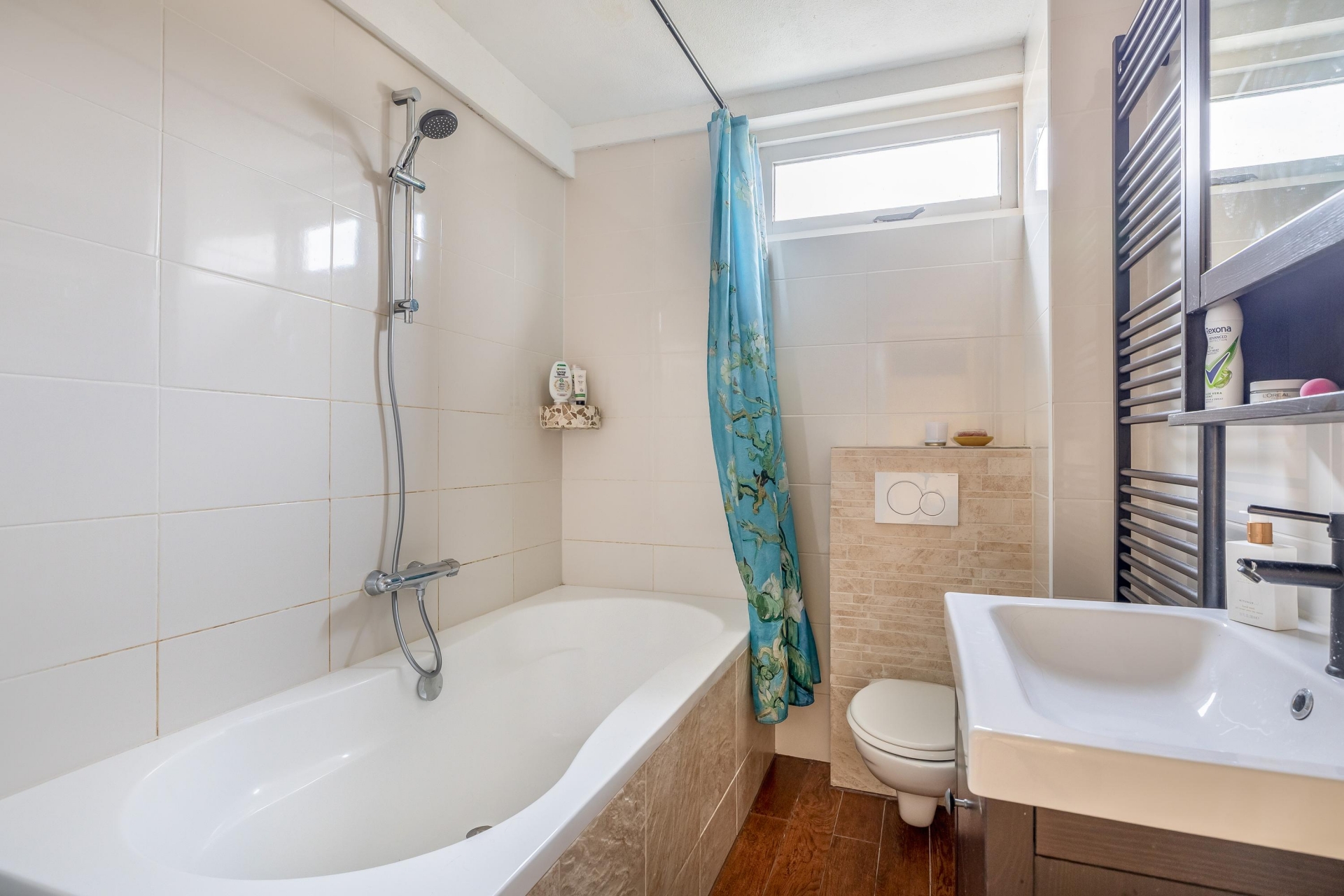 Op de eerste verdieping zijn drie slaapkamers te vinden. De grootste kamer ligt aan de achterzijde en heeft een fijne lichtinval. Aan de voorzijde vind je twee slaapkamers, ideaal voor kinderen of als thuiswerkplek. De badkamer is compact maar compleet, met een ligbad, toilet en wastafelmeubel.