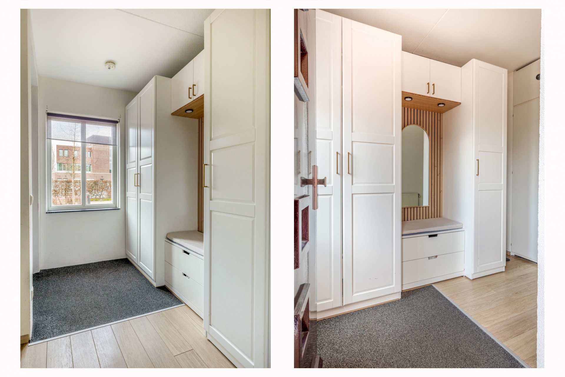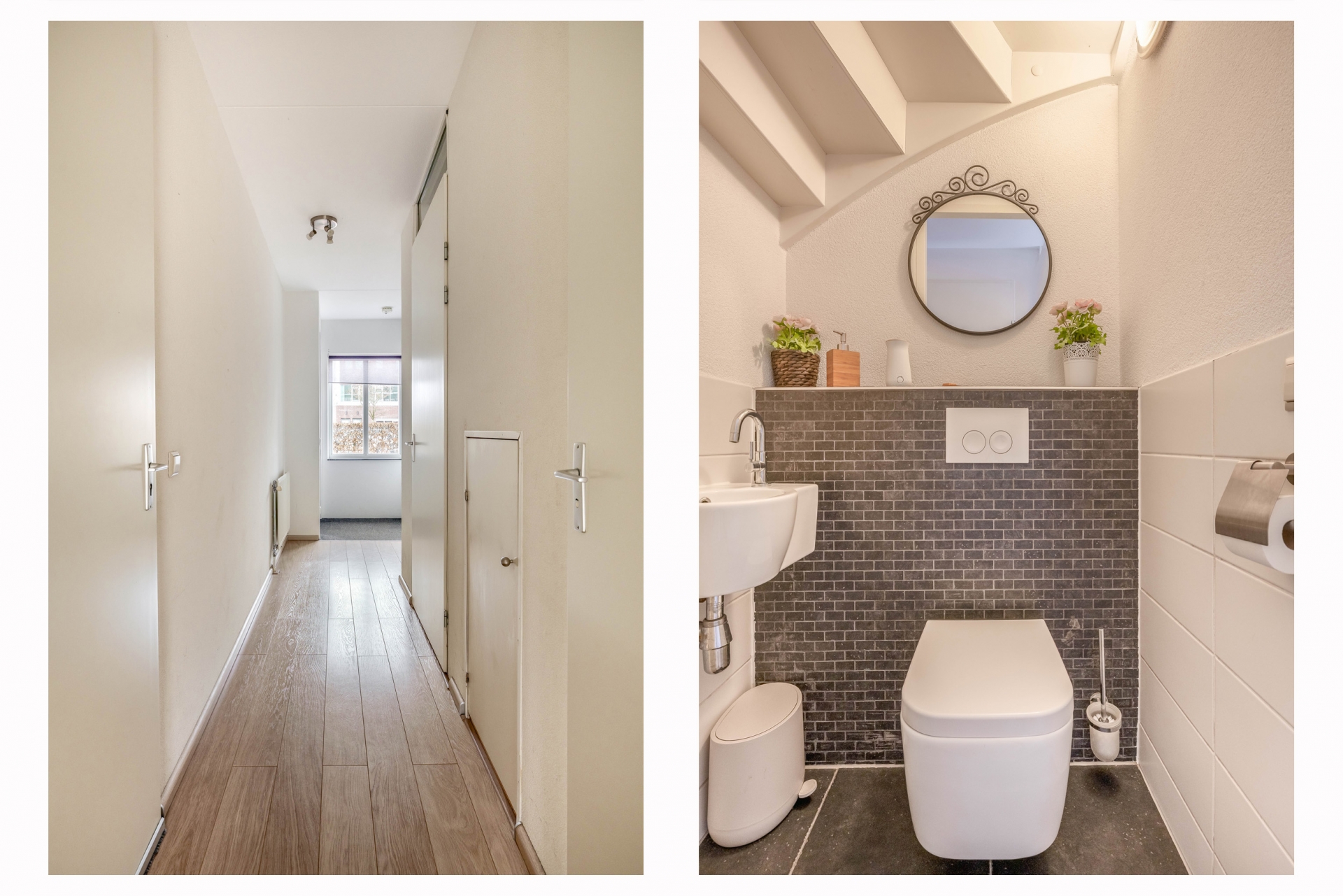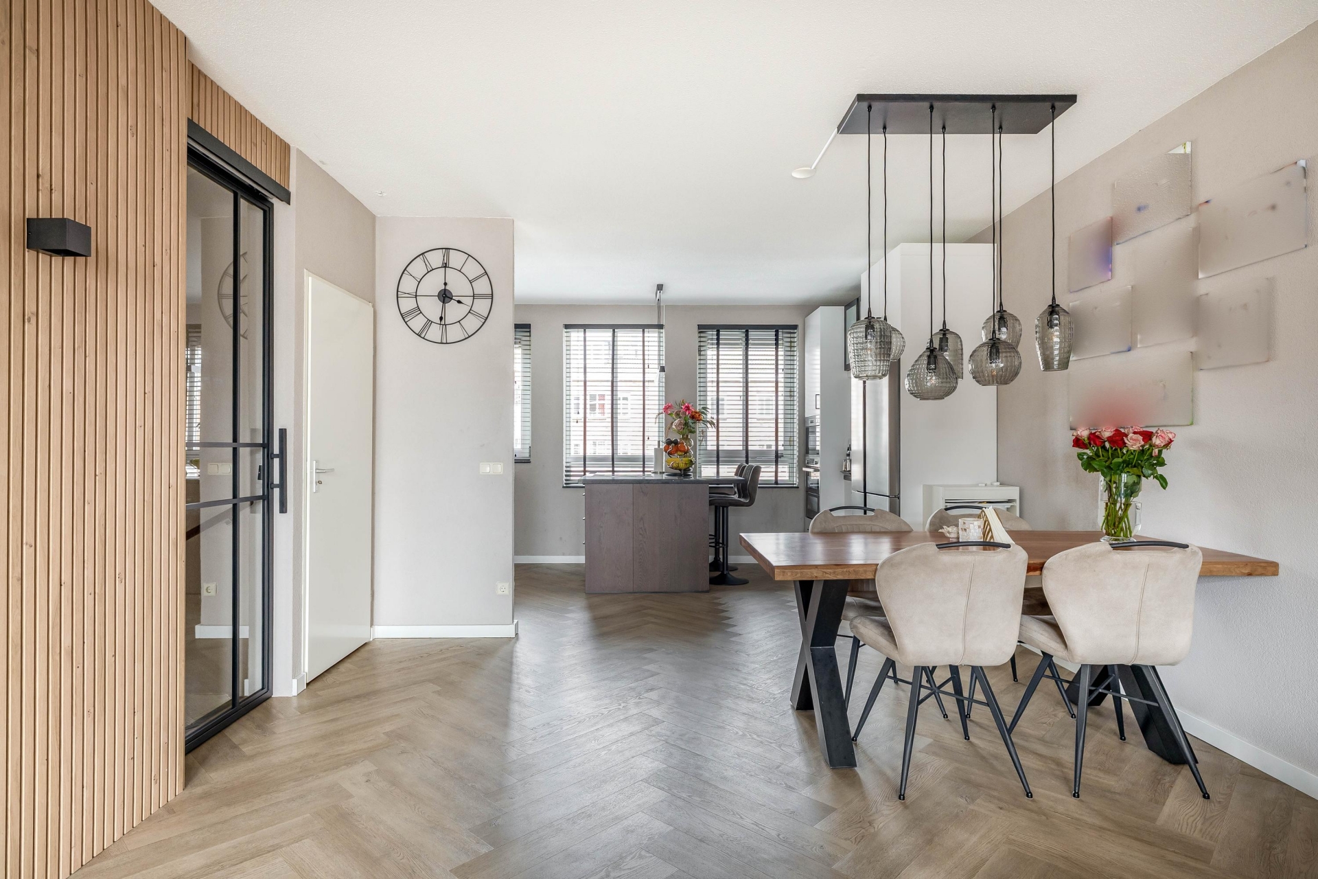 De eerste verdieping vormt het hart van het huis: een royale en lichte woonkamer van met een moderne pvc-vloer in visgraatmotief en vloerverwarming. Dankzij grote raampartijen aan voor- en achterzijde is dit een heerlijk lichte ruimte. De afwerking is strak en smaakvol, met warme tinten en stalen deuren die zorgen voor een eigentijdse sfeer.