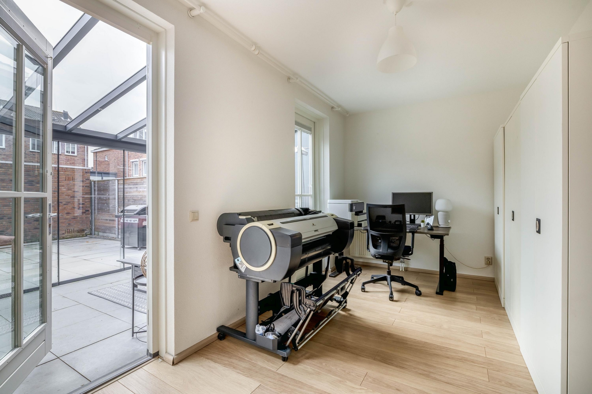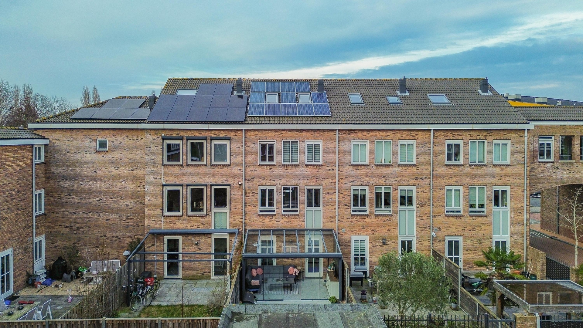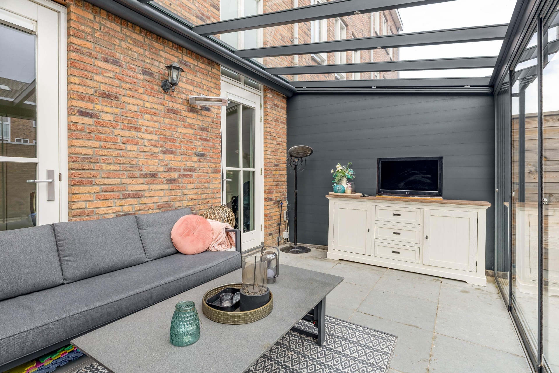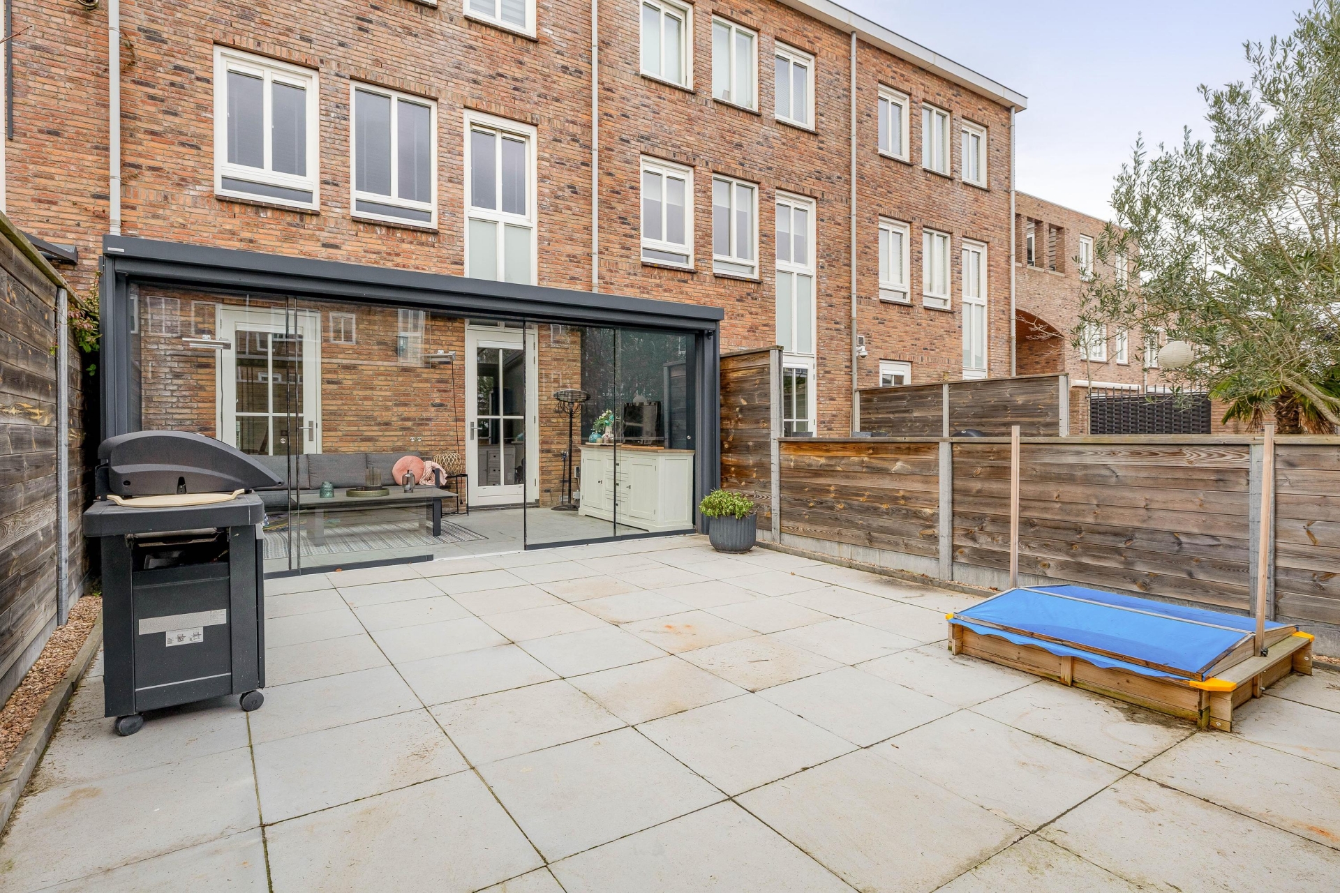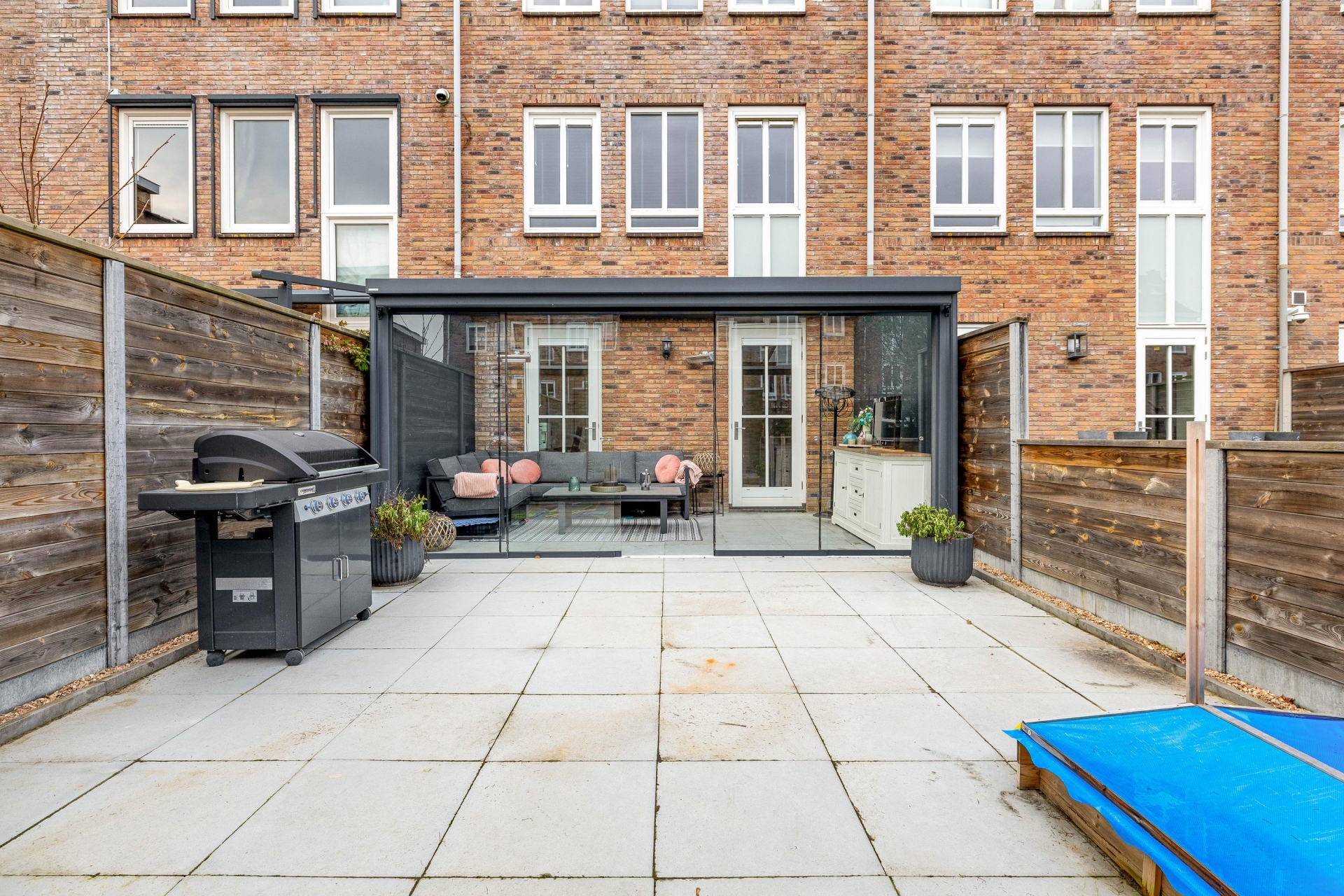 Aan de achterzijde is in 2021 een ruime serre gerealiseerd, voorzien van glazen schuifpanelen. Deze plek verlengt het woongedeelte op natuurlijke wijze en maakt het mogelijk om bijna het hele jaar buiten te zitten. Een fijne extra zitruimte voor een borrel, kinderspeelhoek of thuiskantoor.