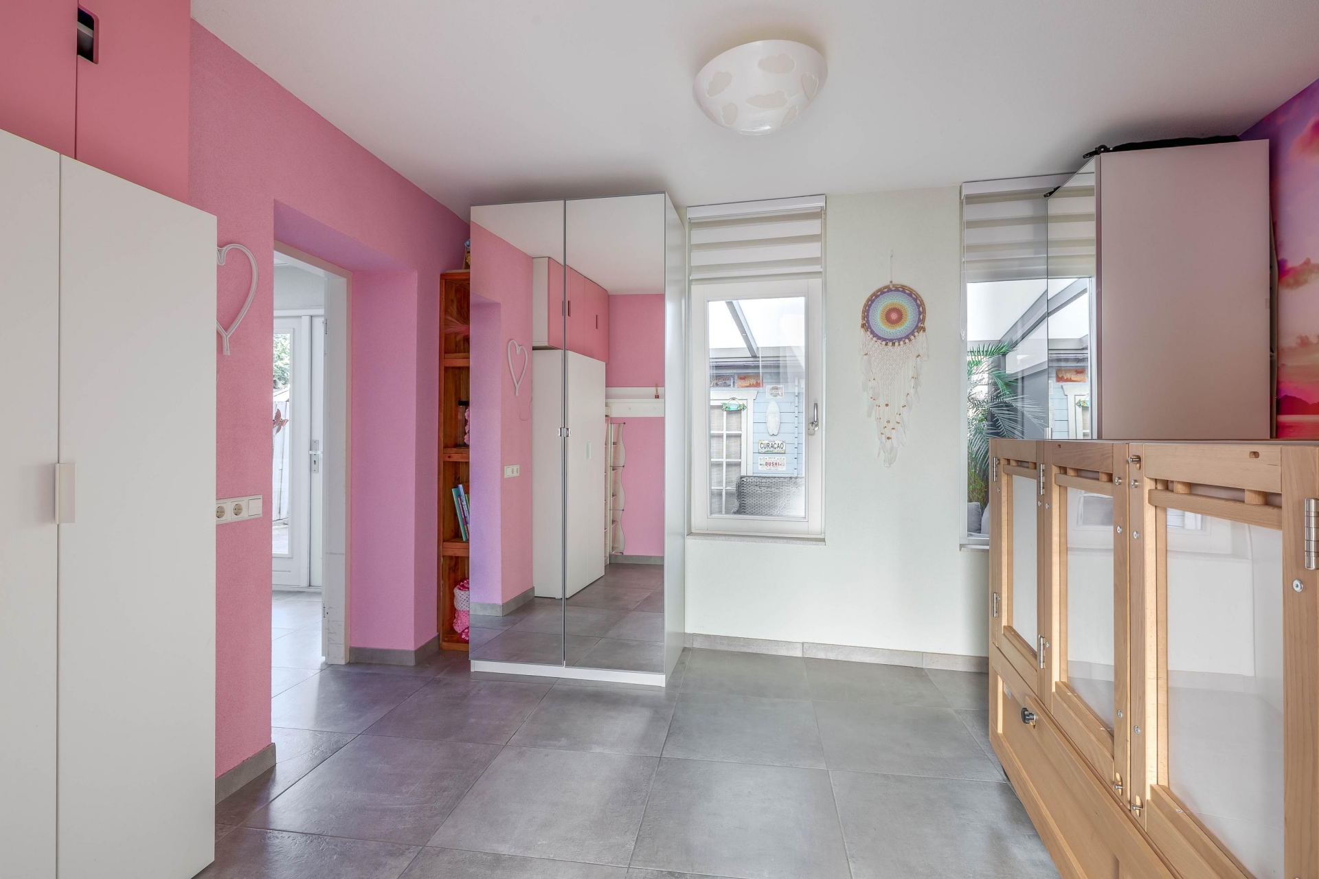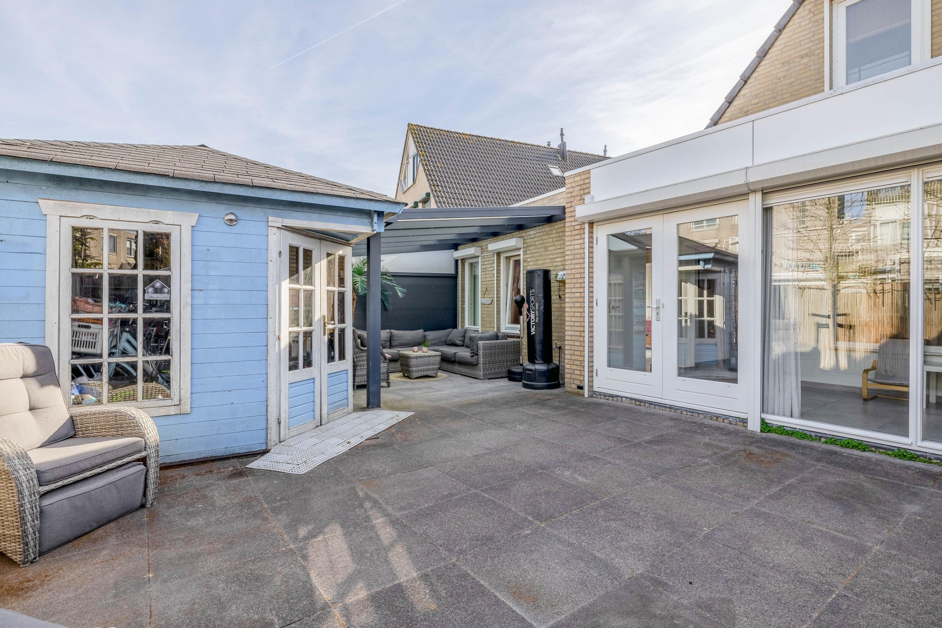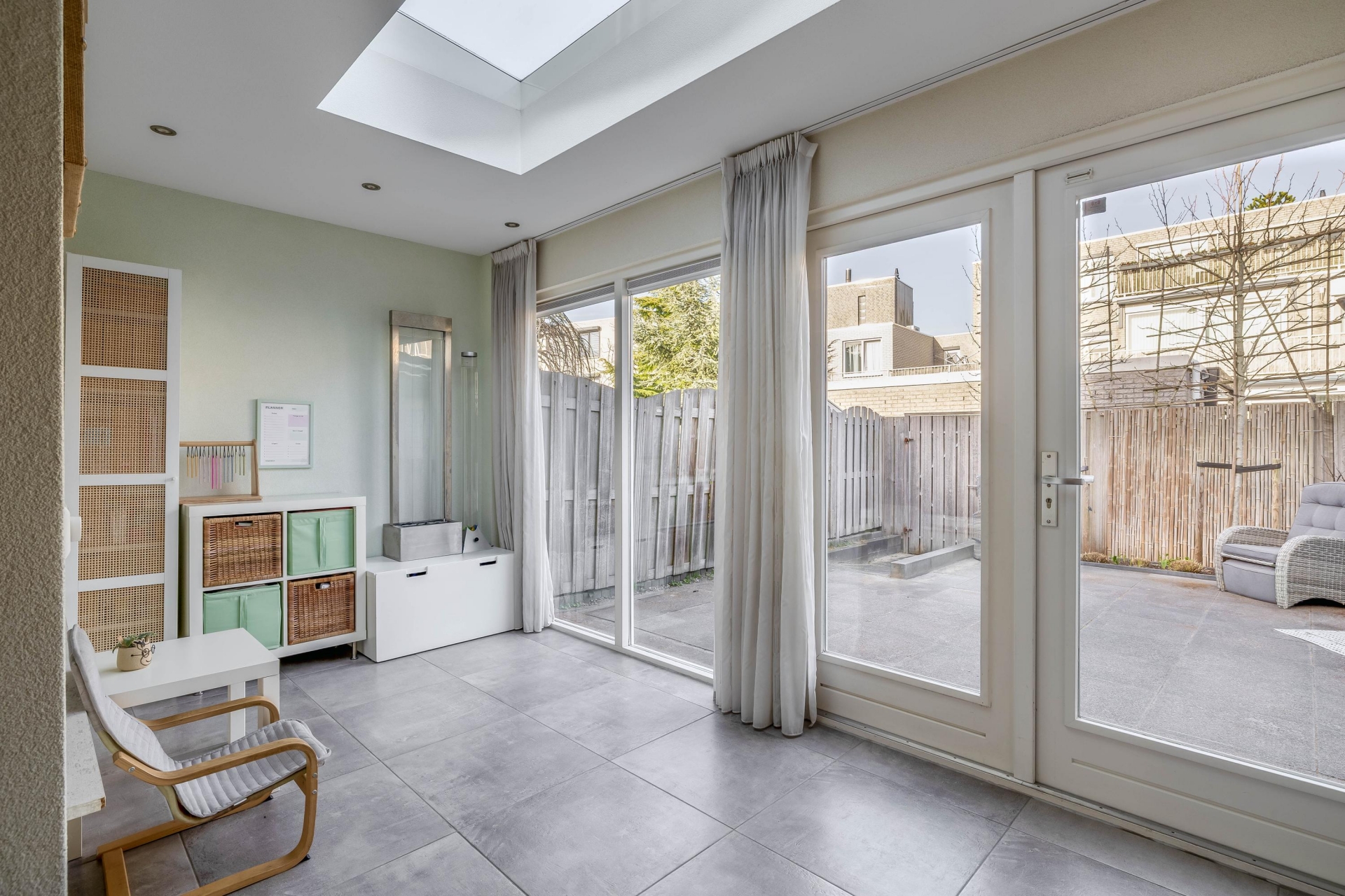 Aan de achterzijde bevindt zich de multifunctionele ruimte. Deze is nu in gebruik als extra kamer, maar kan net zo goed dienen als werkplek, speelkamer of hobbyruimte. Dankzij de openslaande deuren naar de tuin is dit een fijne, lichte plek in huis.