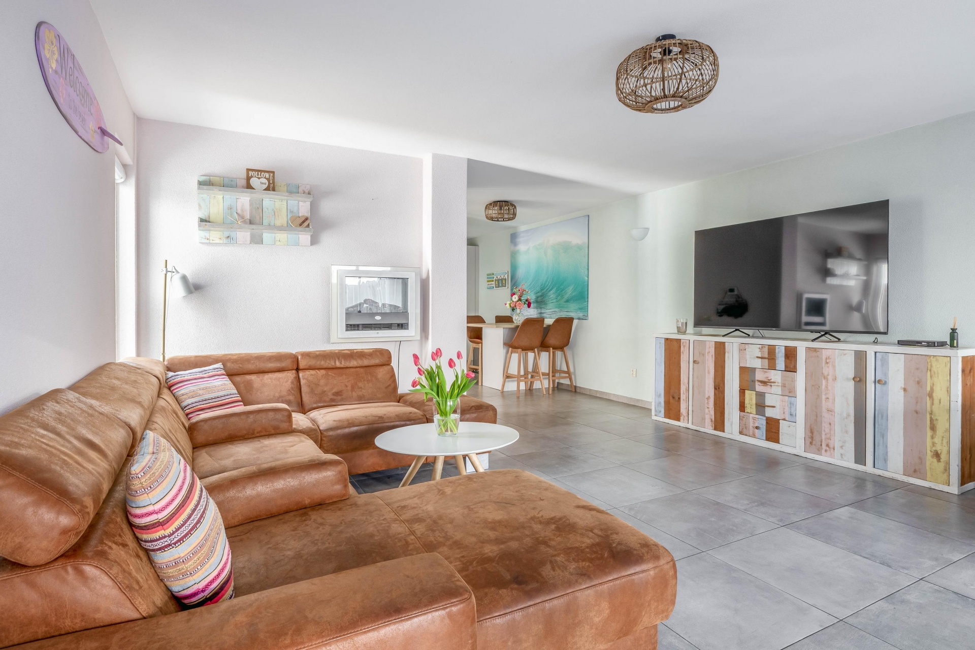 Je komt binnen in de hal met toilet, garderobe- en meterkast, waarna je doorloopt naar de ruime woonkamer. Dankzij de uitbouw aan de achterzijde is hier een heerlijke leefruimte ontstaan waar je met gemak een grote zithoek én een royale eettafel kwijt kunt. De lichtinval is prettig en de ruimte voelt open en comfortabel aan.