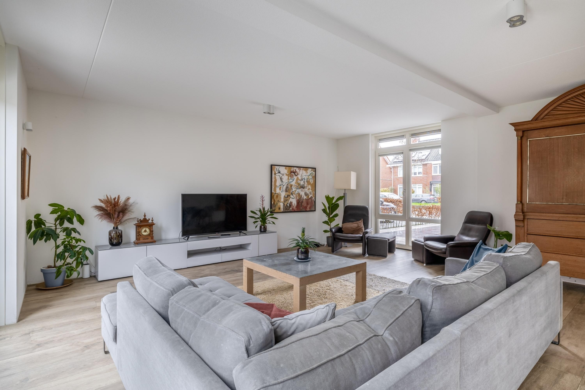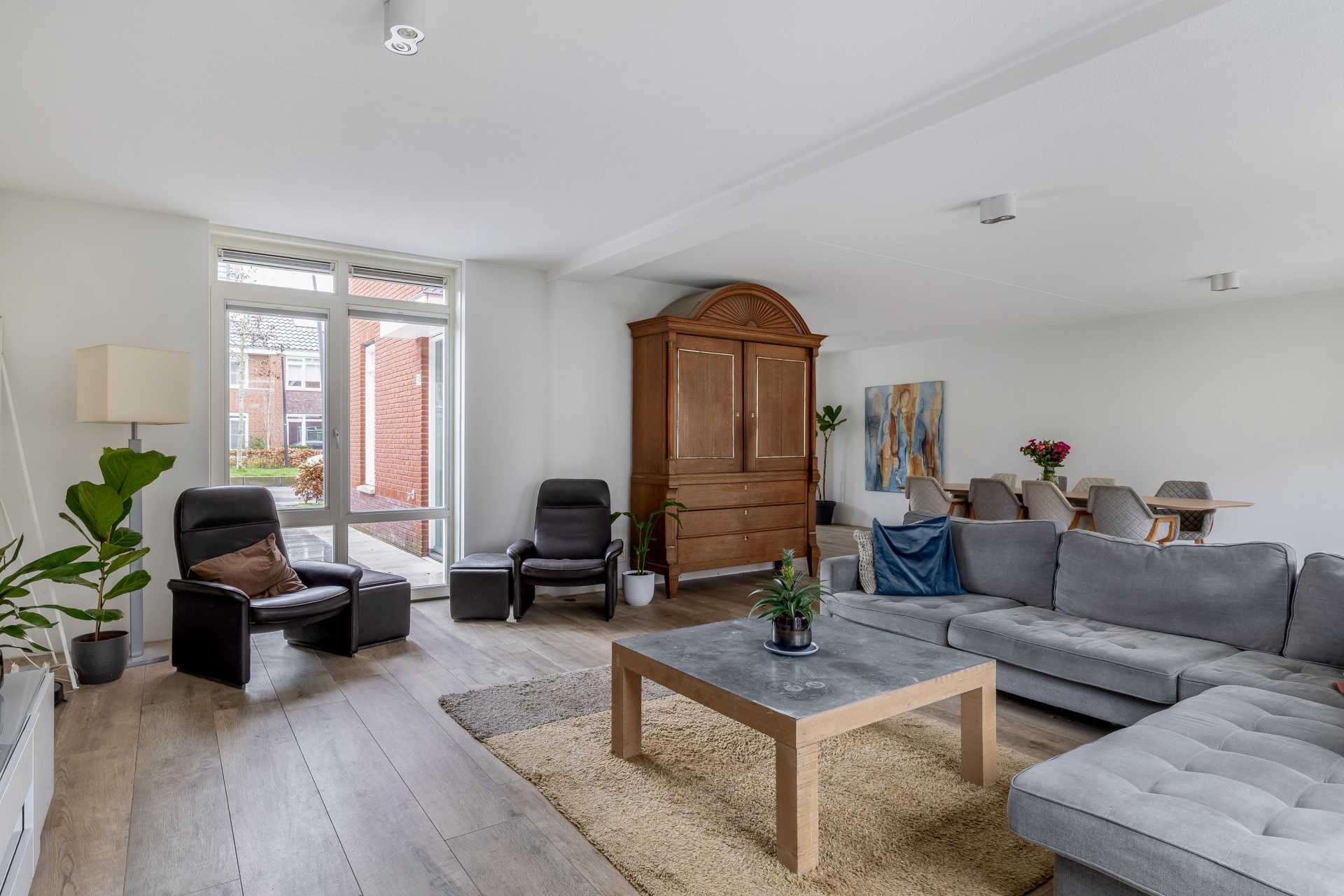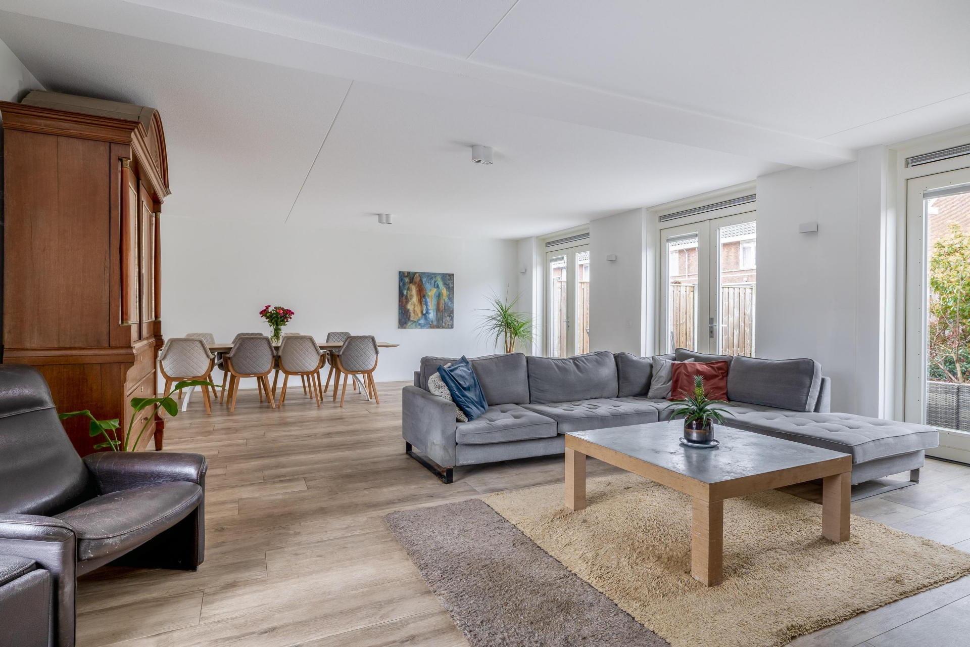 Zodra je binnenstapt valt direct de ruimte en het licht op. De woonkamer strekt zich breed uit over de volledige achterzijde en zijkant van het huis. Dankzij de grote raampartijen en openslaande deuren naar de tuin is dit een heerlijke plek waar binnen en buiten naadloos in elkaar overlopen.