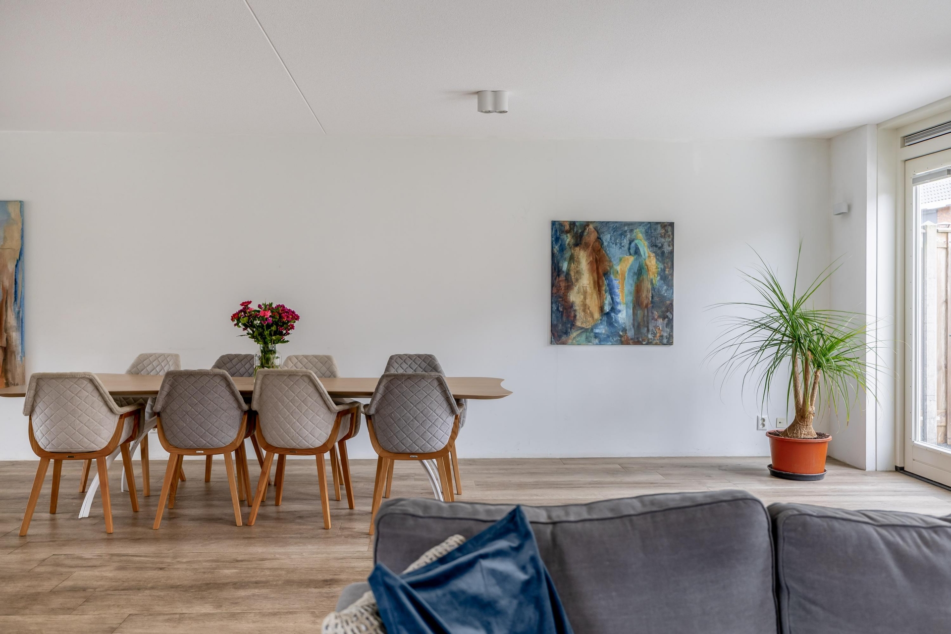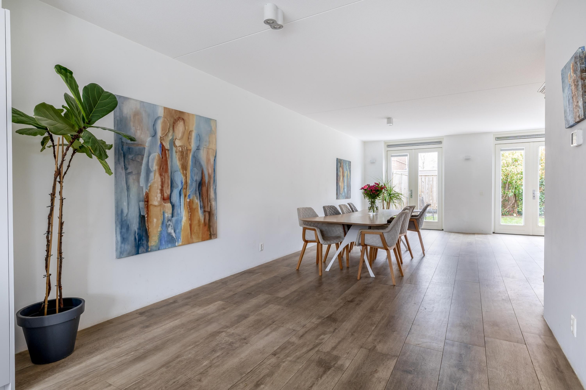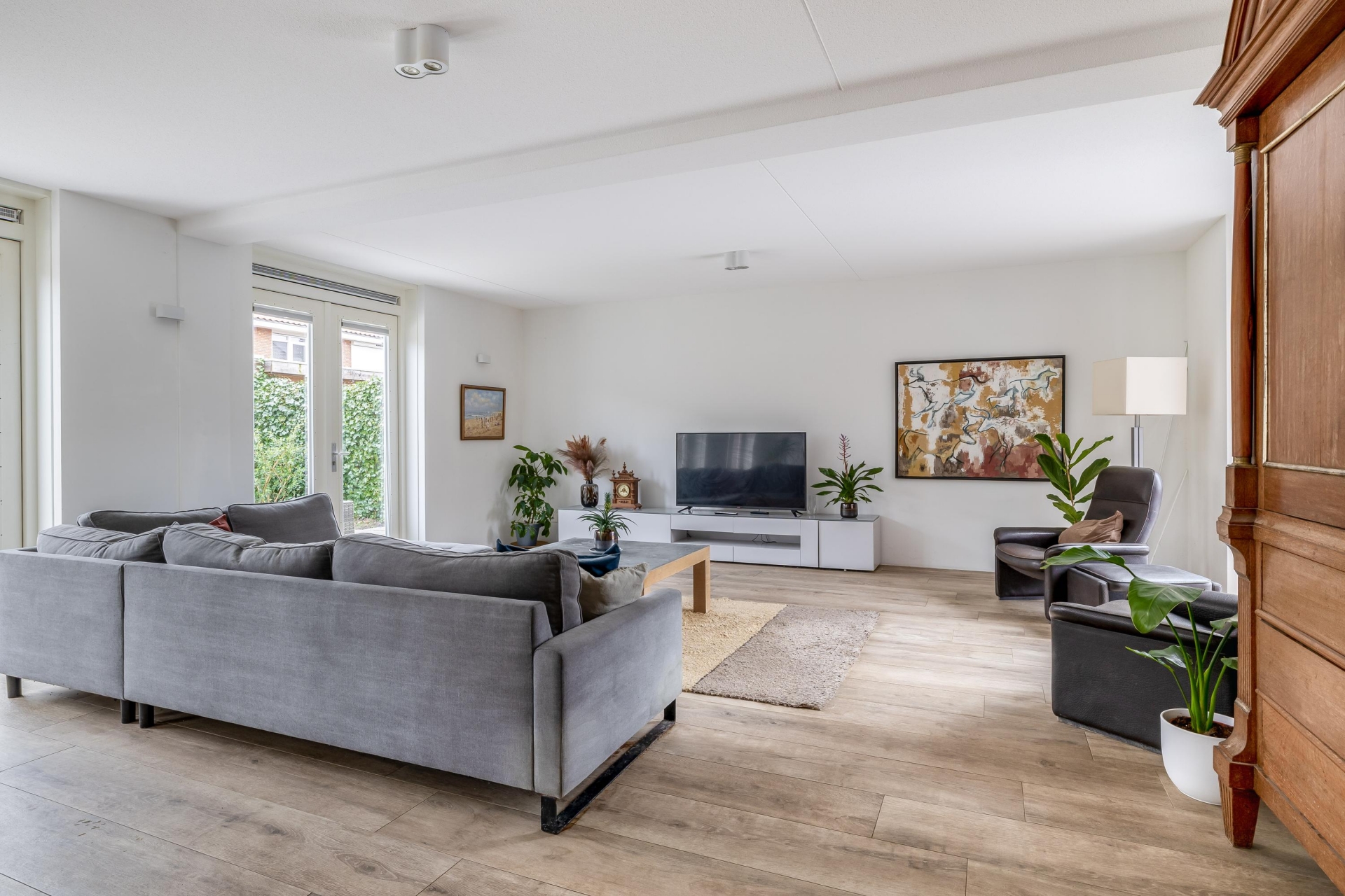 Zodra je binnenstapt valt direct de ruimte en het licht op. De woonkamer strekt zich breed uit over de volledige achterzijde en zijkant van het huis. Dankzij de grote raampartijen en openslaande deuren naar de tuin is dit een heerlijke plek waar binnen en buiten naadloos in elkaar overlopen.