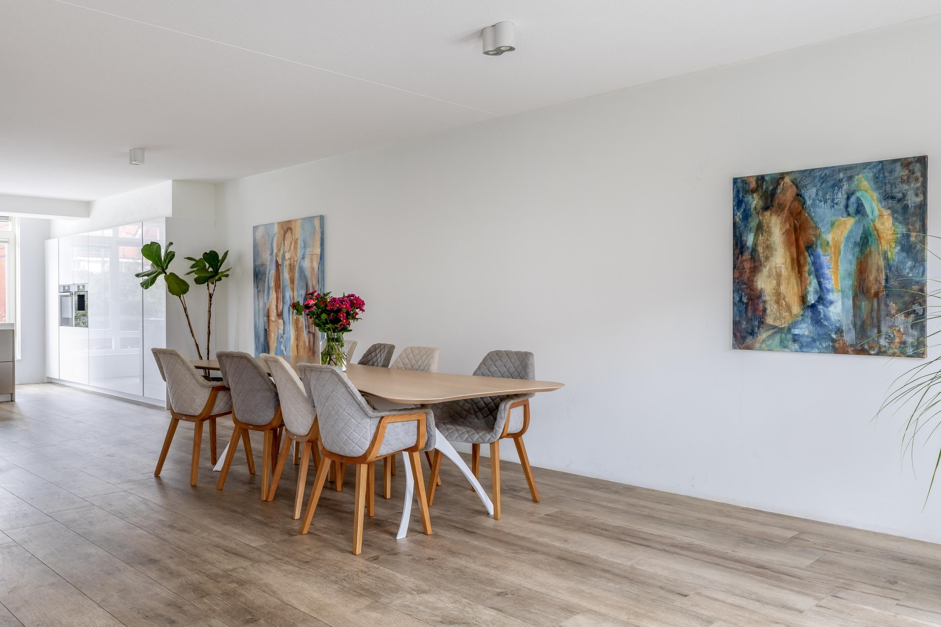 De houtlook keramische vloertegels in combinatie met vloerverwarming zorgen voor een strakke uitstraling én optimaal comfort. Dit is zo’n ruimte waar je met gemak met het hele gezin leeft, maar ook waar je vrienden uitnodigt zonder dat het ooit krap voelt.