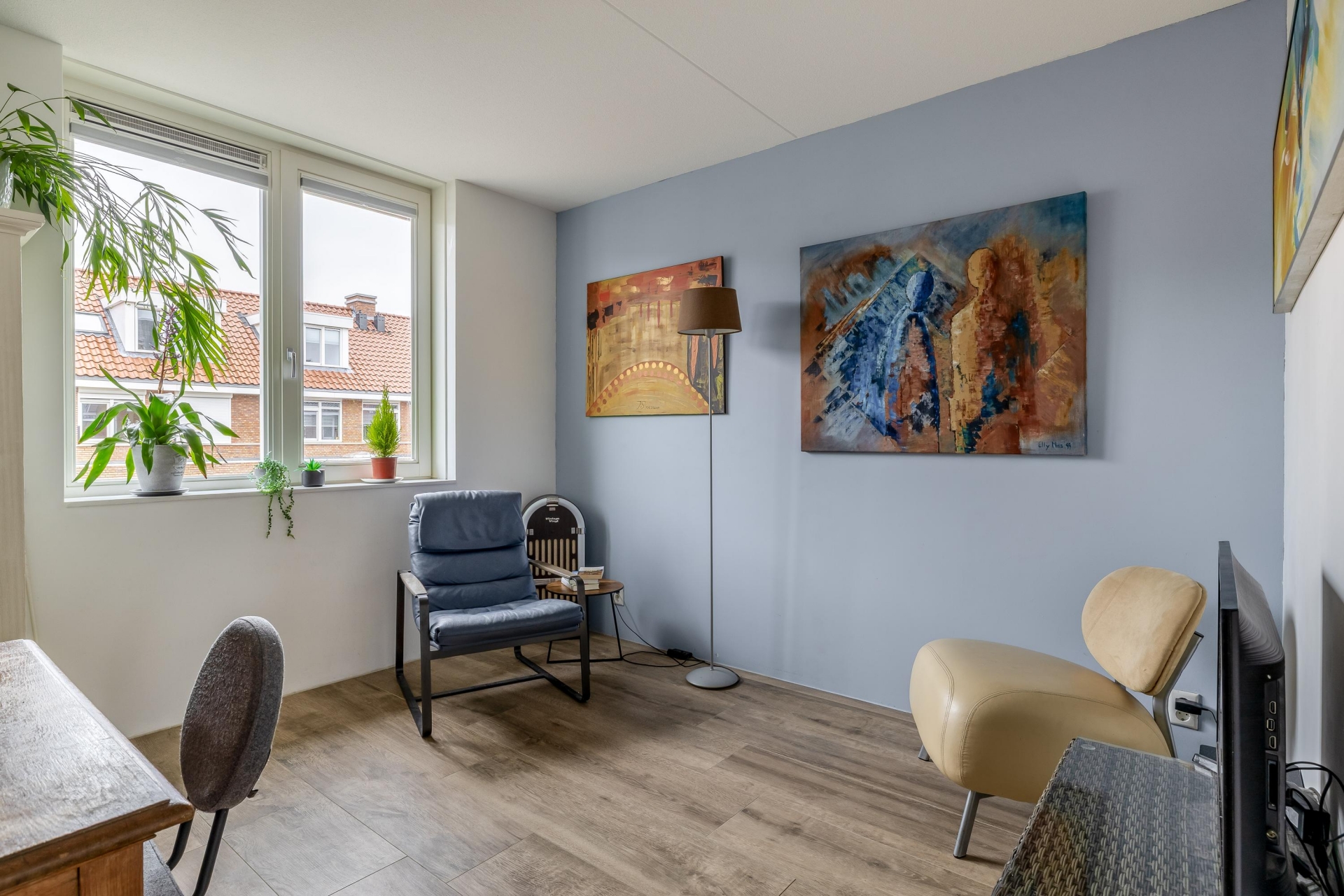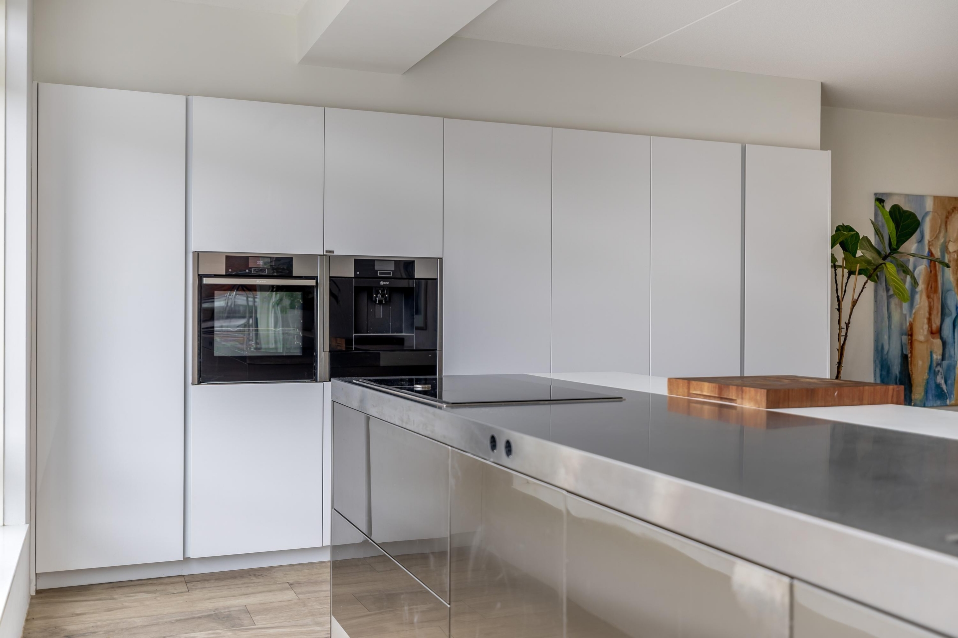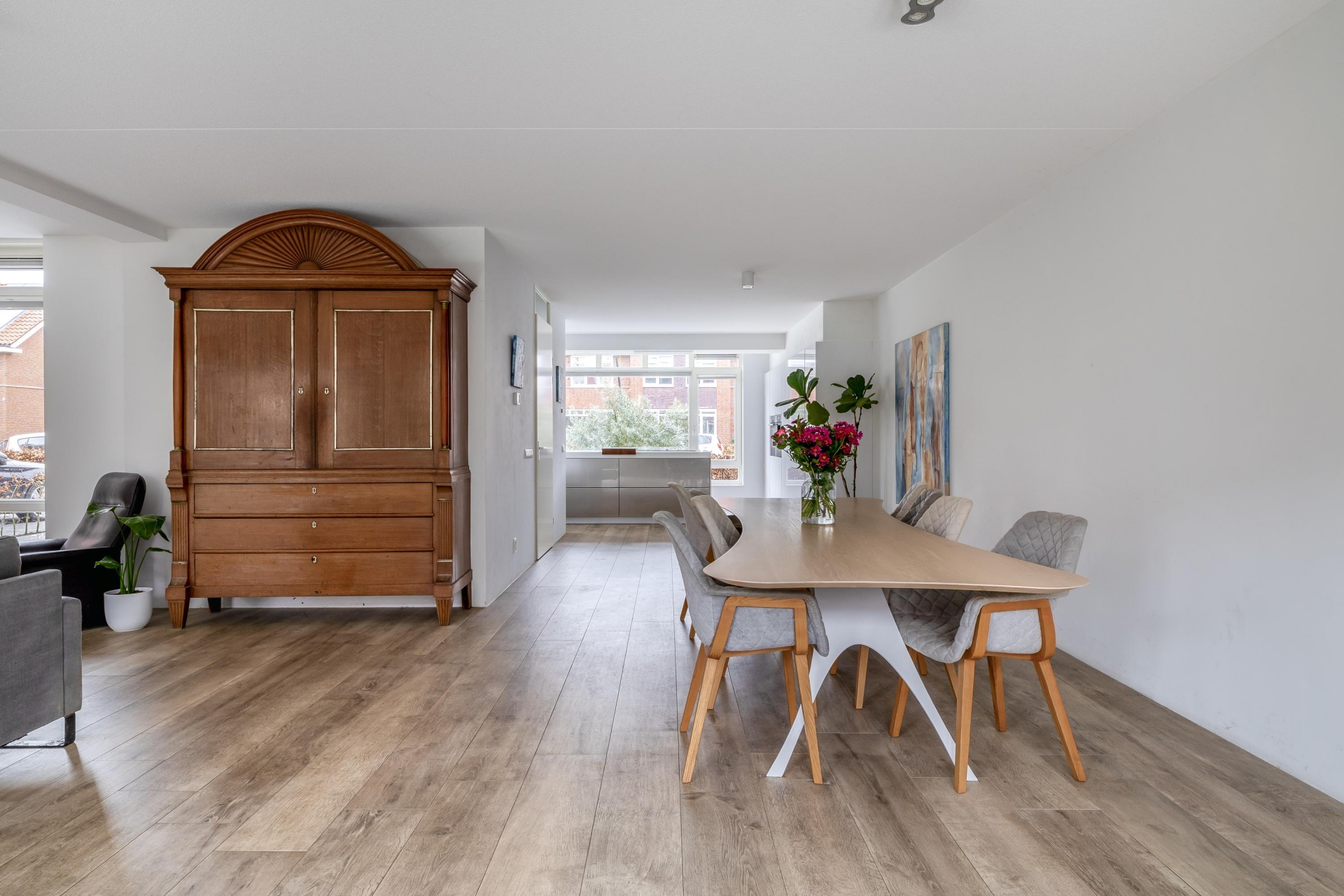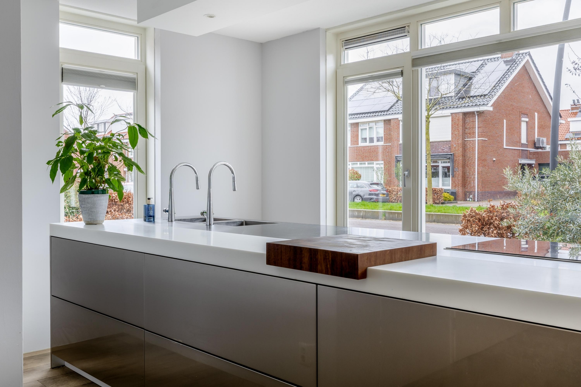 Met de brede raampartijen kijk je vrij weg over de straat, wat zorgt voor veel daglicht en een prettig gevoel van ruimte. De keuken is voorzien van diverse inbouwapparatuur en biedt volop werk- en bergruimte.