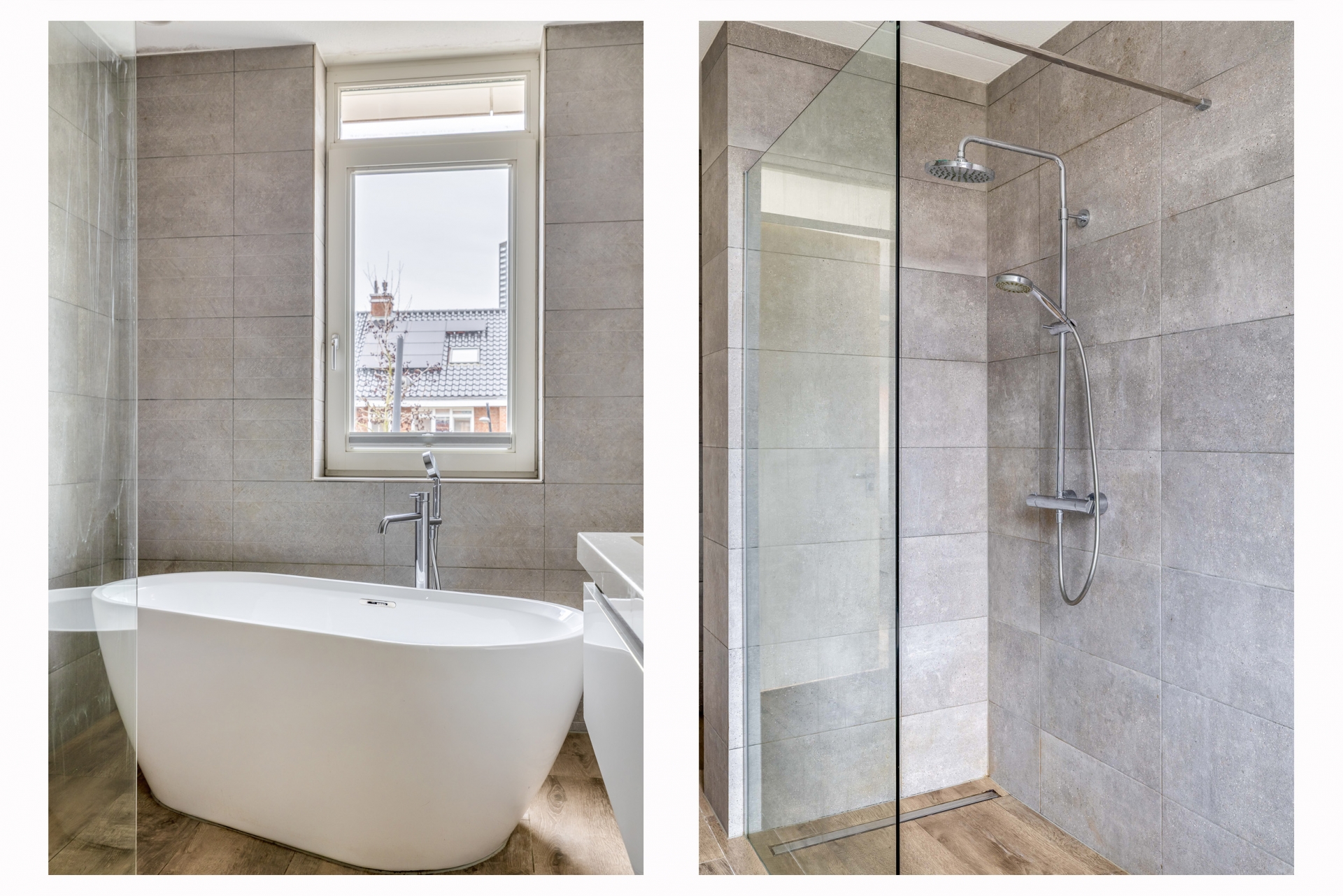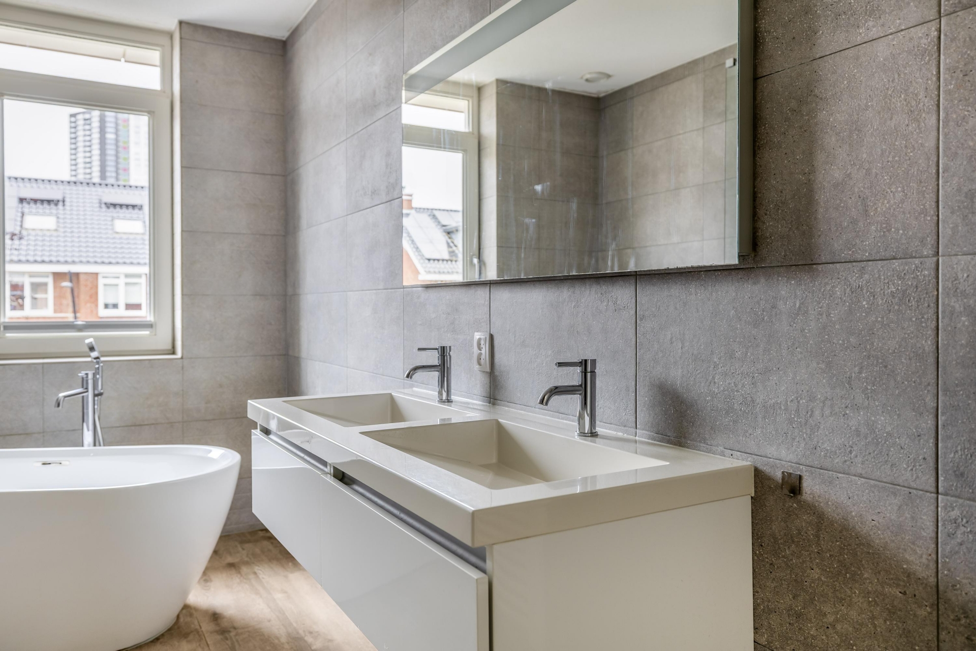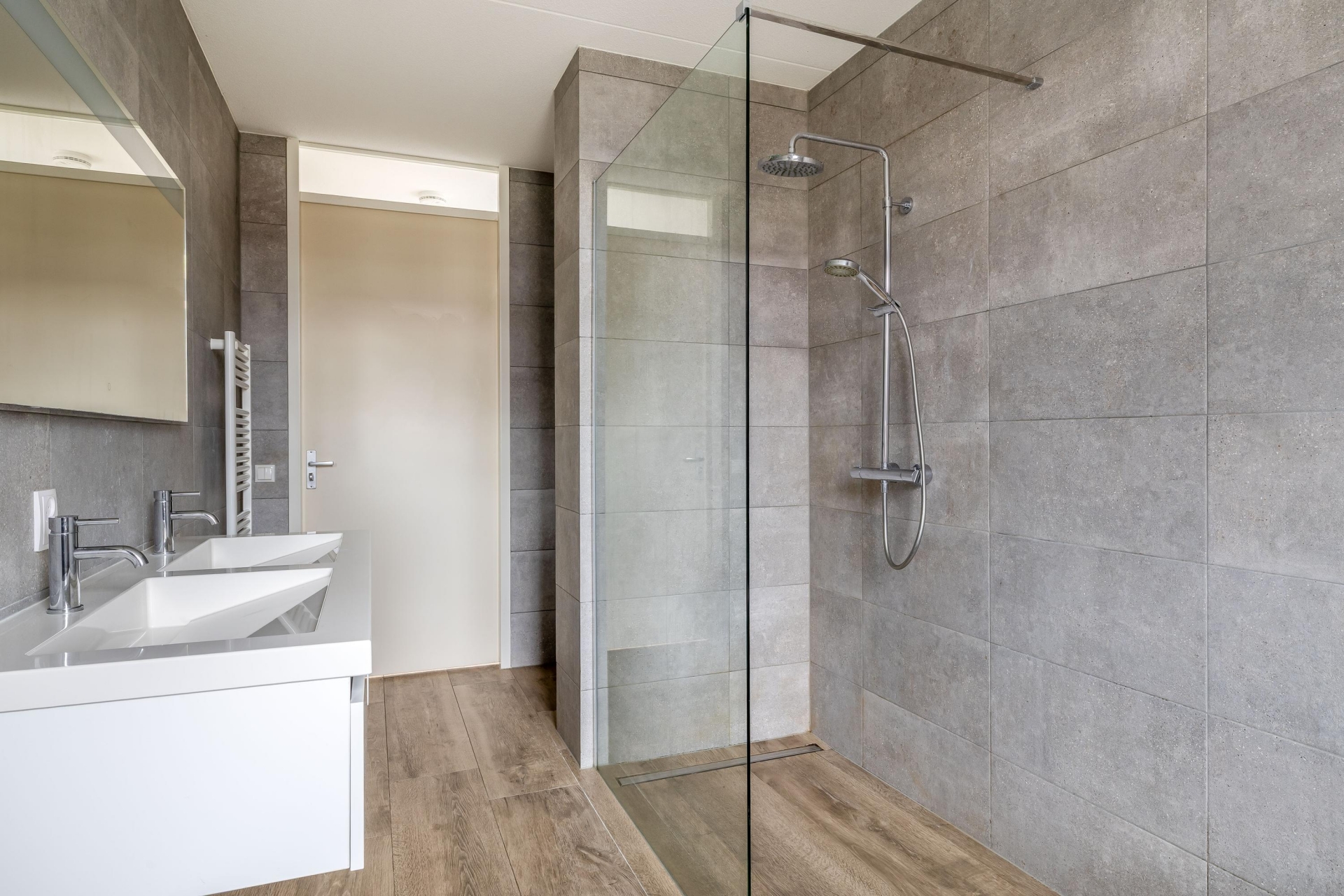 De badkamer is modern en compleet uitgevoerd met een ligbad, inloopdouche, dubbel wastafelmeubel en toilet. Ook hier is vloerverwarming aanwezig, wat het comfort compleet maakt.