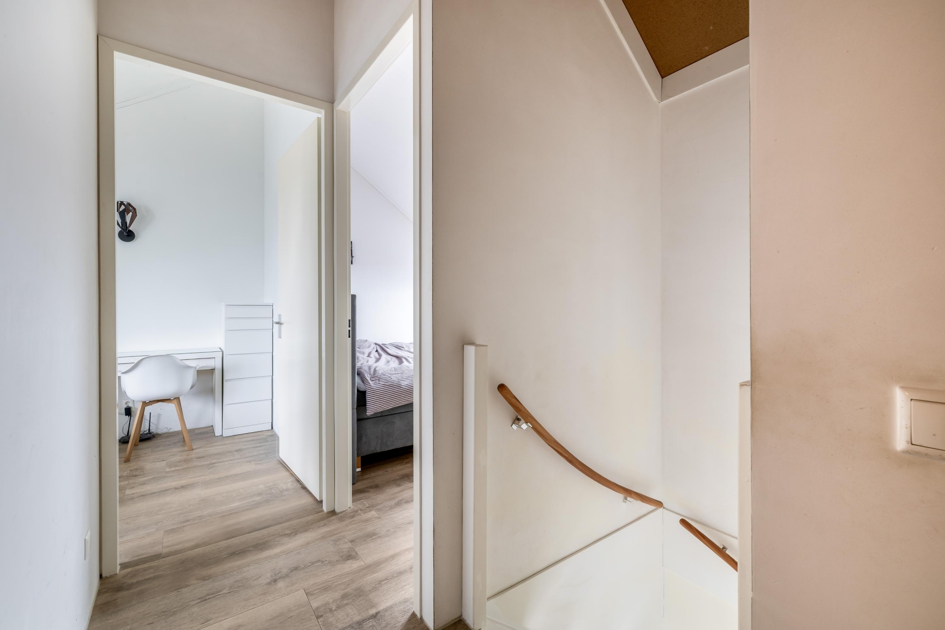 Op de eerste verdieping vind je drie ruime slaapkamers, stuk voor stuk netjes afgewerkt en goed in te delen. De grootste slaapkamer biedt volop ruimte voor een groot bed en kastenwand. De andere kamers zijn ideaal als kinder-, werk- of logeerkamer.