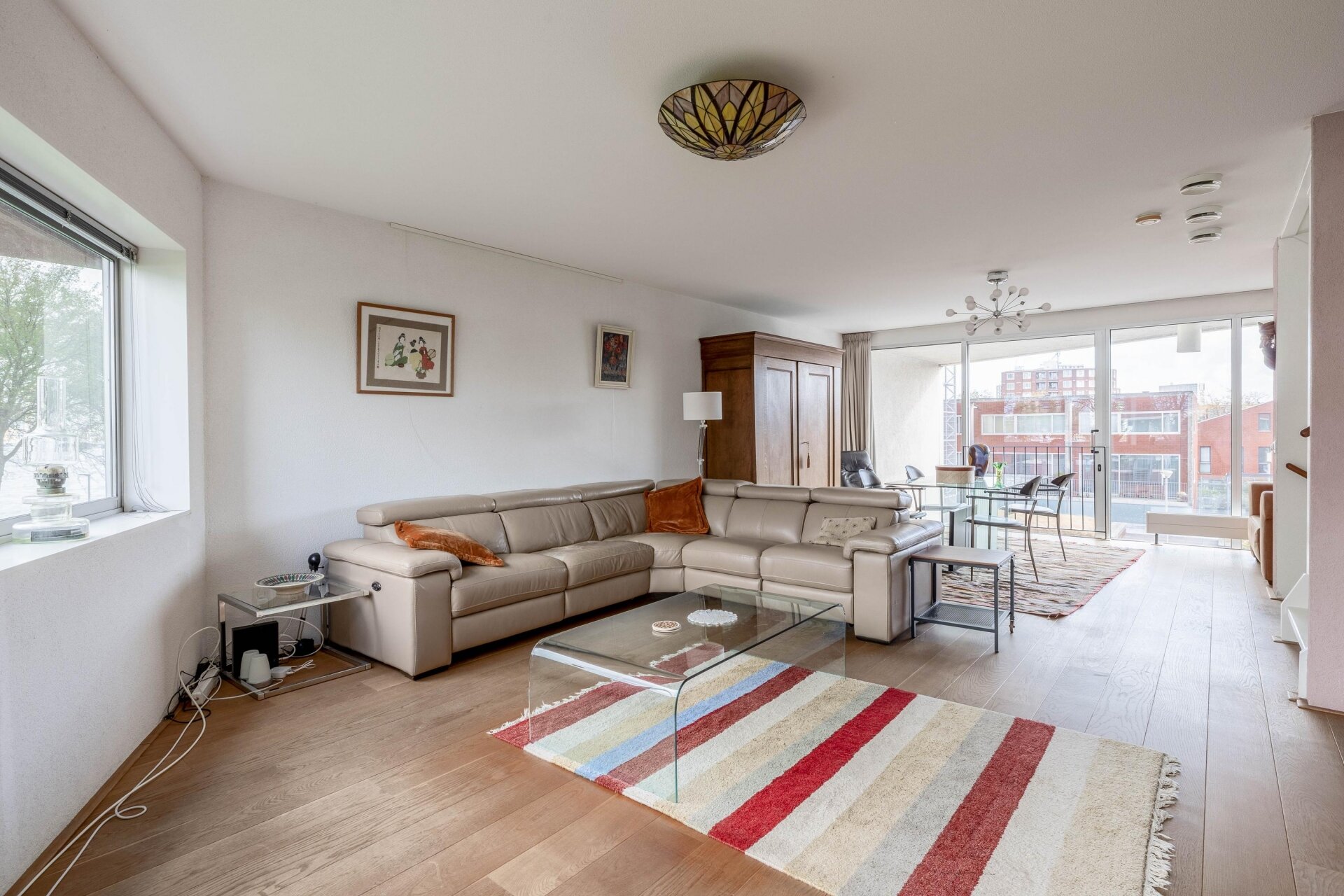 Een verdieping hoger vind je de woonkamer. Licht, ruim en door de grote raampartijen prachtig verbonden met buiten. Hier is plek voor een grote zithoek, een werkplek, kunst aan de wand, de ruimte werkt mee en voelt uitnodigend. Dit is een living die leeft.