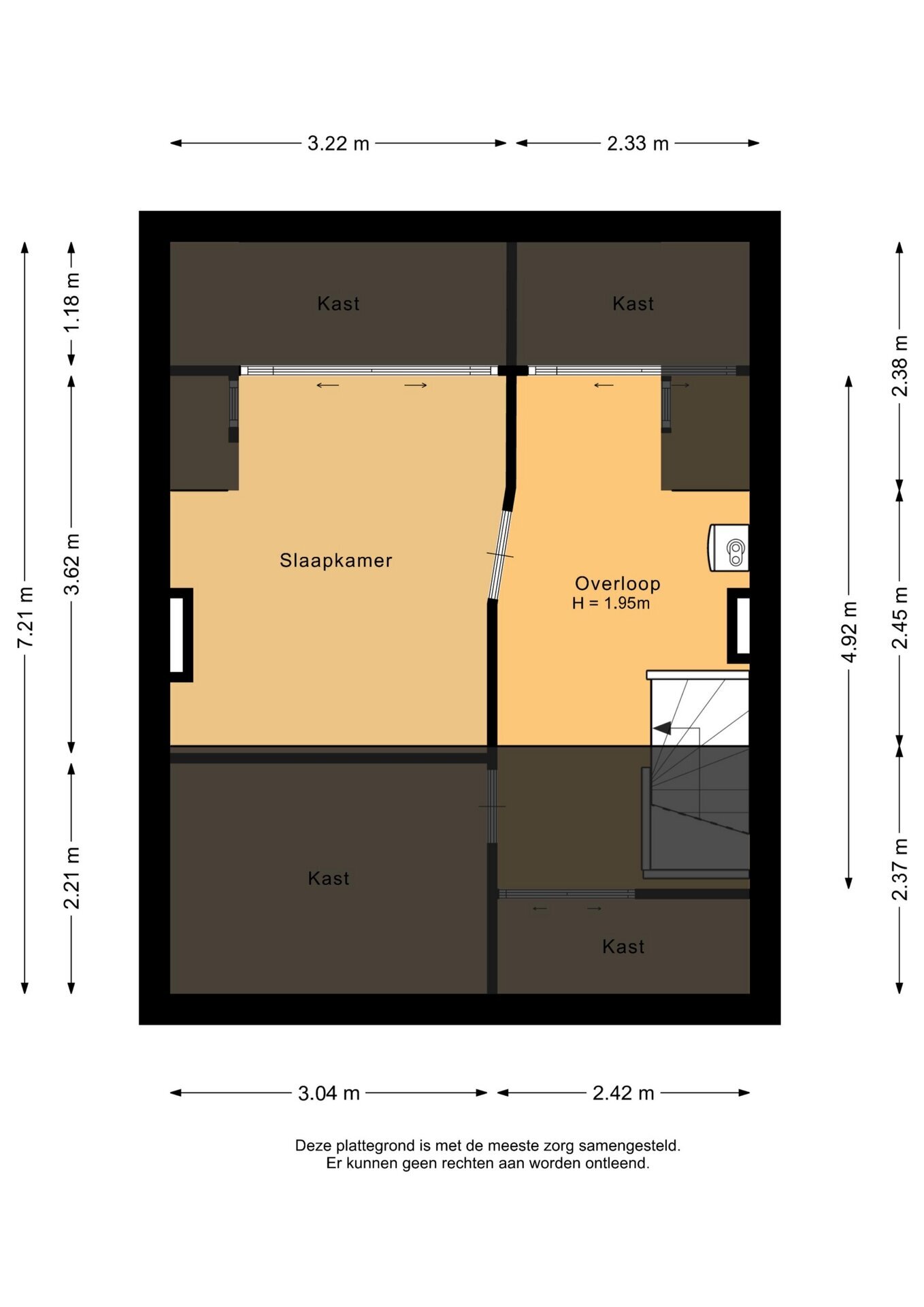 - De hoogte van de tweede verdieping is ca. 1,95 meter. Omdat de ruimte zich goed leent als woonruimte is de ruimte opgenomen in het genoemde woonoppervlak, ondanks het feit dat de meetinstructie een minimale hoogte van 2 meter eist.